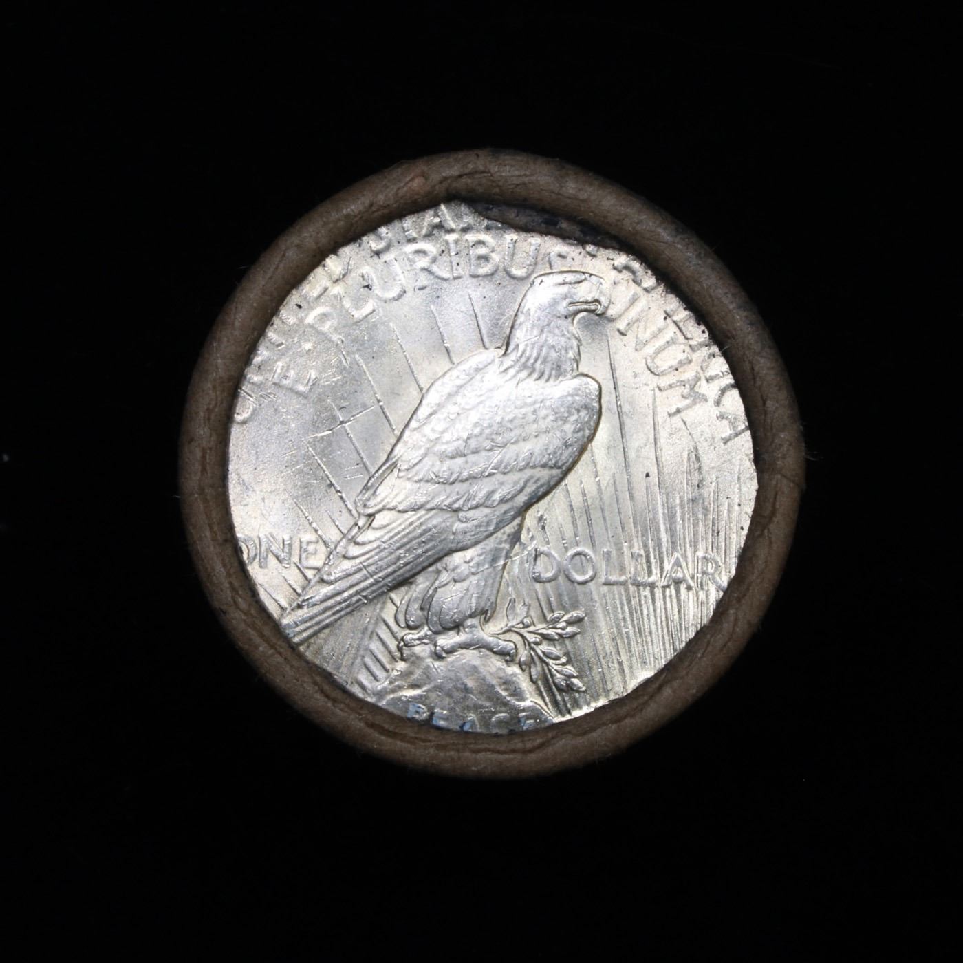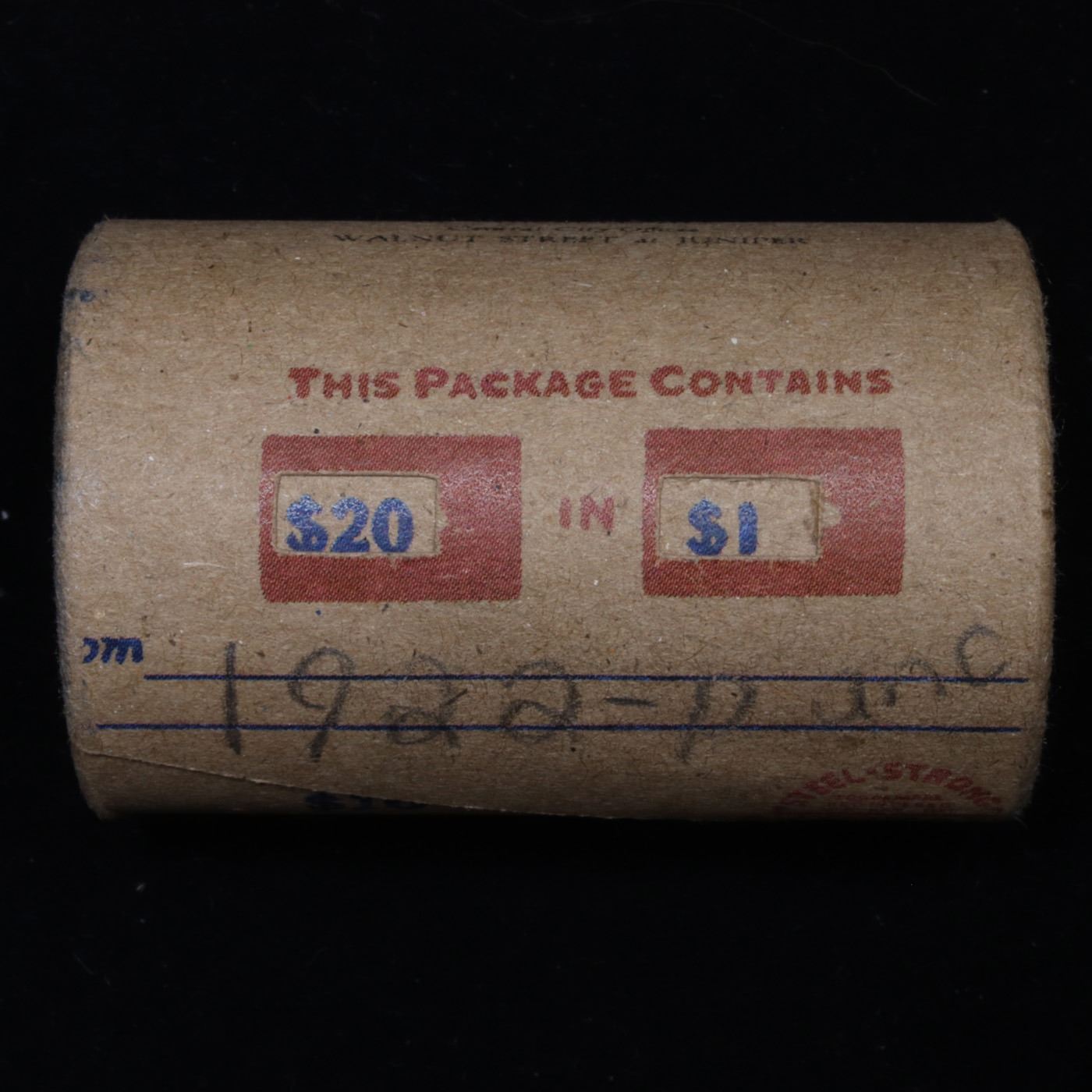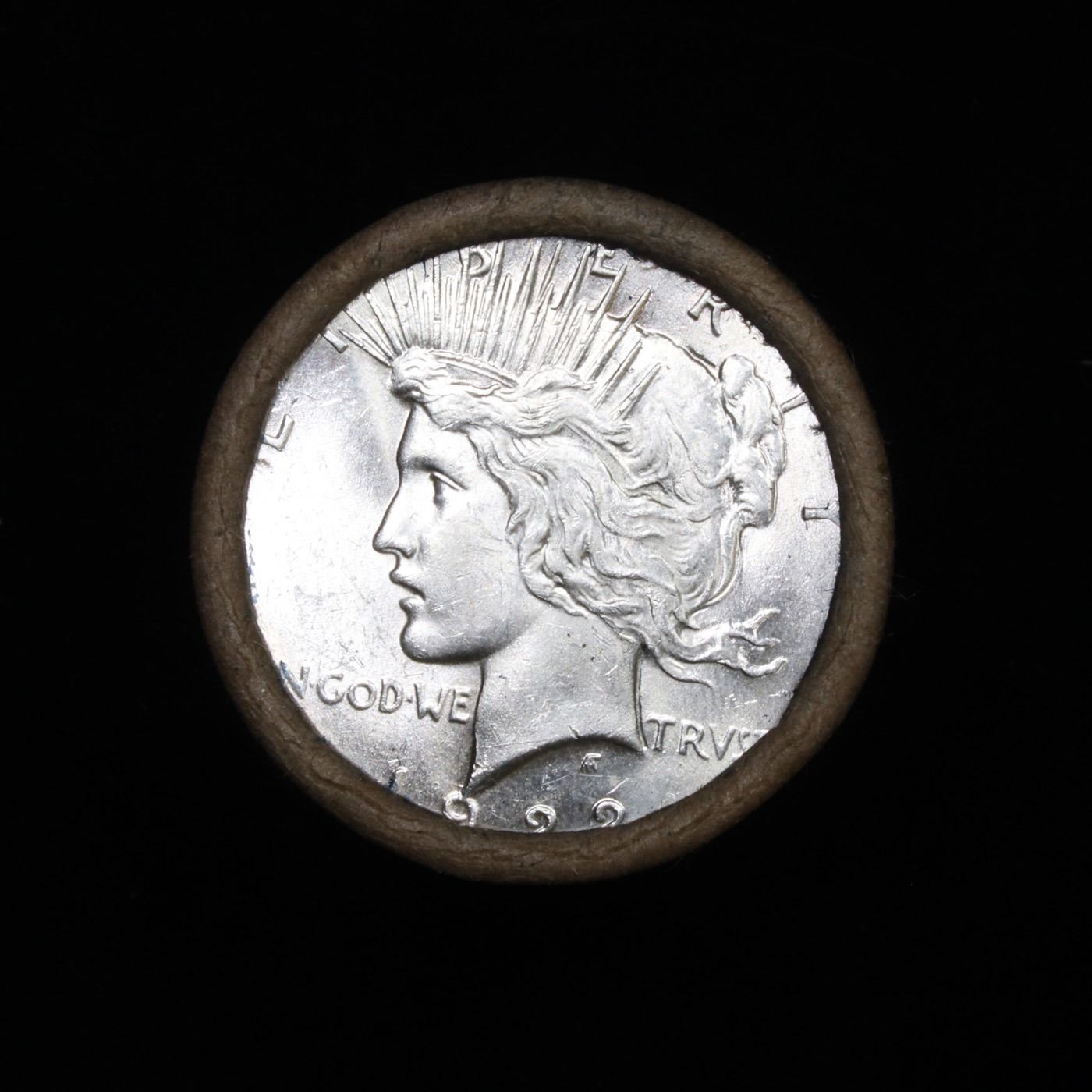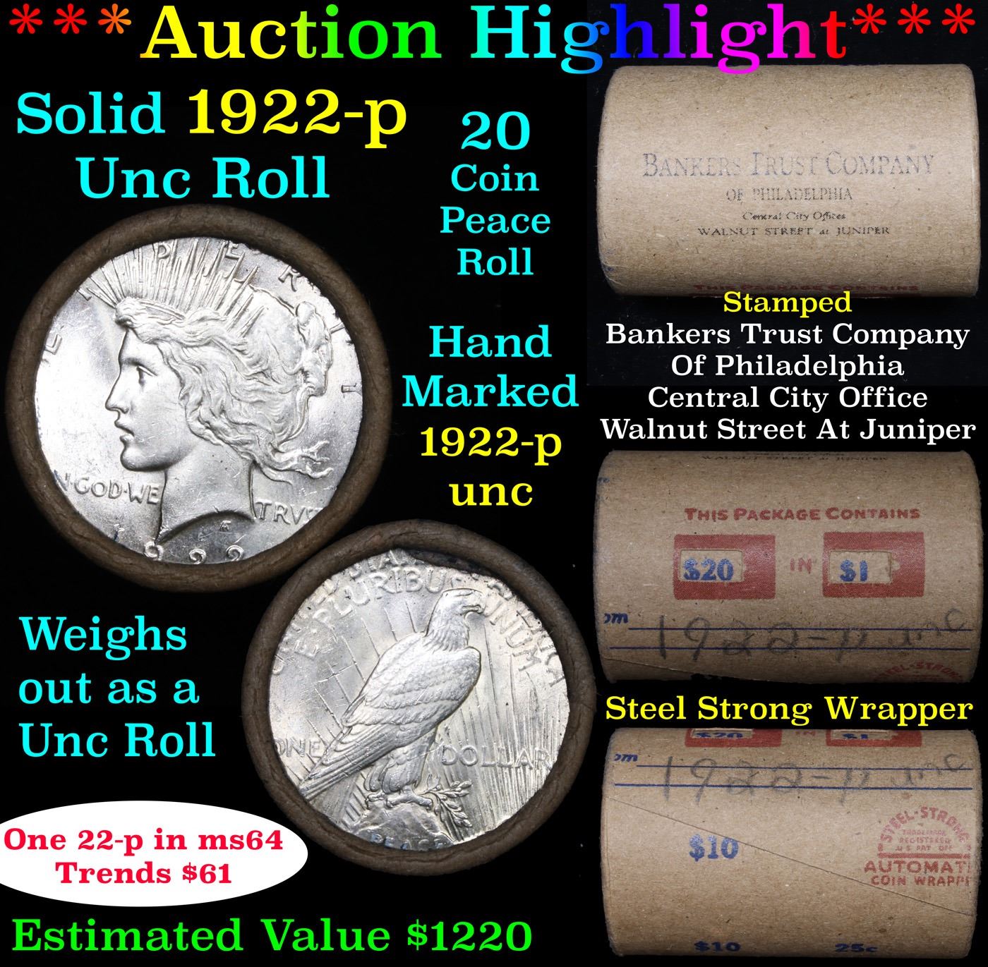 ***Auction Highlight*** 1922-p Uncirculated Peace Dollar Shotgun Roll. 1922-p Uncirculated Peace Dollar Shotgun Roll. This roll is held in an old Steel strong wrapper, patented 1921, stamped "Bankers Trust Company of Philadelphia, Walnut Street at Juniper. 1922-p Uncirculated Peace Dollar Roll, Superb Ends. Weighs Perfectly as an Uncirculated Roll. Trends in ms64 is $61 and ms63 is $53. One ms66 is $1600 and one ms67 is $19,800.