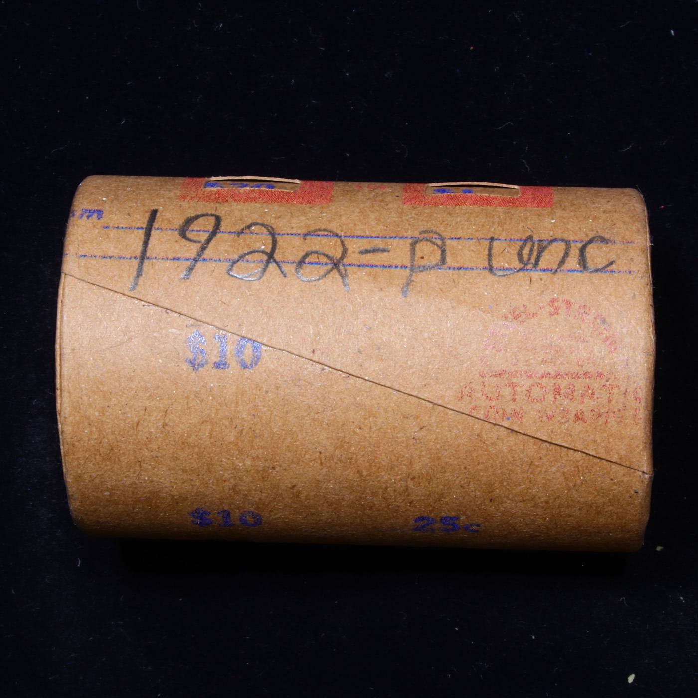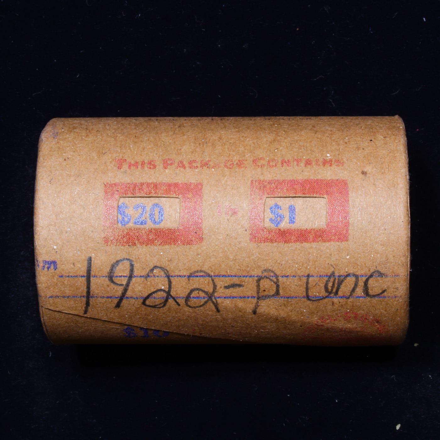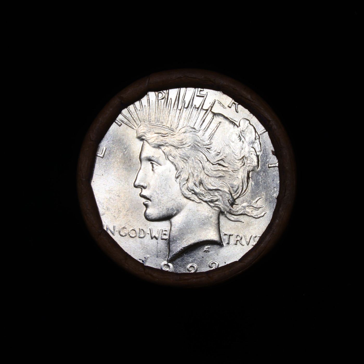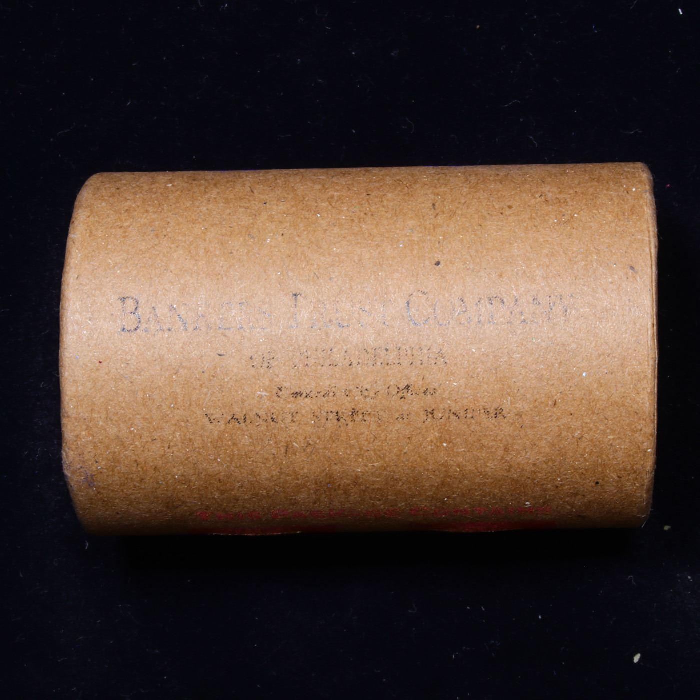 ***Auction Highlight*** 1922-p Uncirculated Peace Dollar Shotgun Roll.        This roll is held in an old Steel strong wrapper, patented 1921, stamped "Bankers Trust Company of Philadelphia, Walnut Street at Juniper. 1922-p Uncirculated Peace Dollar Roll. Weighs Perfectly as an Uncirculated Roll. Trends in ms64 is $60 and ms63 is $50. One ms66 is $1400 and one ms65 is $525.