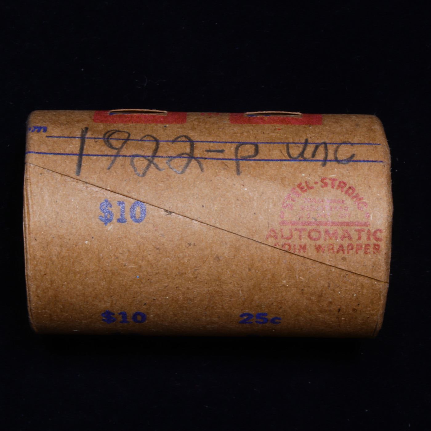 ***Auction Highlight*** 1922-p Uncirculated Peace Dollar Shotgun Roll. This roll is held in an old Steel strong wrapper, patented 1921, stamped "Bankers Trust Company of Philadelphia, Walnut Street at Juniper. 1922-p Uncirculated Peace Dollar Roll. Weighs Perfectly as an Uncirculated Roll. Trends in ms64 is $60 and ms63 is $50. One ms66 is $1400 and one ms65 is $525.