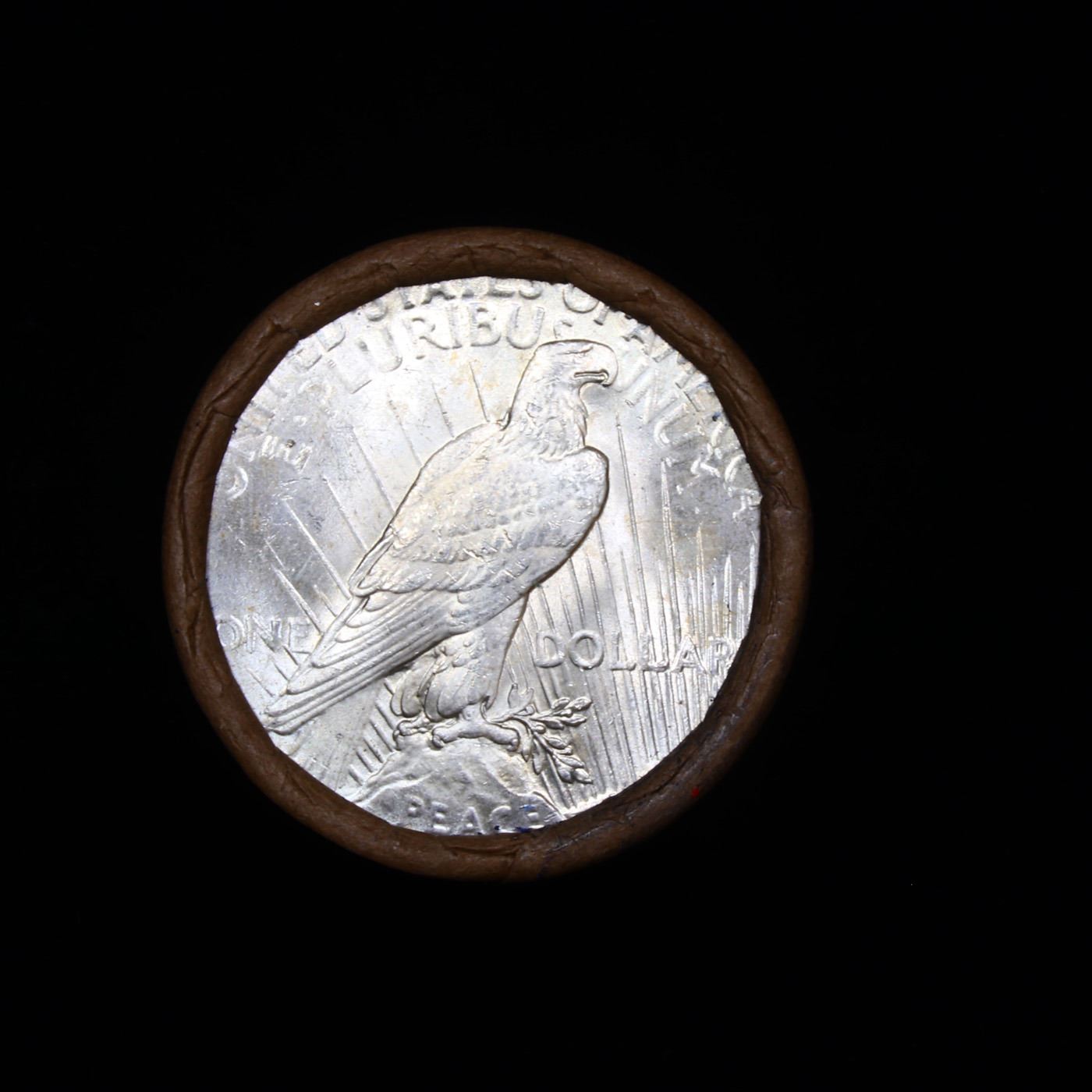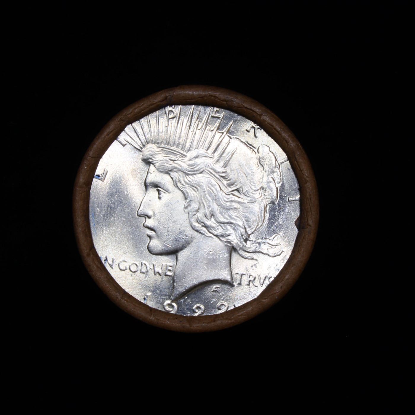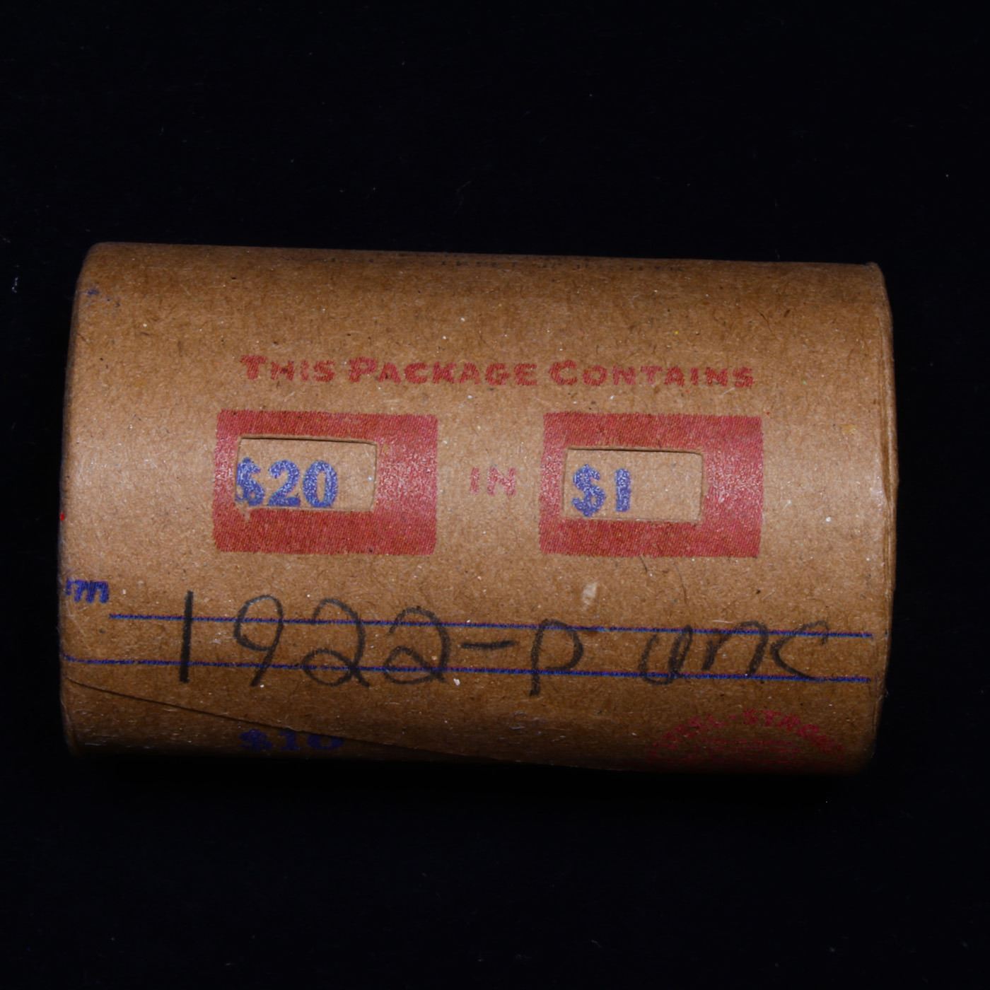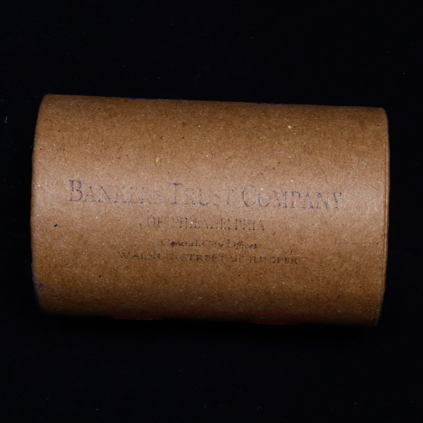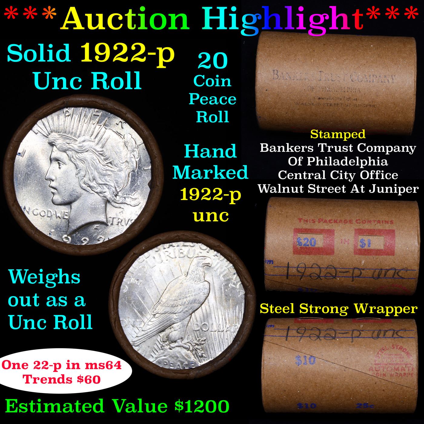 ***Auction Highlight*** 1922-p Uncirculated Peace Dollar Shotgun Roll. This roll is held in an old Steel strong wrapper, patented 1921, stamped "Bankers Trust Company of Philadelphia, Walnut Street at Juniper. 1922-p Uncirculated Peace Dollar Roll. Weighs Perfectly as an Uncirculated Roll. Trends in ms64 is $60 and ms63 is $50. One ms66 is $1400 and one ms65 is $525.