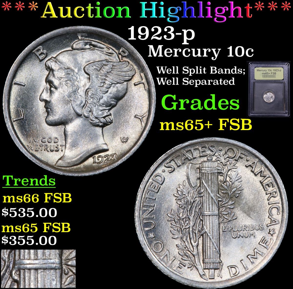 ***Auction Highlight*** 1923-p Mercury Dime 10c Graded GEM+ FSB By USCG. A Corey's Pick, Bid to Win Coin