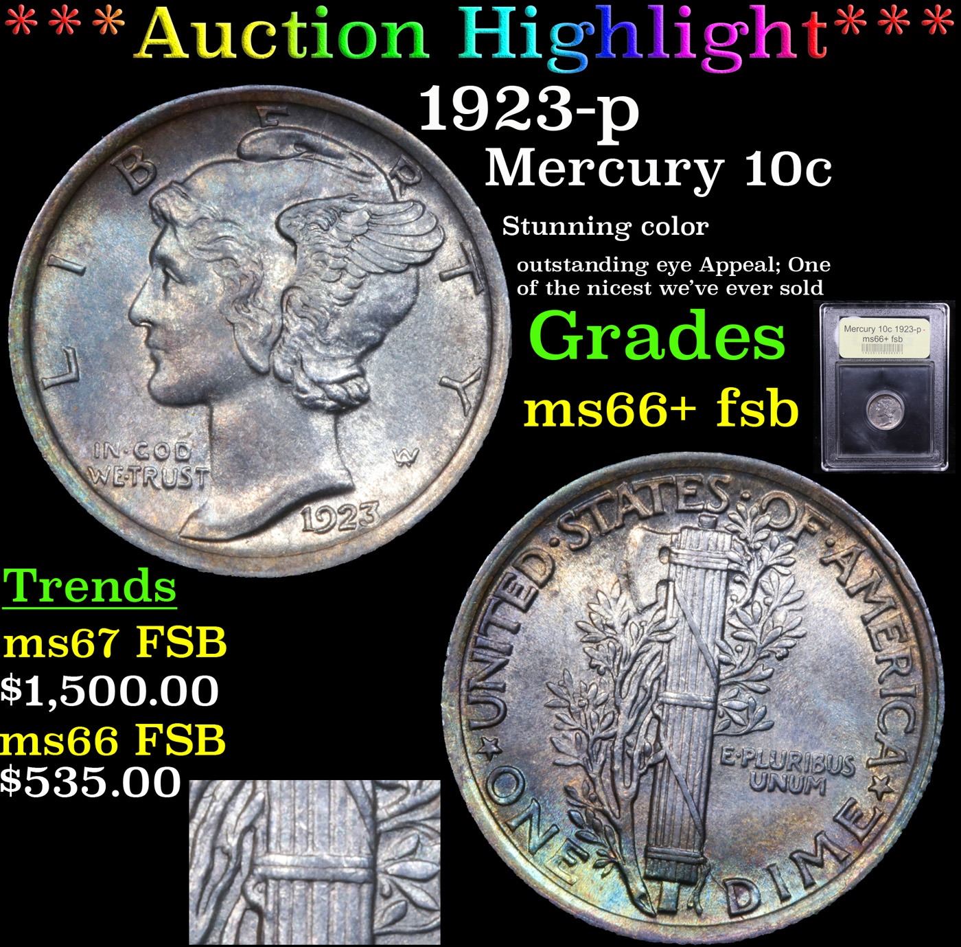 ***Auction Highlight*** 1923-p Mercury Dime 10c Graded GEM++ FSB By USCG. A Corey's Pick, Bid to Win Coin