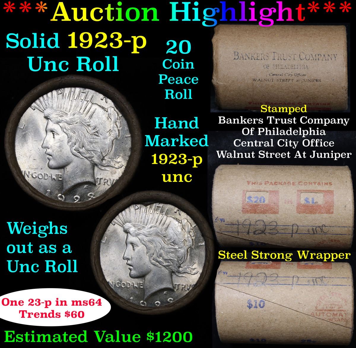 ***Auction Highlight*** 1923-p Uncirculated Peace Dollar Shotgun Roll. This roll is held in an old Steel strong wrapper, patented 1921, stamped "Bankers Trust Company of Philadelphia, Walnut Street at Juniper. 1923-p Uncirculated Peace Dollar Roll, lightly golden toned ends. Weighs Perfectly as an Uncirculated Roll. Trends lists ms64 at $60 and ms63 at $50.