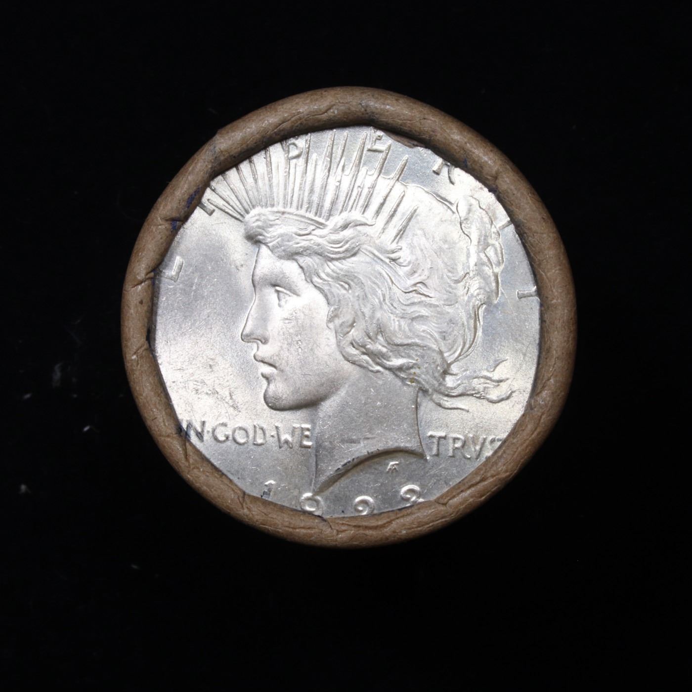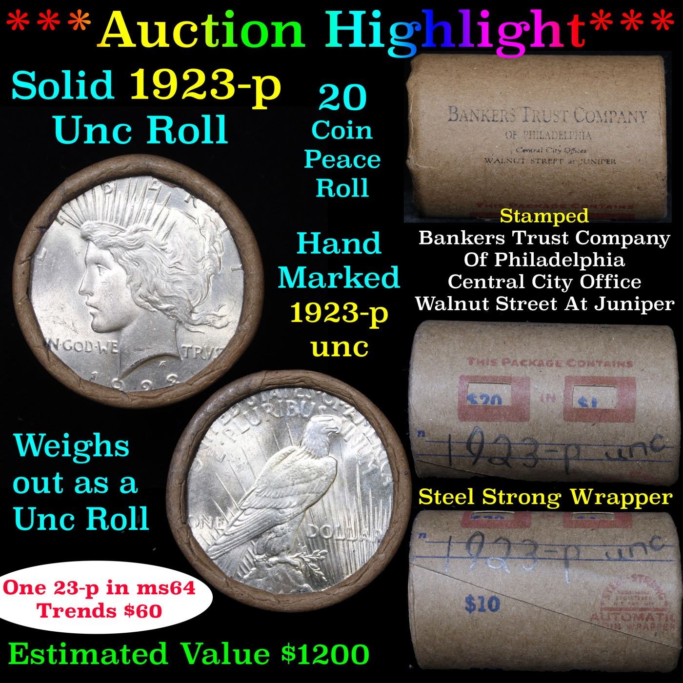 ***Auction Highlight*** 1923-p Uncirculated Peace Dollar Shotgun Roll. 1923-p Uncirculated Peace Dollar Shotgun Roll. This roll is held in an old Steel strong wrapper, patented 1921, stamped "Bankers Trust Company of Philadelphia, Walnut Street at Juniper. 1923-p Uncirculated Peace Dollar Roll, Superb Ends. Weighs Perfectly as an Uncirculated Roll. Trends in ms64 is $60 and ms63 is $50. One ms66 is $410 and one ms67 is $4,775.