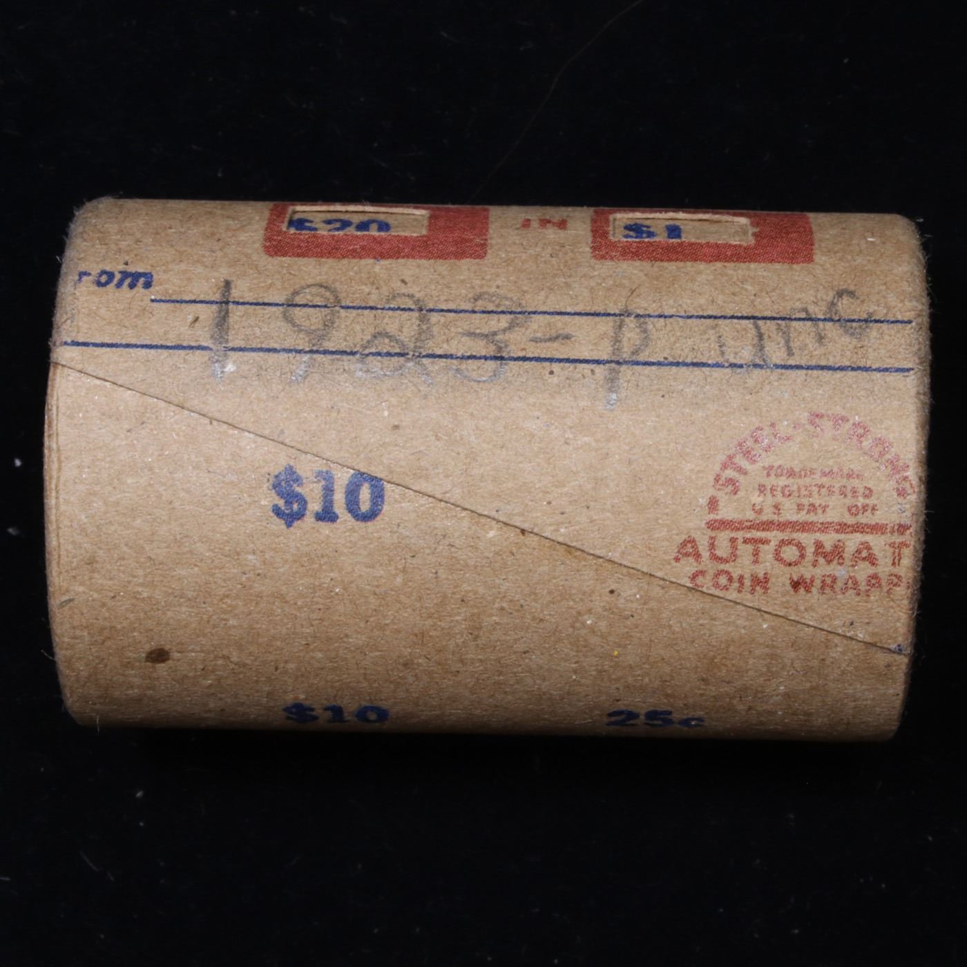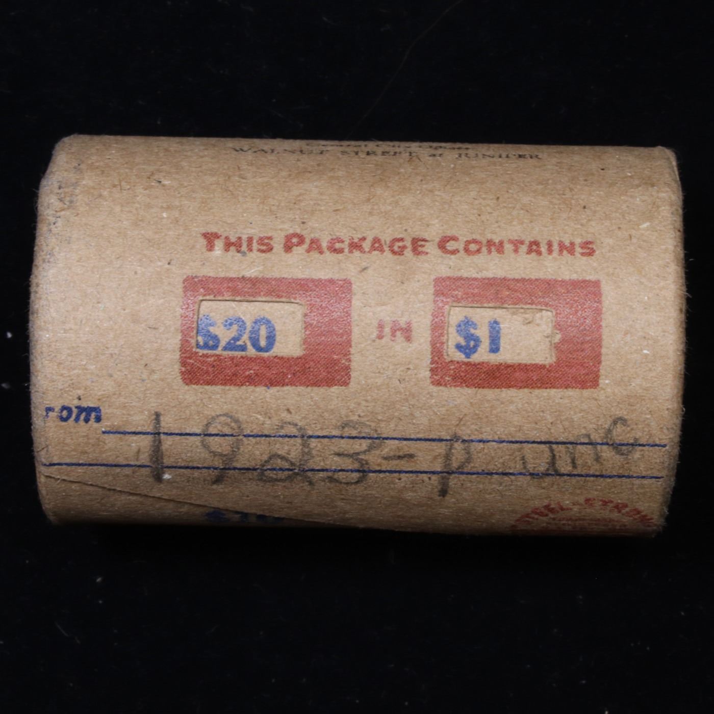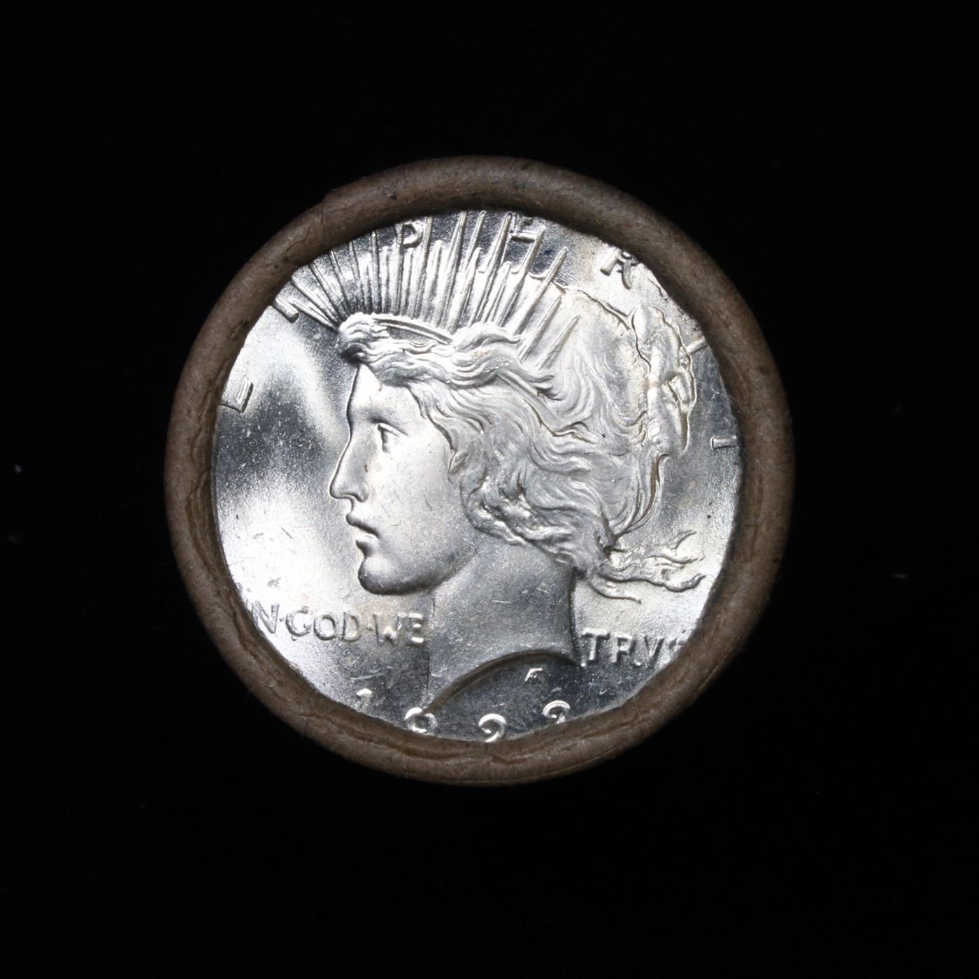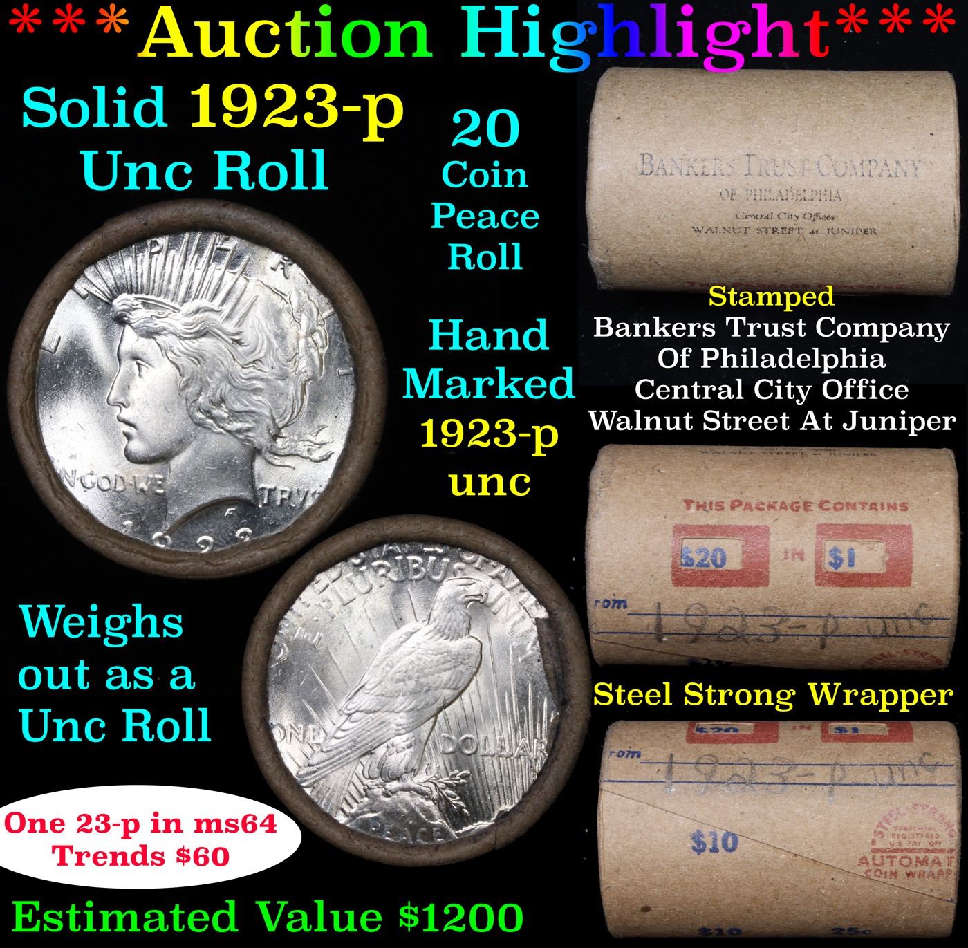 ***Auction Highlight*** 1923-p Uncirculated Peace Dollar Shotgun Roll. 1923-p Uncirculated Peace Dollar Shotgun Roll. This roll is held in an old Steel strong wrapper, patented 1921, stamped "Bankers Trust Company of Philadelphia, Walnut Street at Juniper. 1923-p Uncirculated Peace Dollar Roll, Superb Ends. Weighs Perfectly as an Uncirculated Roll. Trends in ms64 is $60 and ms63 is $50. One ms66 is $410 and one ms67 is $4,775.