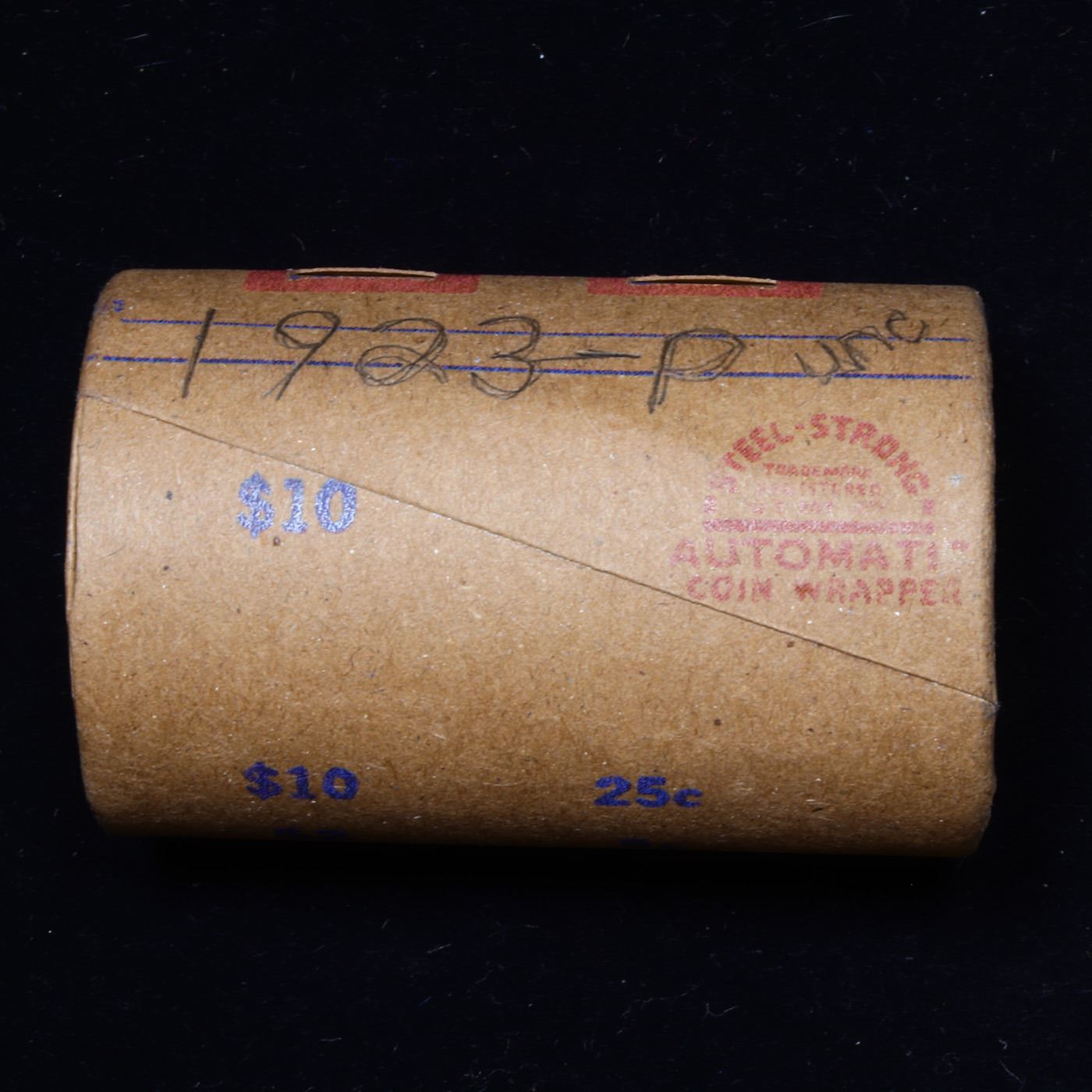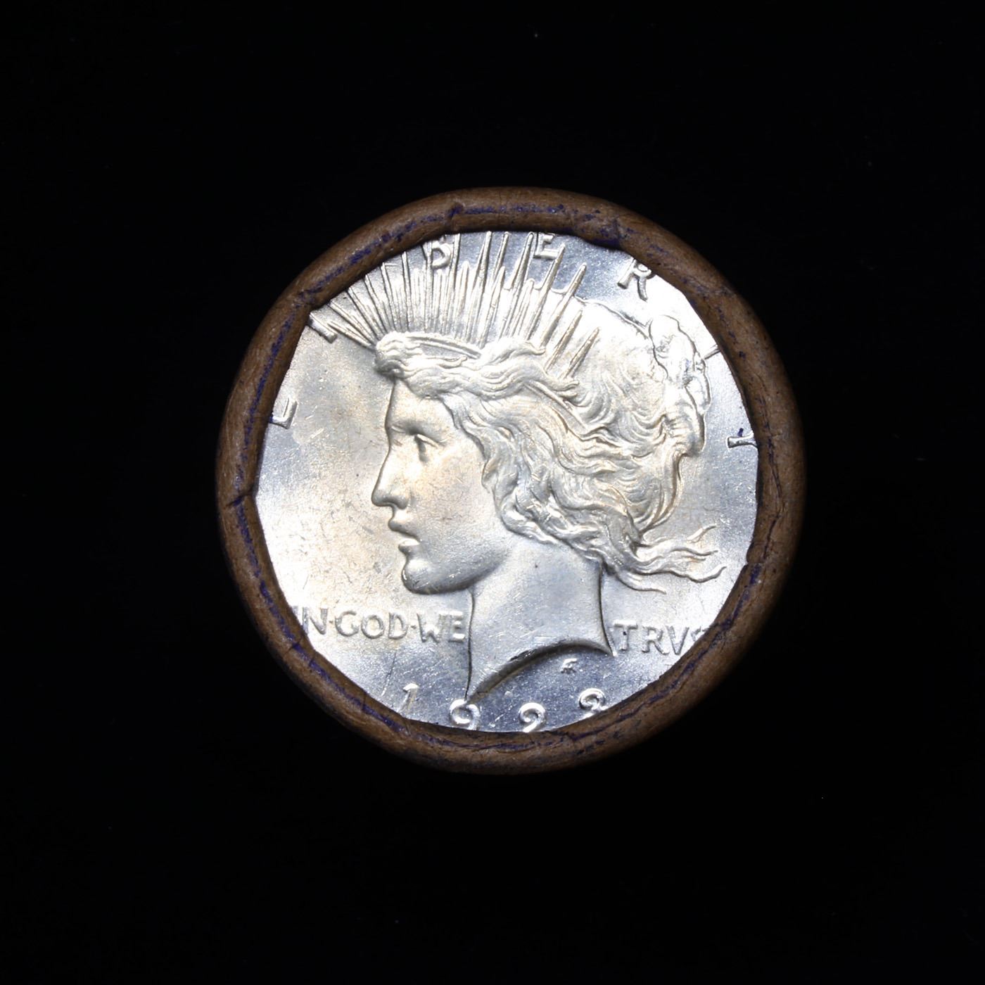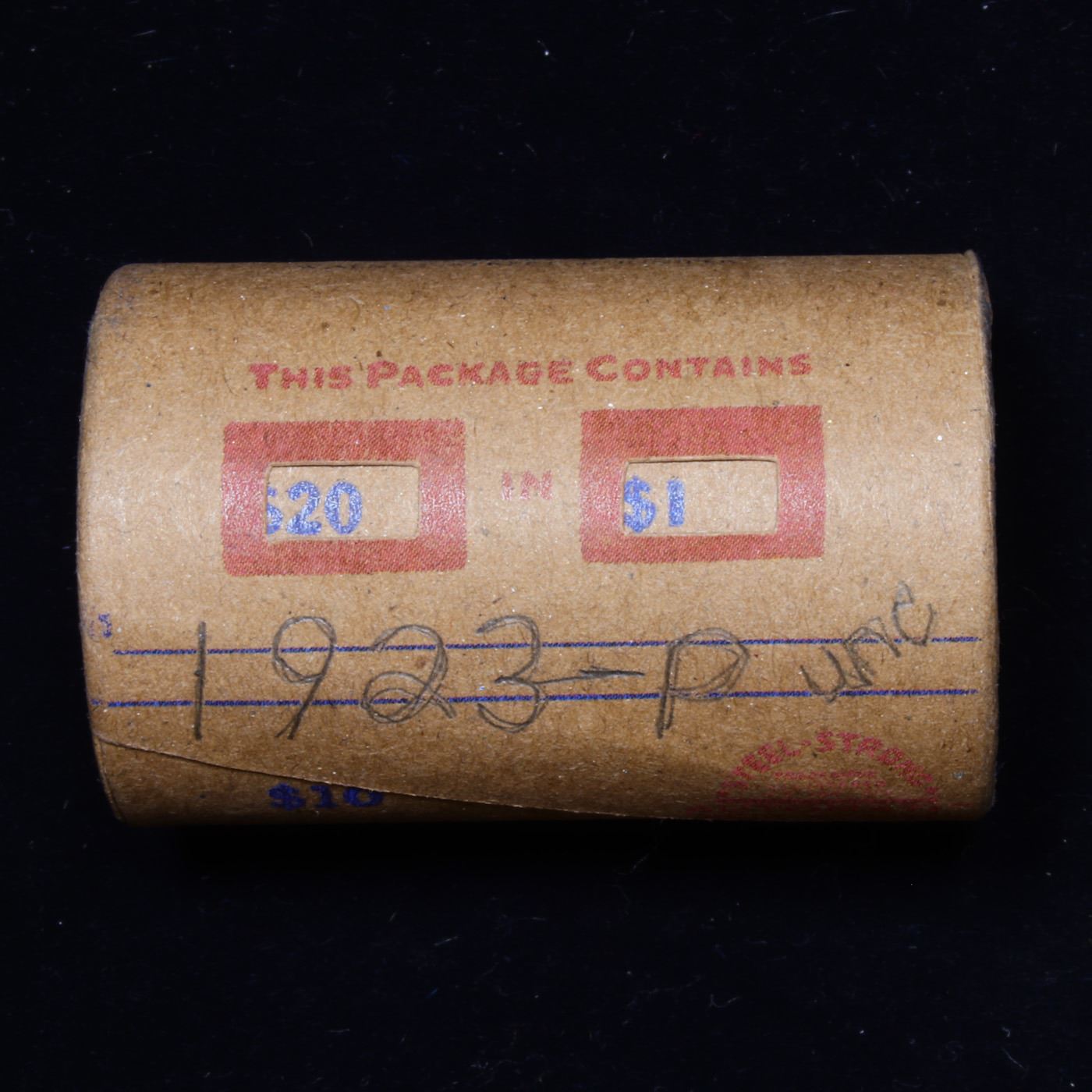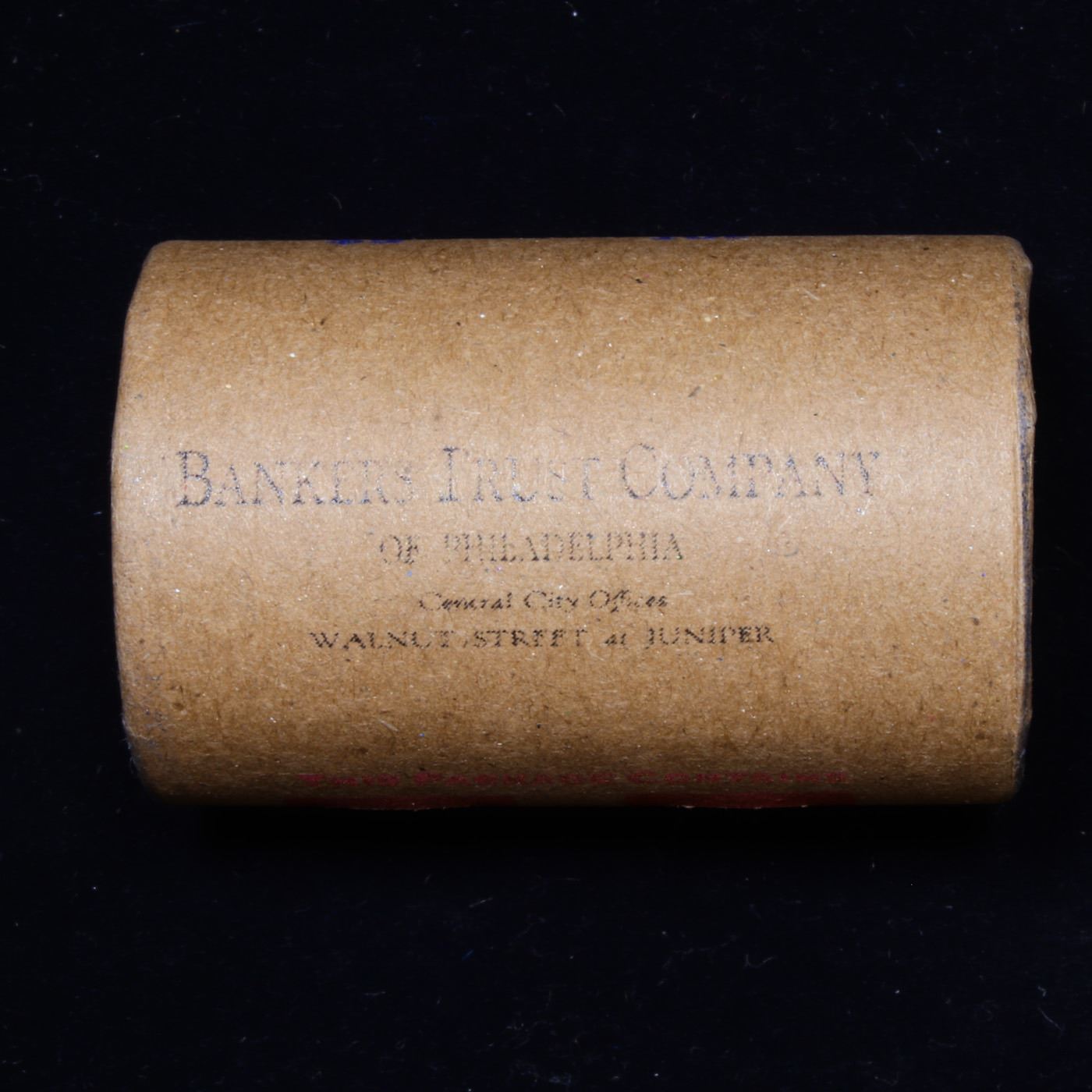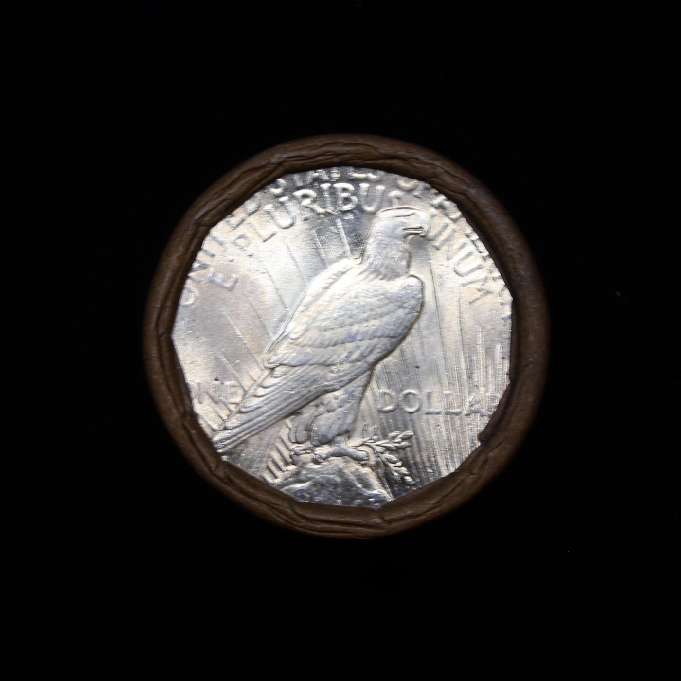 ***Auction Highlight*** 1923-p Uncirculated Peace Dollar Shotgun Roll. This roll is held in an old Steel strong wrapper, patented 1921, stamped "Bankers Trust Company of Philadelphia, Walnut Street at Juniper. 1923-p Uncirculated Peace Dollar Roll. Weighs Perfectly as an Uncirculated Roll. Trends in ms64 is $60 and ms63 is $50. One ms66 is $4775 and one ms65 is $410.