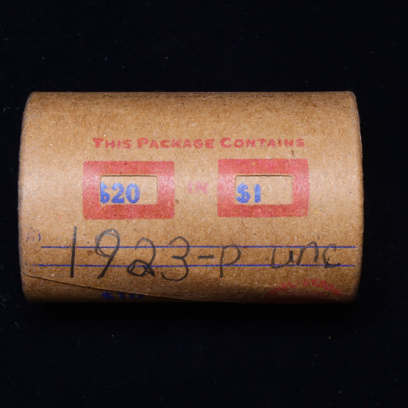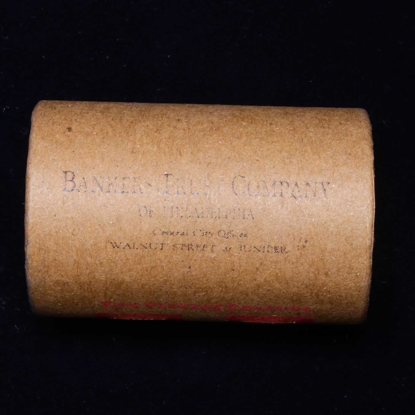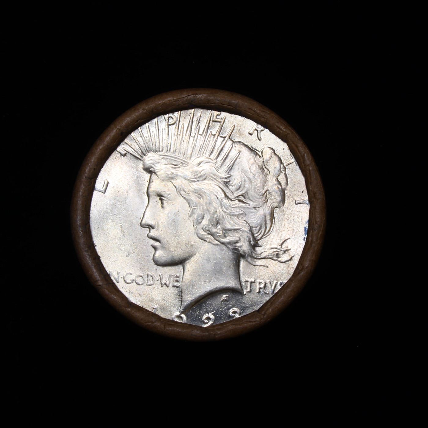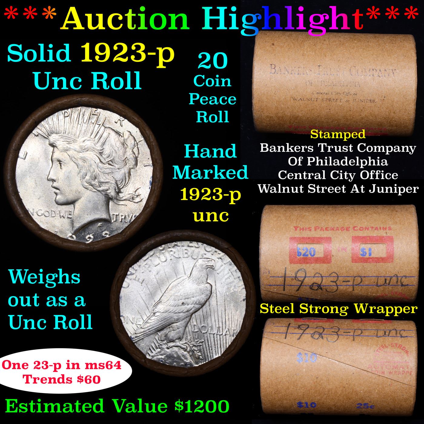 ***Auction Highlight*** 1923-p Uncirculated Peace Dollar Shotgun Roll. This roll is held in an old Steel strong wrapper, patented 1921, stamped "Bankers Trust Company of Philadelphia, Walnut Street at Juniper. 1923-p Uncirculated Peace Dollar Roll, Superb Ends. Weighs Perfectly as an Uncirculated Roll. Trends in ms64 is $60 and ms63 is $50. One ms66 is $415 and one ms67 is $4250.