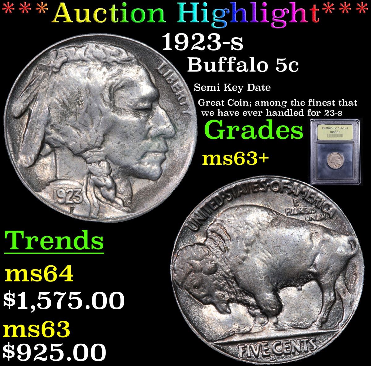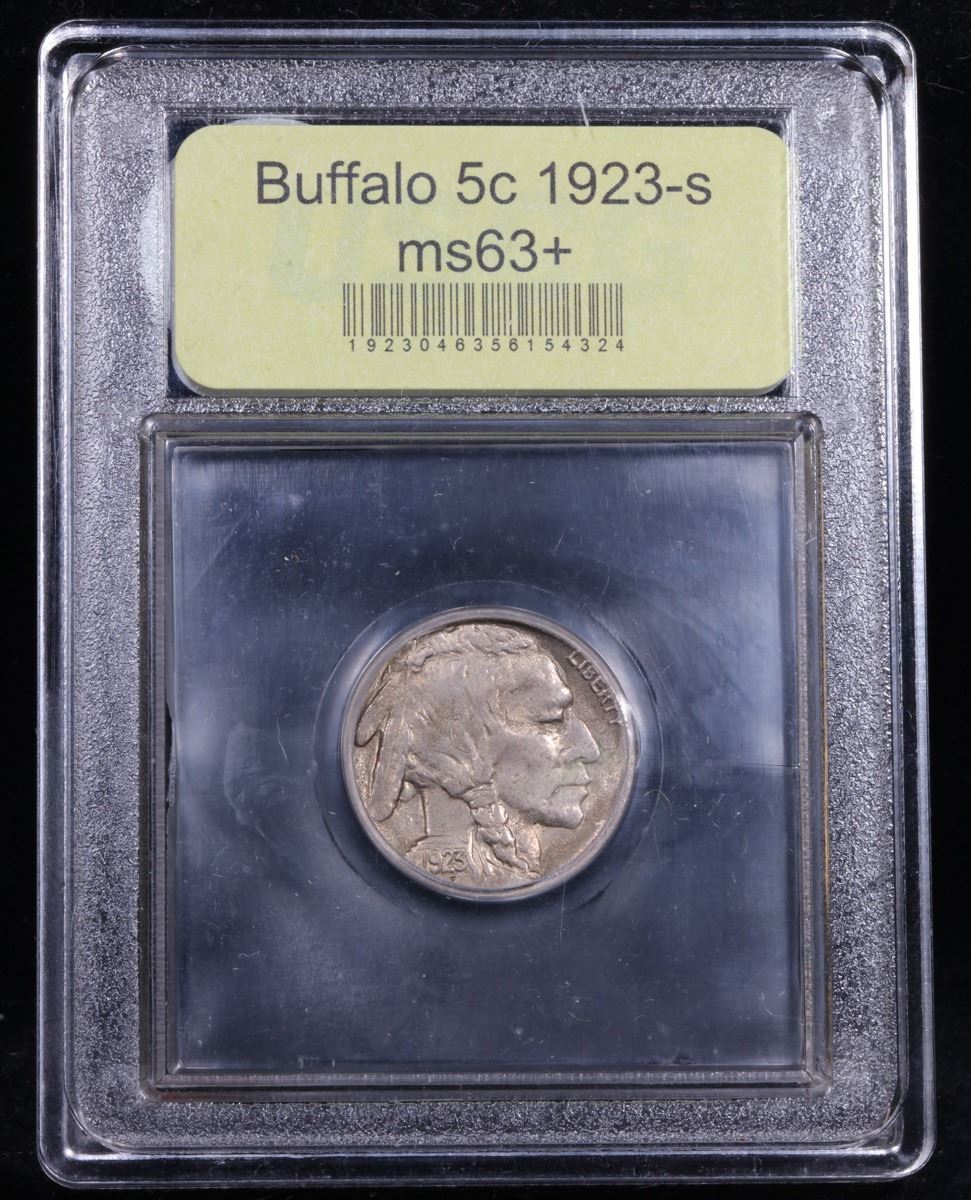 ***Auction Highlight*** 1923-s Buffalo Nickel 5c Graded Select+ Unc By USCG. Well produced for this challenging Roaring Twenties issue, both sides possess above average striking detail that even extends to the high points. A great coin, among the finest that we have ever handled for the 1923-S Buffalo nickel. After a brief hiatus in 1922, nickel production resumed in 1923 at Philadelphia and San Francisco after stockpiles of earlier nickels had finally been exhausted. The overall striking quality is a mixed bag, with many coins struck from a moderately strong obverse die paired with an older die so worn from heavy use that many key details are nearly flat. Exceptionally strong strikes from fresh dies are quite rare and particularly sought after by cognoscenti. This sharp and attractive coin, then, is an important condition rarity that would make an outstanding addition to any advanced Buffalo nickel specialist's cabinet. A Corey's Pick, Bid to Win, Don't let it get Away Coin