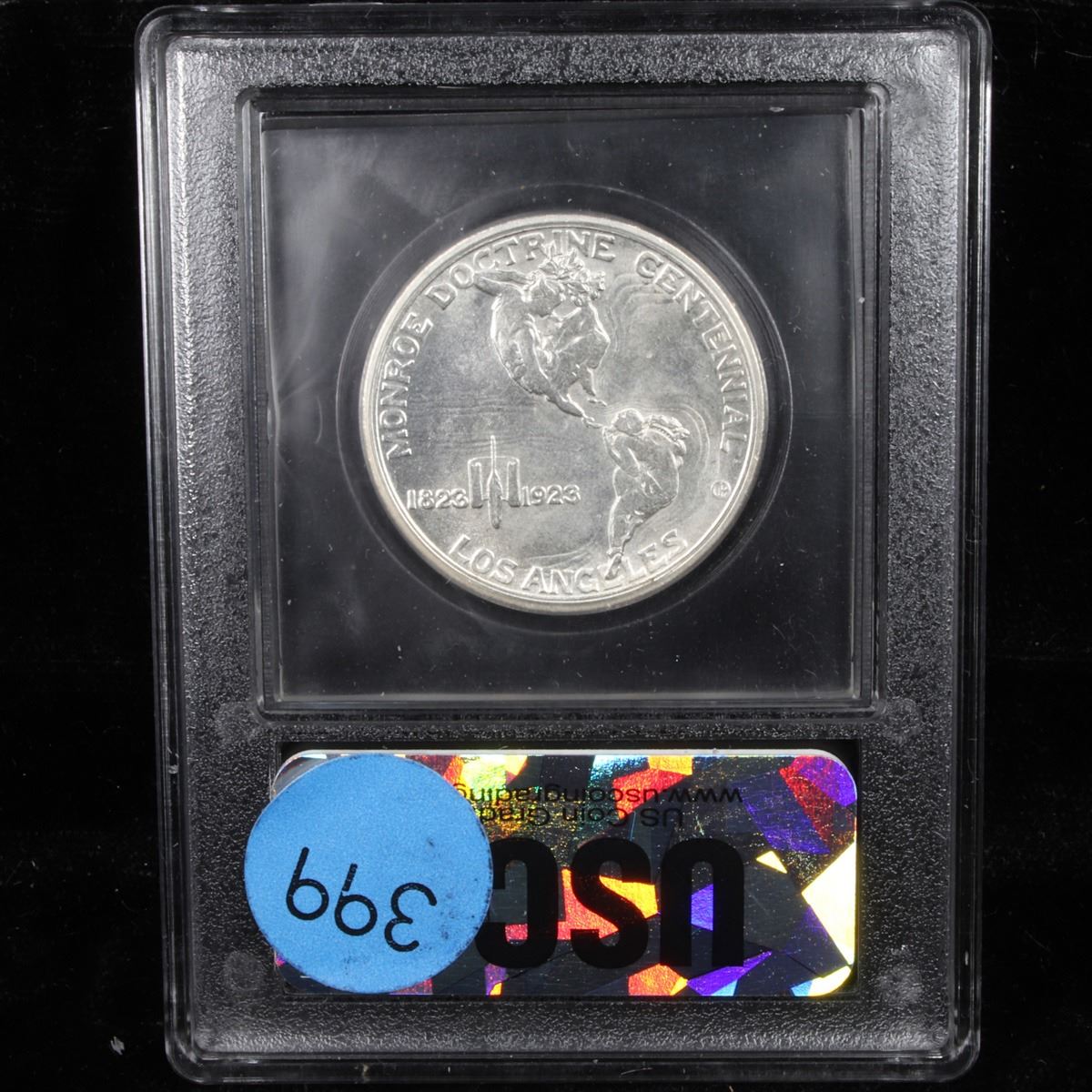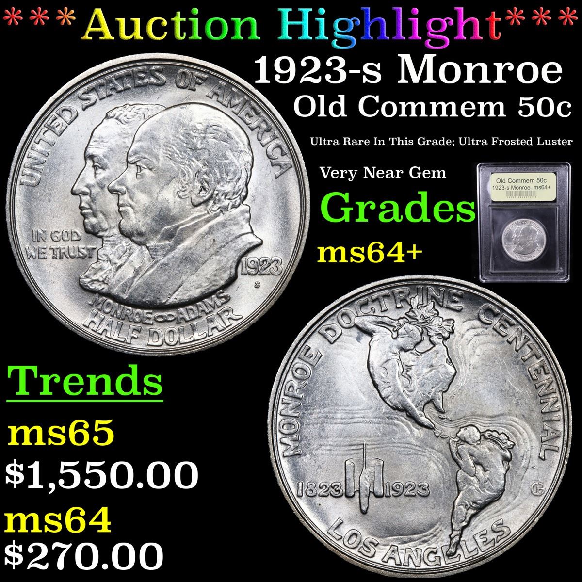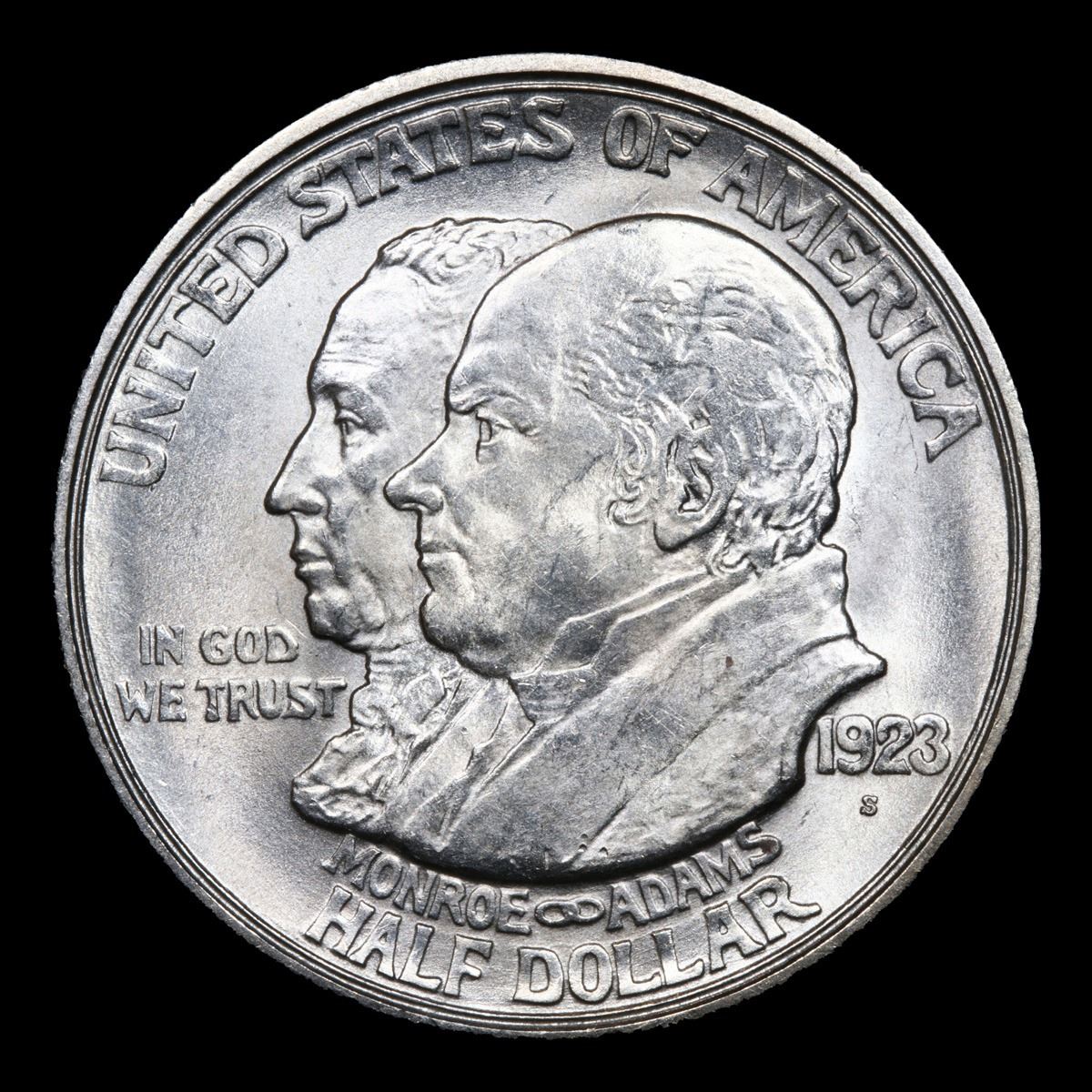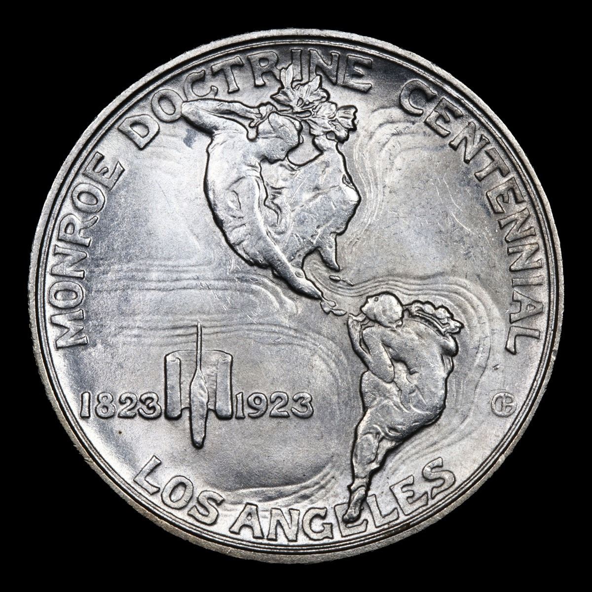 ***Auction Highlight*** 1923-s Monroe Ultra Rare In This Grade; Ultra Frosted Luster Very Near Gem Old Commem Half Dollar 50c Graded Choice+ Unc By USCG. One may think that the Reverse of the Two Continents of The Western Hemisphere but upon closer examination you will see that they are two women bent into the general shapes of the two continents. When examining a Monroe Commemorative the cheeks of the two statesmen on the obverse and the figures that represent the two continents on the reverse are the highpoints and will show wear first. A Corey's Pick, Bid to Win Coin