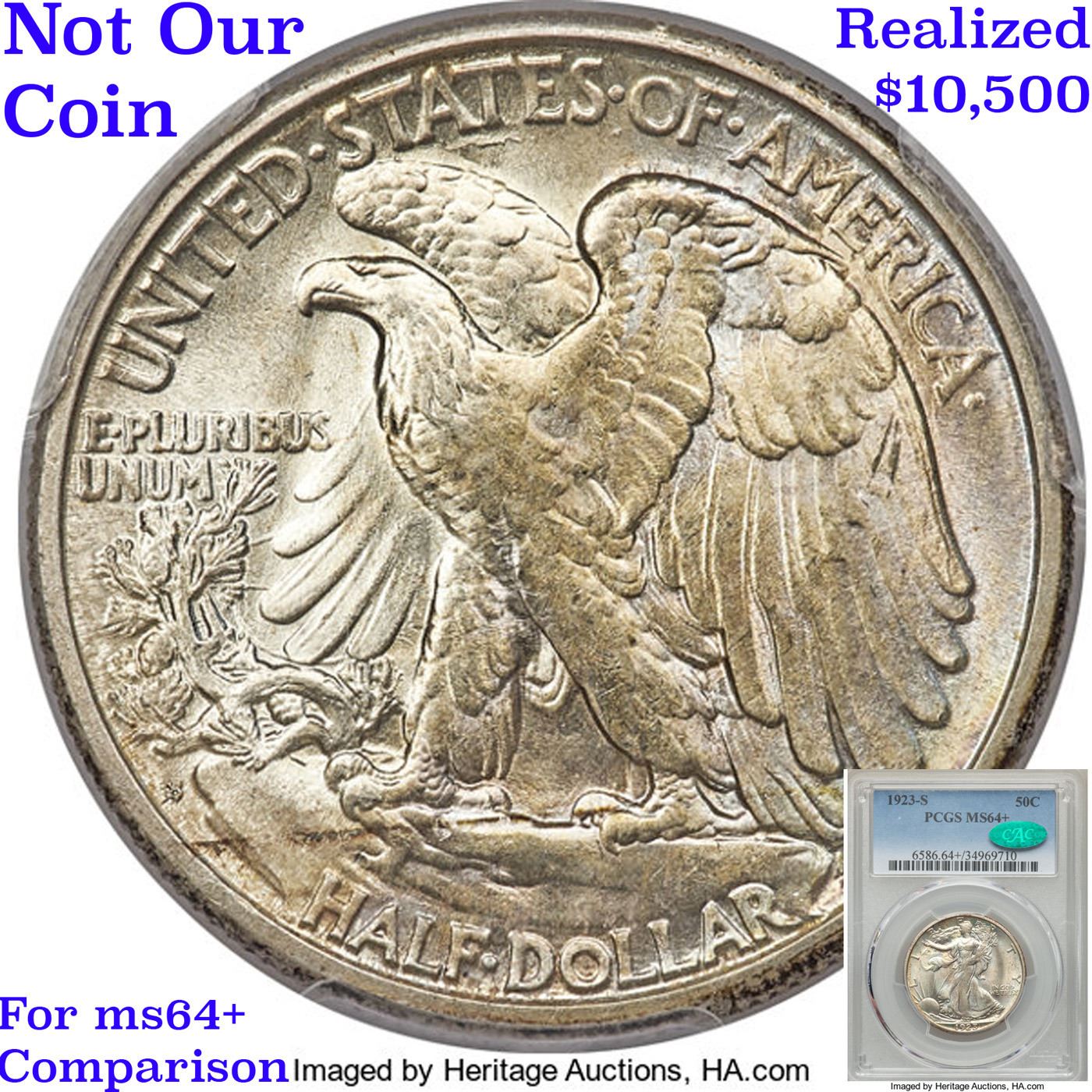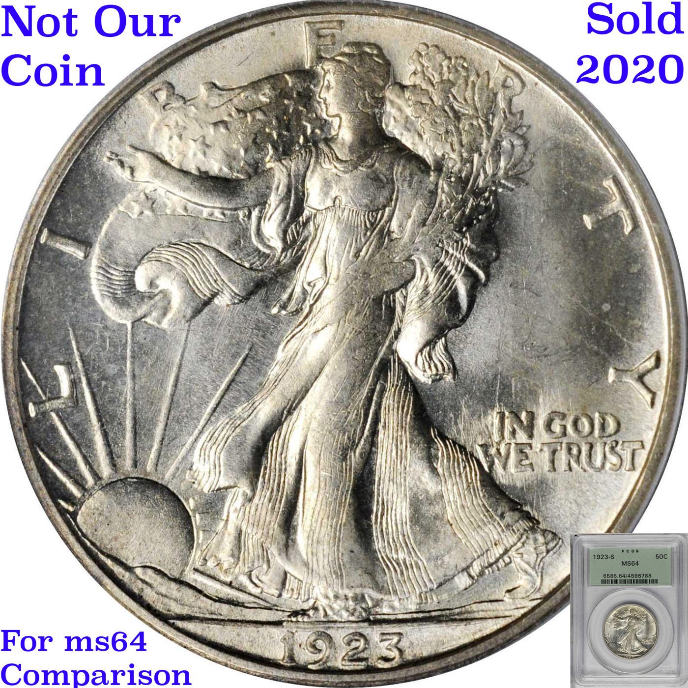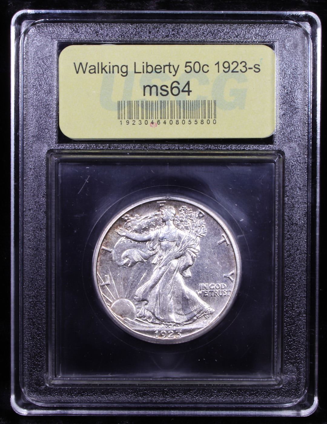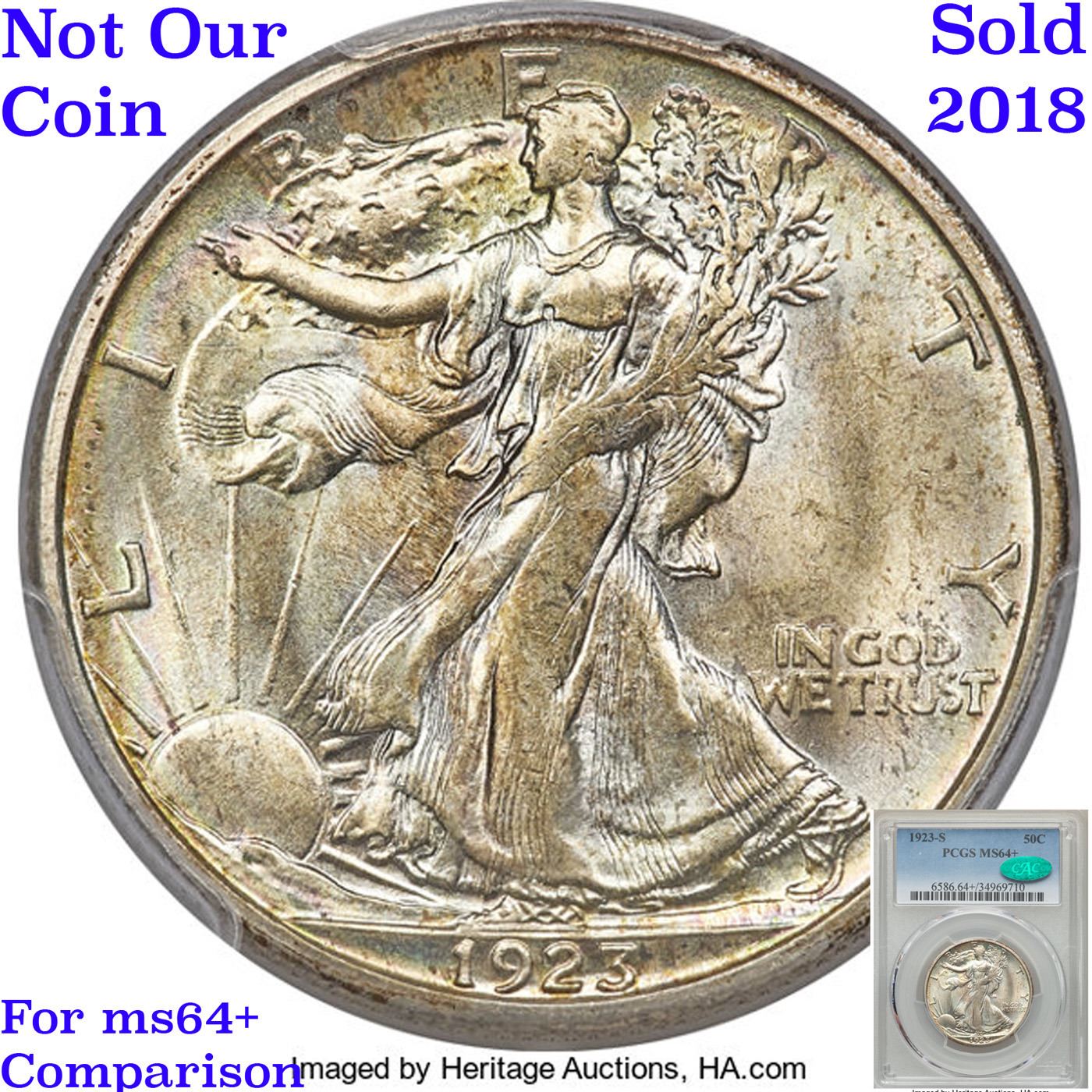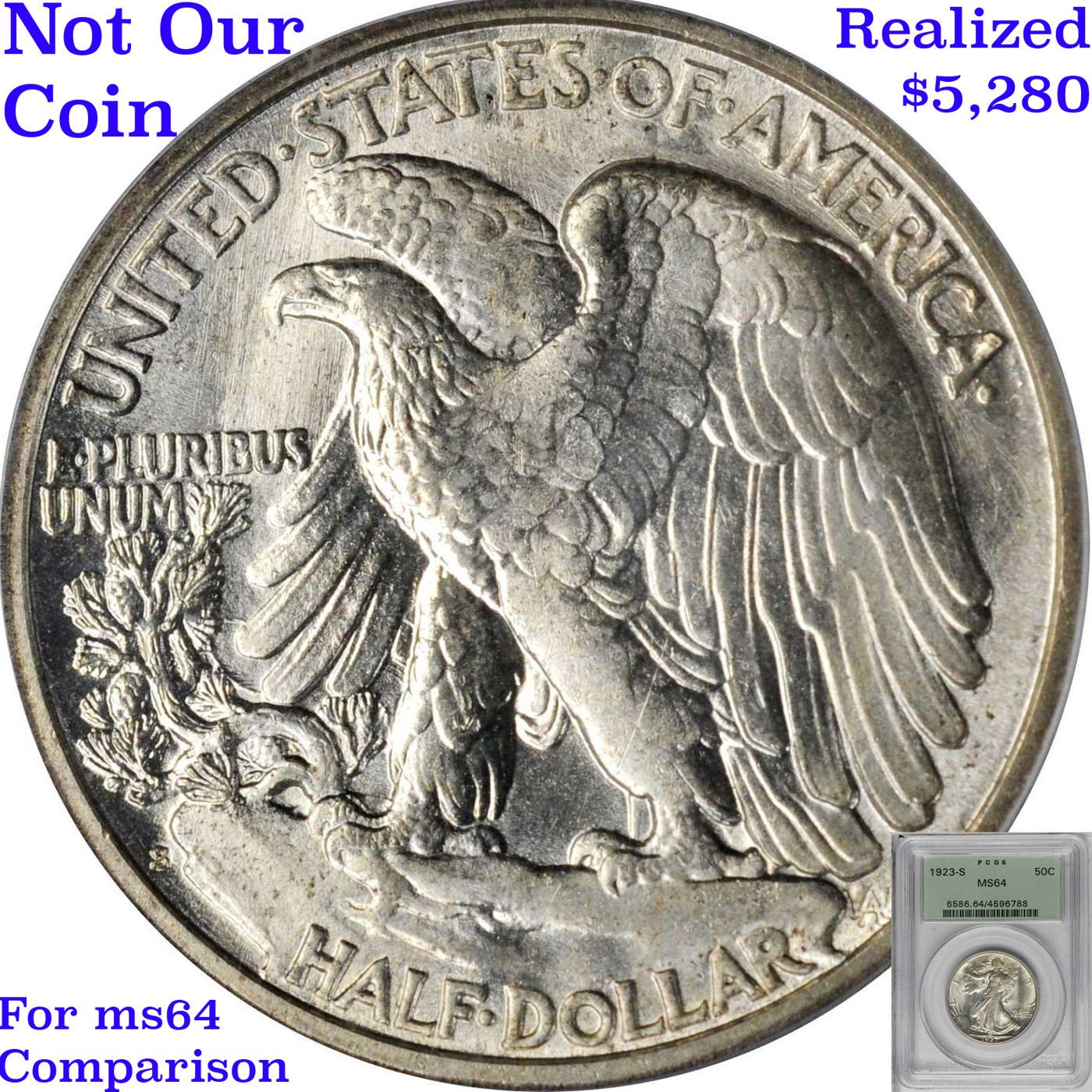***Auction Highlight*** 1923-s Walking Liberty Half Dollar 50c Graded Choice Unc By USCG. this Choice Mint State 1923-S half dollar is quite boldly struck for the example, certainly sharper than usual for the issue. This lovely piece has satiny silver luster. This scarce issue is elusive in higher numerical grades with few finer examples. I have included an ms64 and an ms64+ for your comparison, please note the general weak strike for the date. Ours is noticeably stronger struck. A Corey's Pick, Bid to Win, Don't let it get Away, you might not find its equal Coin