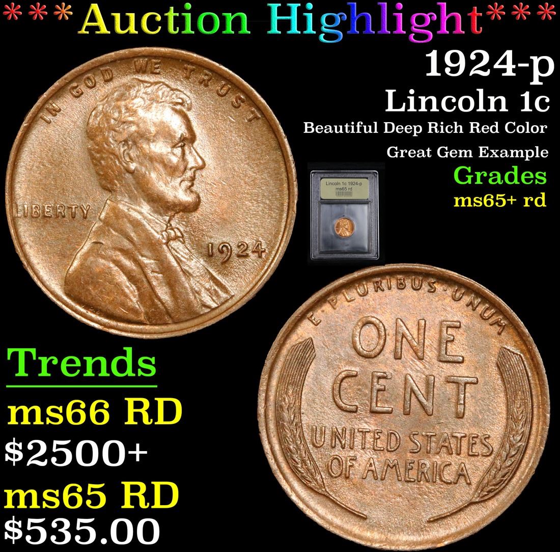 ***Auction Highlight*** 1924-p Lincoln Cent 1c Graded Gem+ Unc RD By USCG. Beautiful Deep Rich Red Color Great Gem Example According to Jaime Hernandez from PCGS; from 1909 to 1929, the 1924 Lincoln cent is the third toughest Philadelphia cent in high mint state grades. Out of an original mintage of over 75 million coins, PCGS estimates only 1000 remain in ms65 or better. A Corey's Pick, Bid to Win, Don't let it get Away Coin