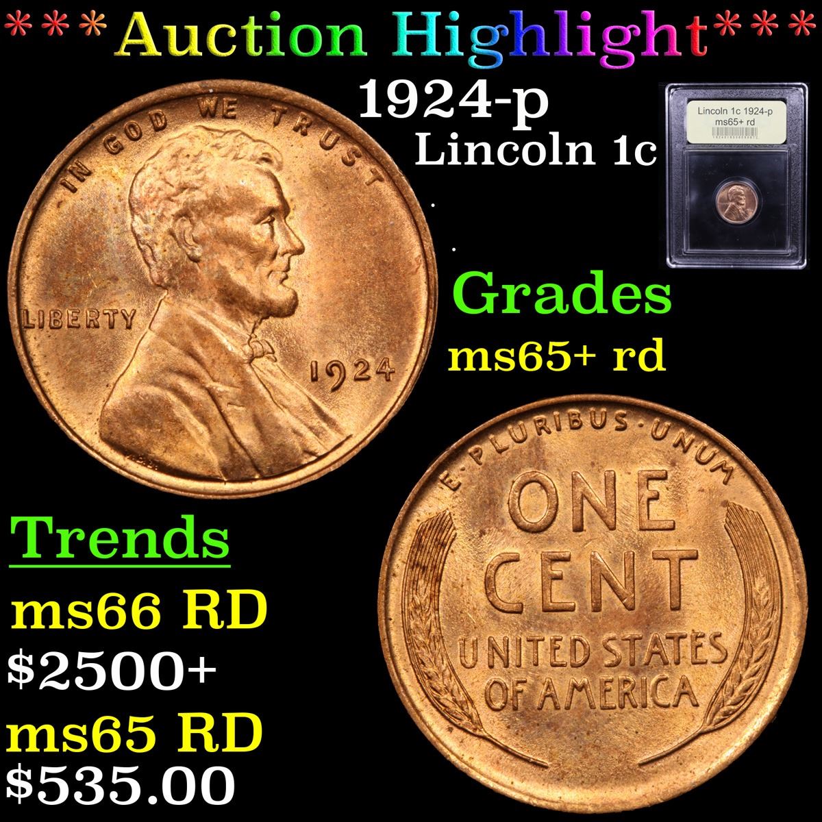 ***Auction Highlight*** 1924-p Lincoln Cent 1c Graded Gem+ Unc RD By USCG. According to Jaime Hernandez from PCGS; from 1909 to 1929, the 1924 Lincoln cent is the third toughest Philadelphia cent in high mint state grades. Out of an original mintage of over 75 million coins, PCGS estimates only 1000 remain in ms65 or better. A Corey's Pick, Bid to Win Coin