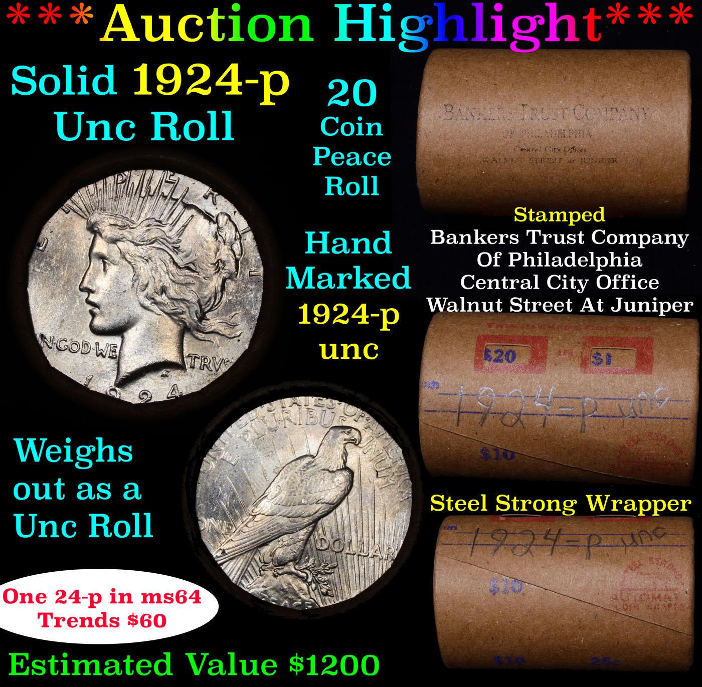 ***Auction Highlight*** 1924-p Solid Uncirculated Peace Dollar Shotgun Roll. This roll is held in an old Steel strong wrapper, patented 1921, stamped "Bankers Trust Company of Philadelphia, Walnut Street at Juniper. 1924-p Uncirculated Peace Dollar Roll. Weighs Perfectly as an Uncirculated Roll. Trends in ms64 is $60 and ms63 is $50. One ms66 is $575 and one ms65 is $170.