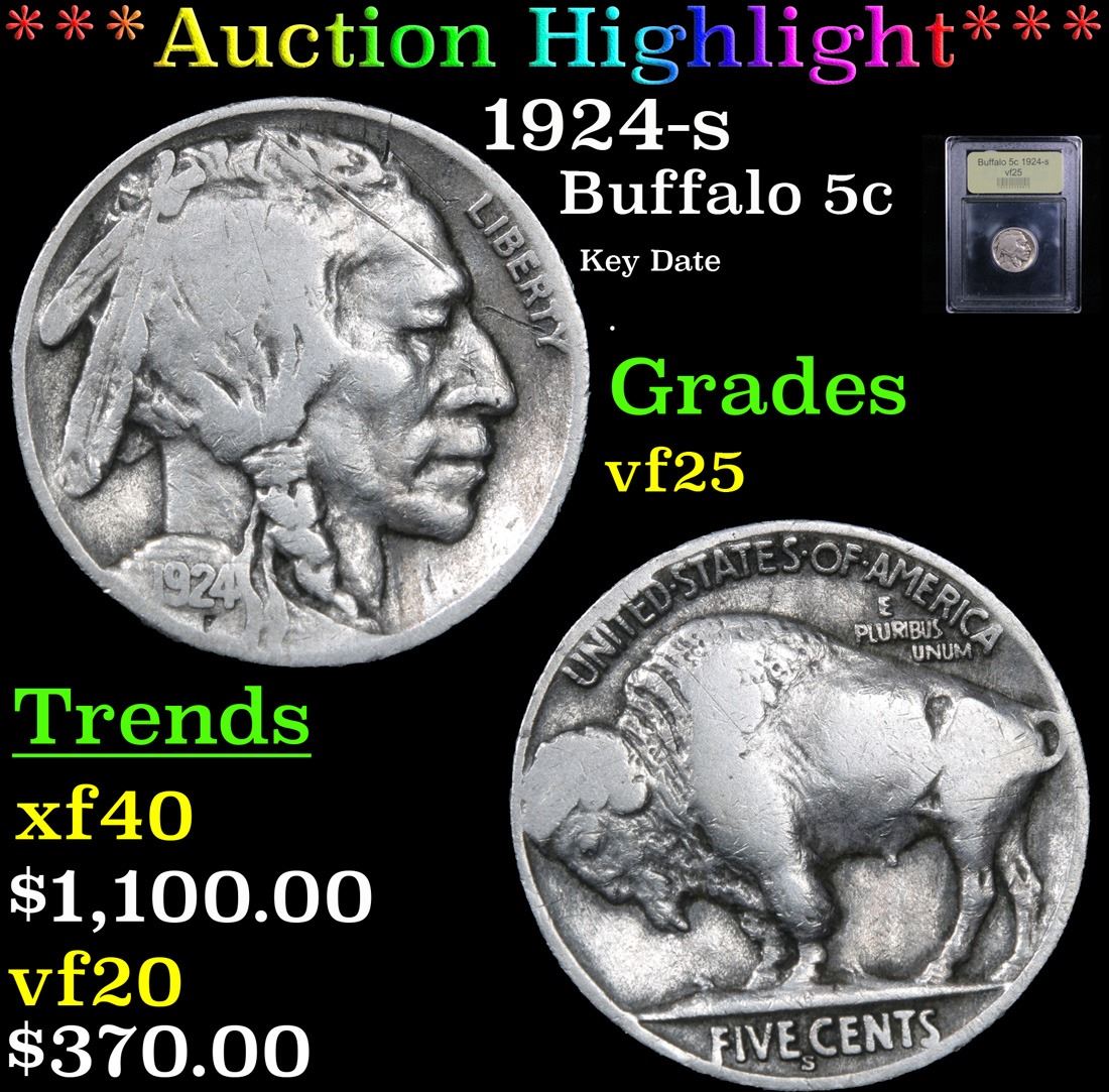 ***Auction Highlight*** 1924-s Key Date . Buffalo Nickel 5c Graded vf+ By USCG.