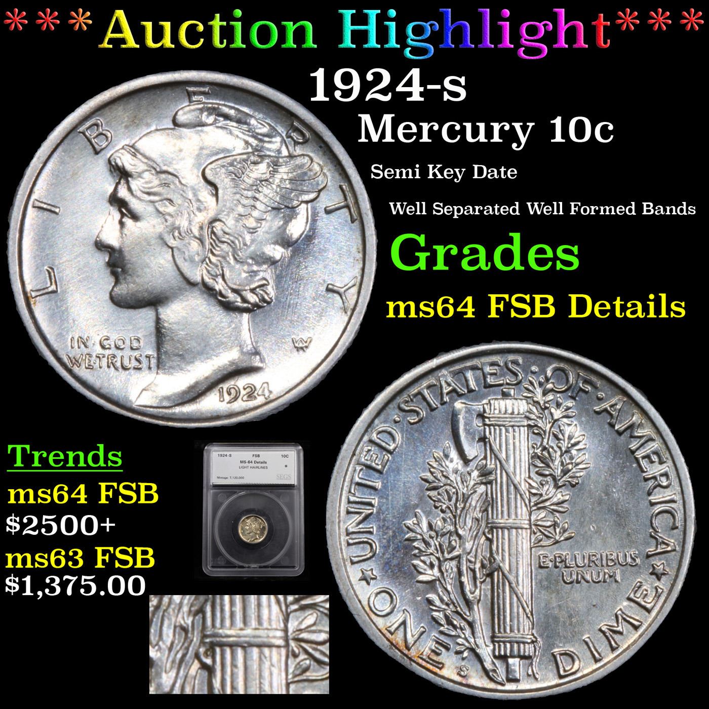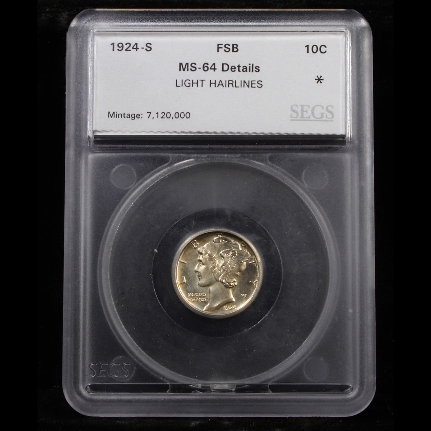 ***Auction Highlight*** 1924-s Mercury Dime 10c Graded ms64 FSB Details By SEGS.