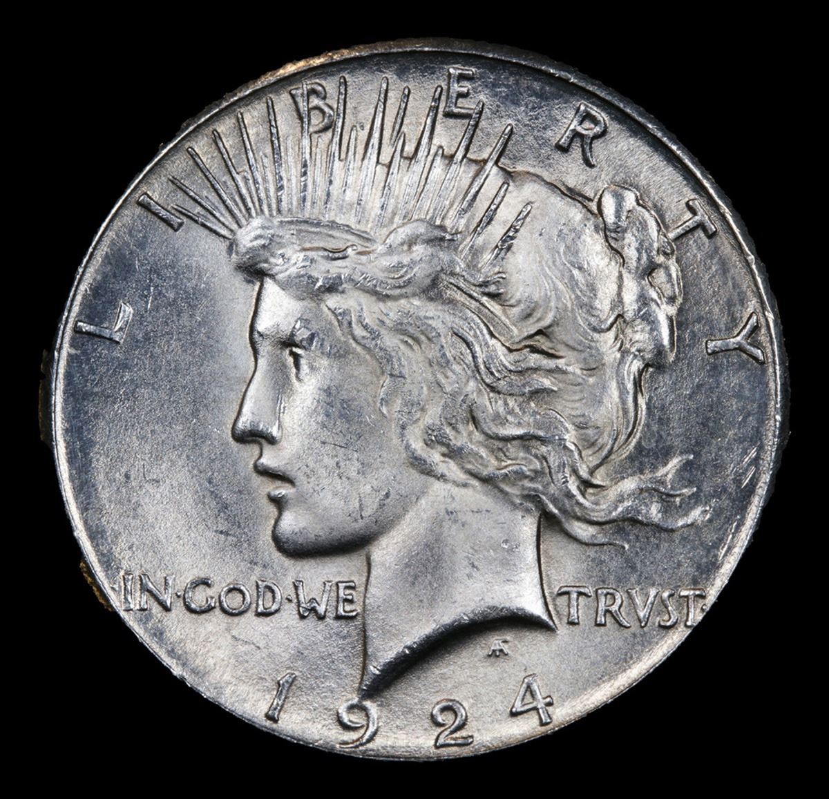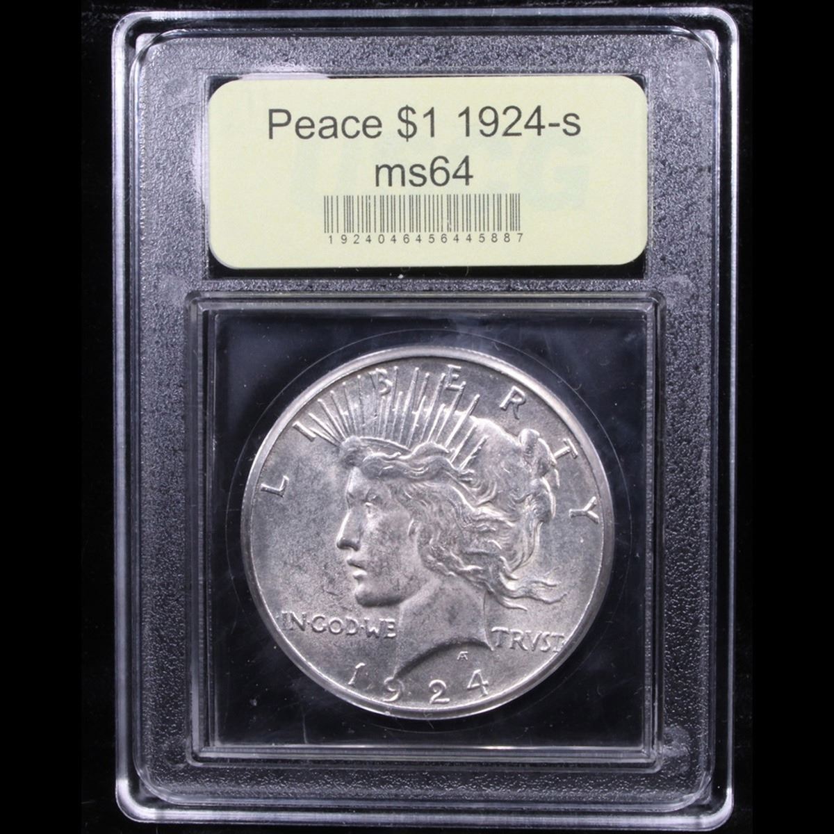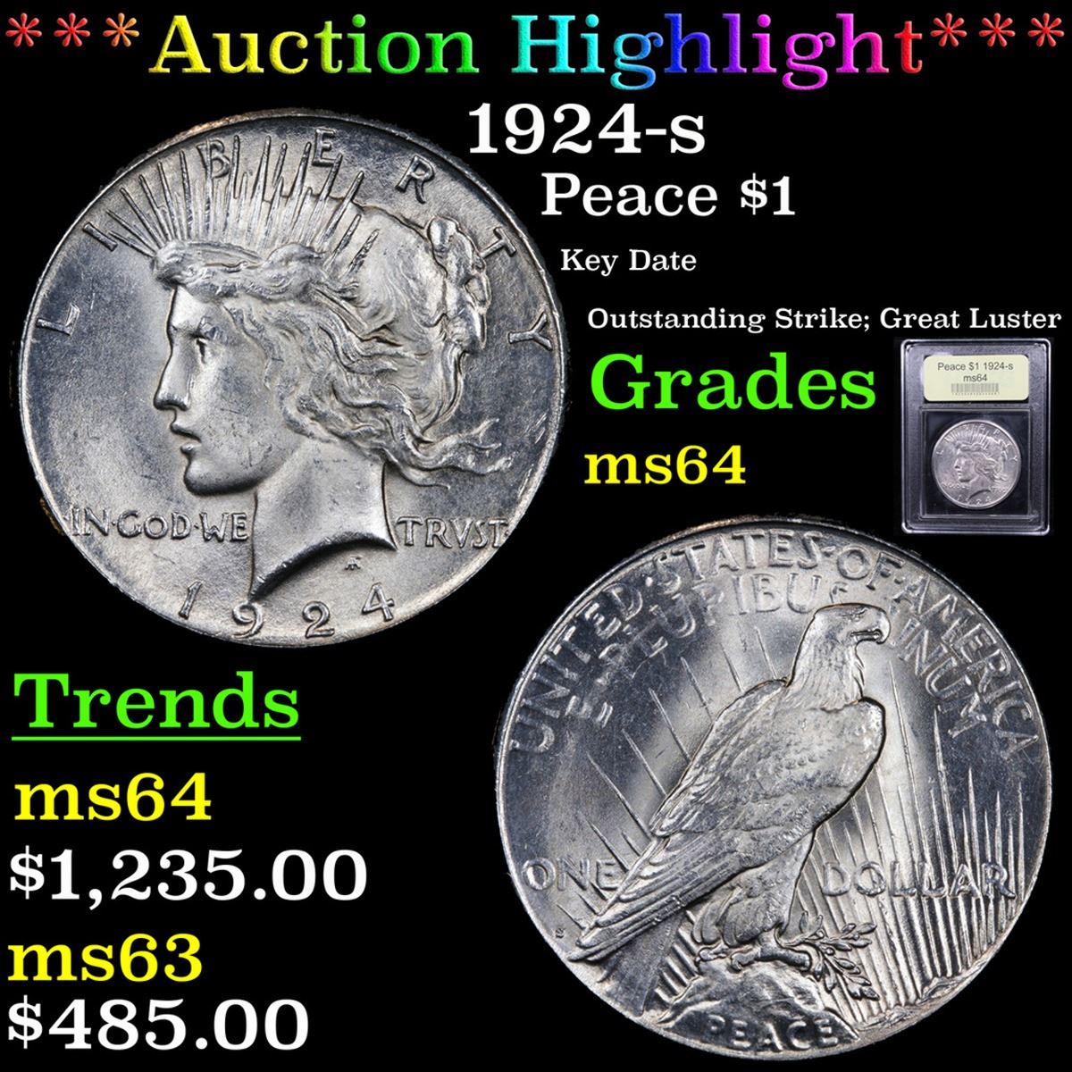 ***Auction Highlight*** 1924-s Peace Dollar $1 Graded Choice Unc By USCG. Outstanding strike, great luster, really above the average 24-s. This coin generally comes with a “blurry” or mushy strike and dull luster. This example is brilliant, even flashy and has a strong crisp strike. A really PQ 1924-s A Corey's Pick, Bid to Win, Don't let it get Away Coin