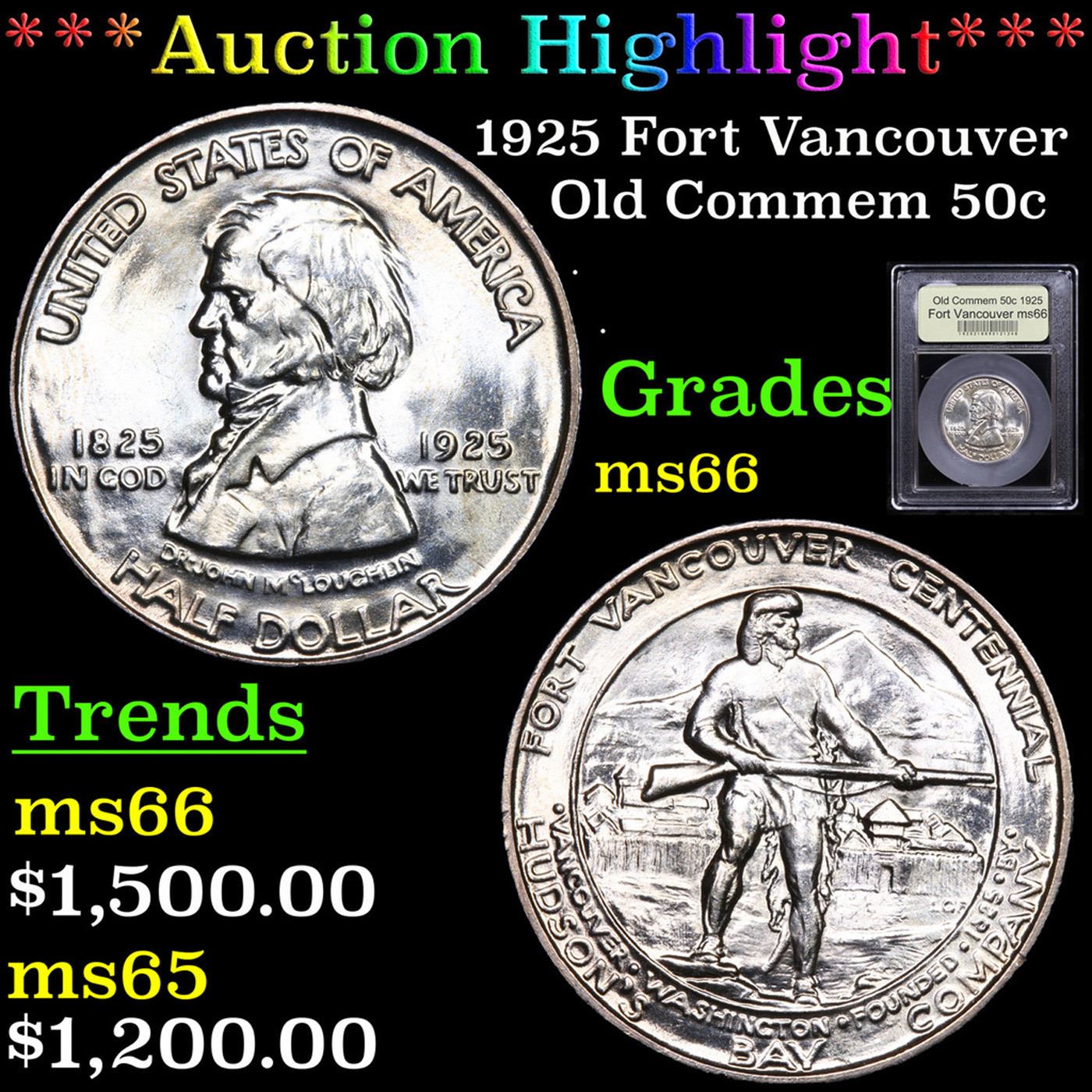 ***Auction Highlight*** 1925 Fort Vancouver Old Commem Half Dollar 50c Graded GEM+ Unc By USCG. One of the four different commemorative coins issued during the year was the 1925 Fort Vancouver Centennial Half Dollar. This coin featured designs by Portland, Oregon artist Sidney Bell, which were modeled by Laura Gardin Fraser.The occasion commemorated was the 100th anniversary of the founding Fort Vancouver, Washington. This outpost had served as a trading center for settlers and Native Americans within the territory. The coins were issued as part of a week long local celebration and sold for $1 each.Dr. John McLoughlin is depicted on the obverse of the coin. He had established Fort Vancouver on the Columbia River in 1825 and later went on to found Oregon City. The reverse of the Fort Vancouver Half Dollar portrays a pioneer holding a musket with the Fort and a mountain peak in the background. Authorized production was set at 300,000, which proved far too optimistic. A quantity of 50,000 coins was struck at the San Francisco Mint (although the coins did not carry the “S” mint mark) and after unsold coins were returned for melting, net distribution was a paltry 14,994 coins.