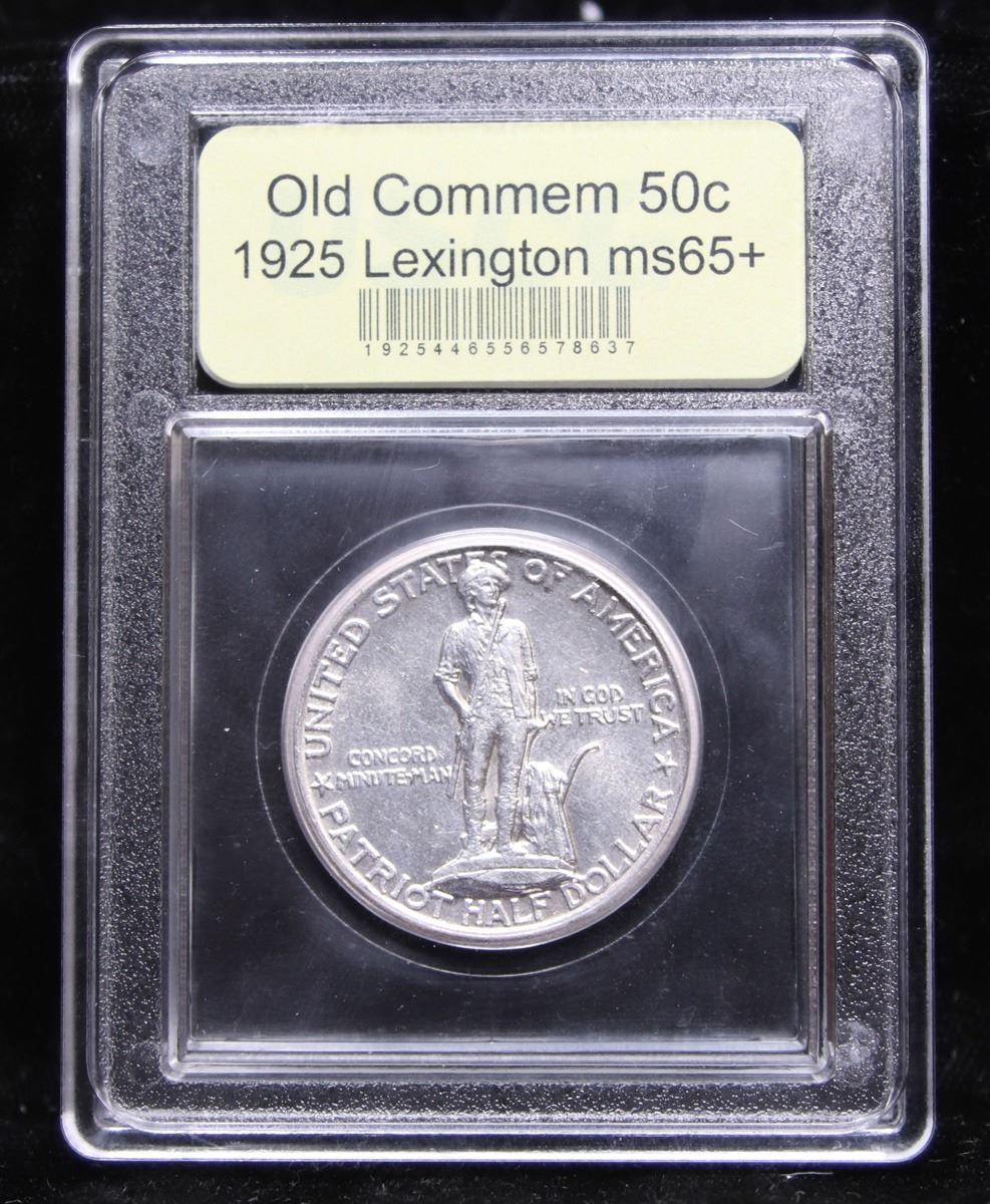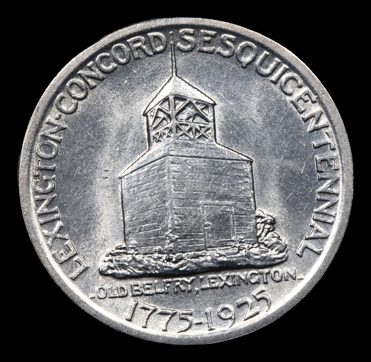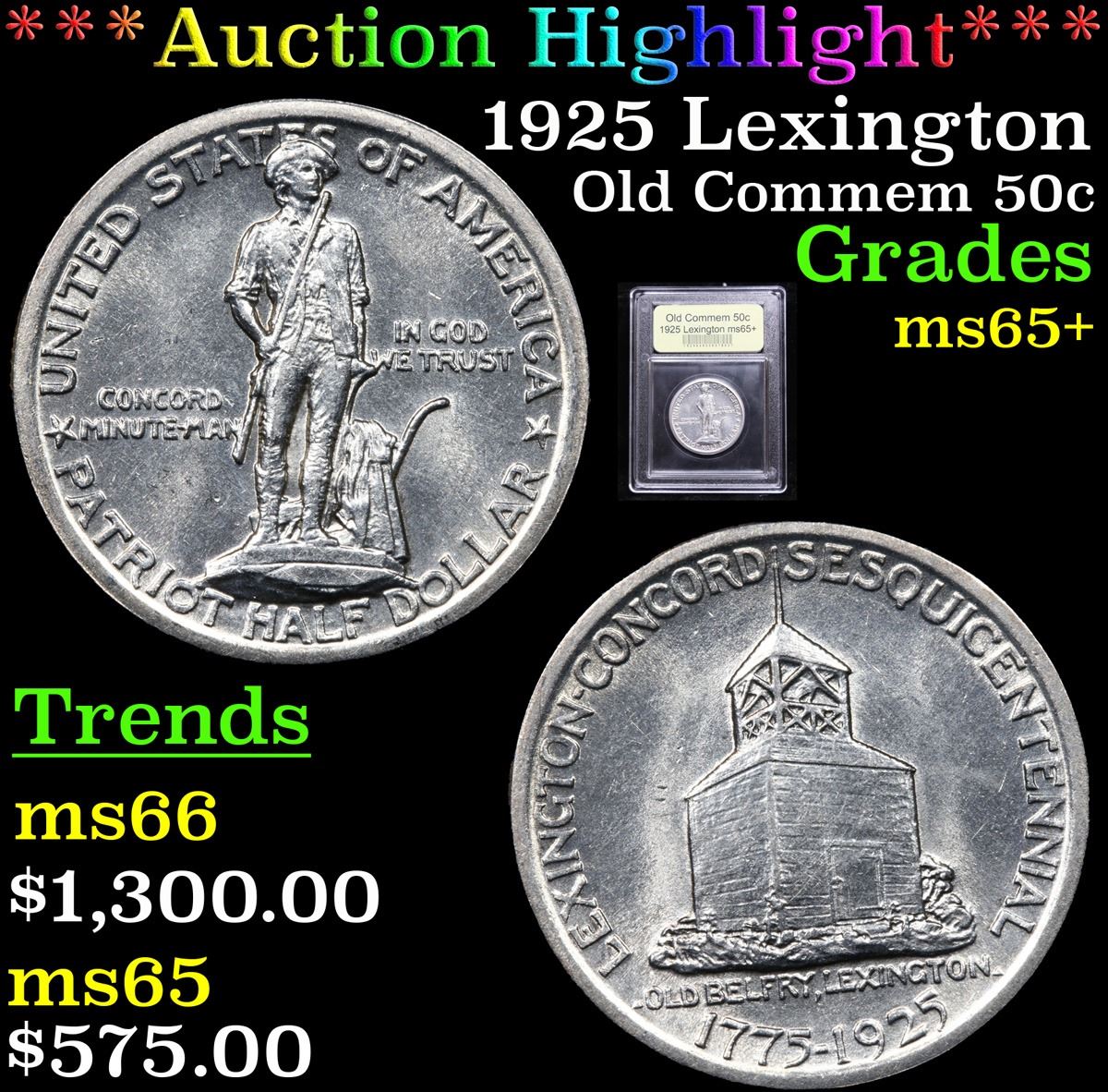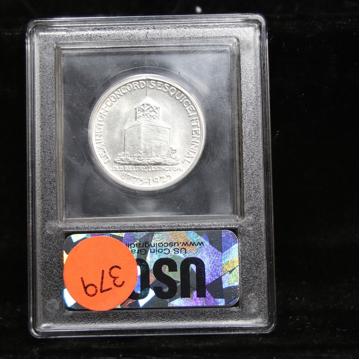 ***Auction Highlight*** 1925 Lexington . . Old Commem Half Dollar 50c Graded GEM+ Unc By USCG. The Lexington Commemorative Celebrates the 150th Anniversary of the "Shot Heard 'Round The World", which symbolically began the American Revolution and Forever Changed the World. When looking at a Lexington Commemorative, the points to check for wear include the Minute Man’s Thighs and the Near Corner of the Belfry, particularly Toward its Top. These same Highpoints may also show Weakness of Strike. A Corey's Pick, Bid to Win Coin
