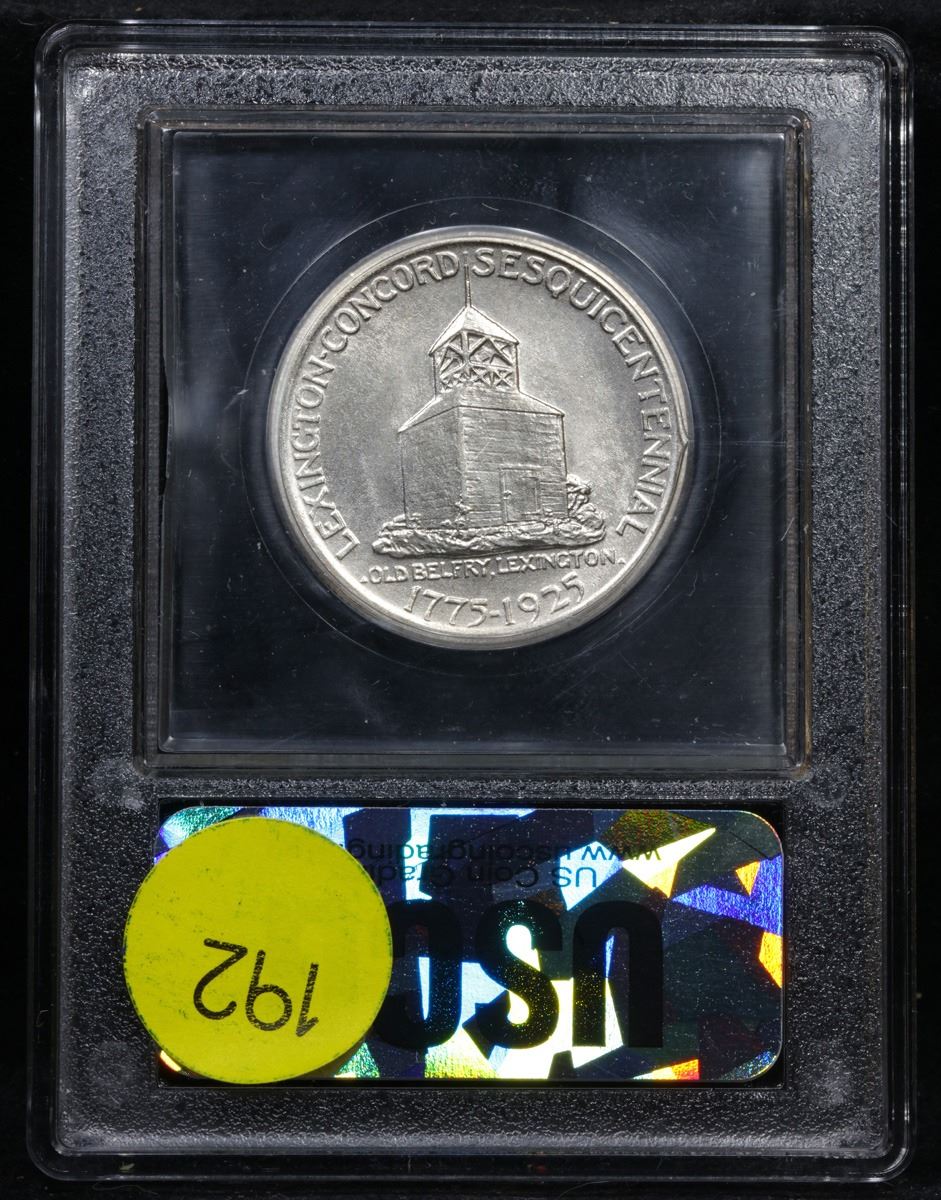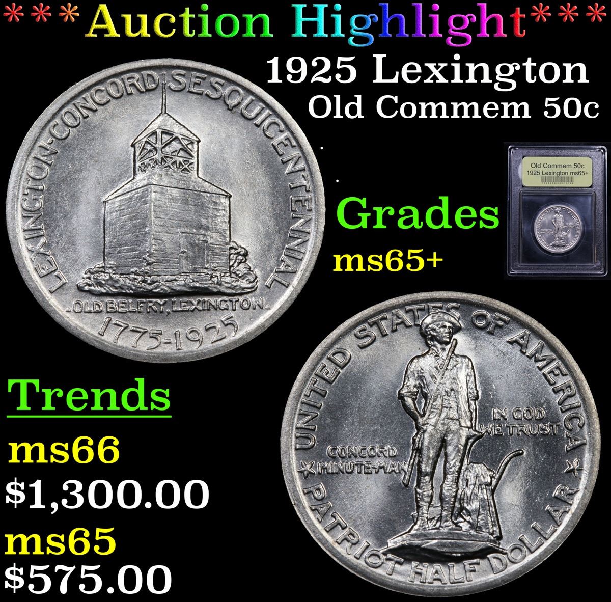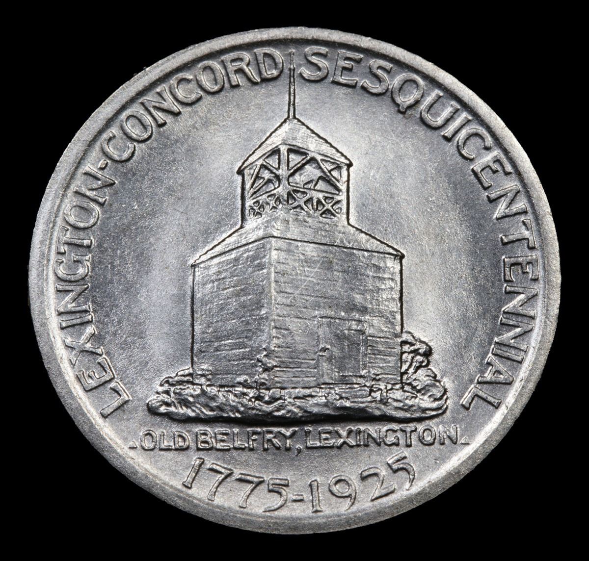 ***Auction Highlight*** 1925 Lexington Old Commem Half Dollar 50c Graded GEM+ Unc By USCG. The Lexington Commemorative Celebrates the 150th Anniversary of the "Shot Heard 'Round The World", which symbolically began the American Revolution and Forever Changed the World. When looking at a Lexington Commemorative, the points to check for wear include the Minute Man’s Thighs and the Near Corner of the Belfry, particularly Toward its Top. These same Highpoints may also show Weakness of Strike. A Corey's Pick, Bid to Win Coin