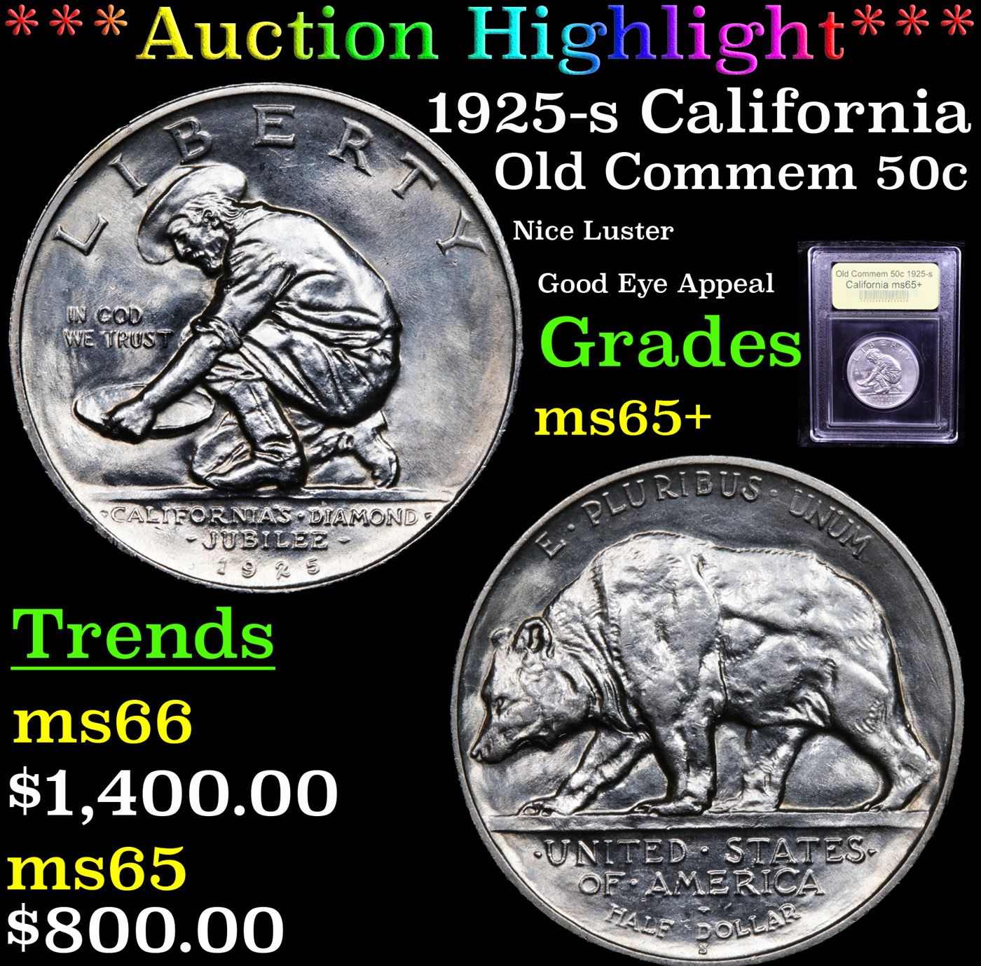 ***Auction Highlight*** 1925-s California Old Commem Half Dollar 50c Graded GEM+ Unc BY USCG. The High Points of the Coin are the Bear's Shoulder and Leg and the Miner's Back, Shoulder and Shirtsleeve. The Coin was a Great Success when First Issued and is Still Sought After Today. A Corey's Pick, Bid to Win, Don't let it get Away Coin