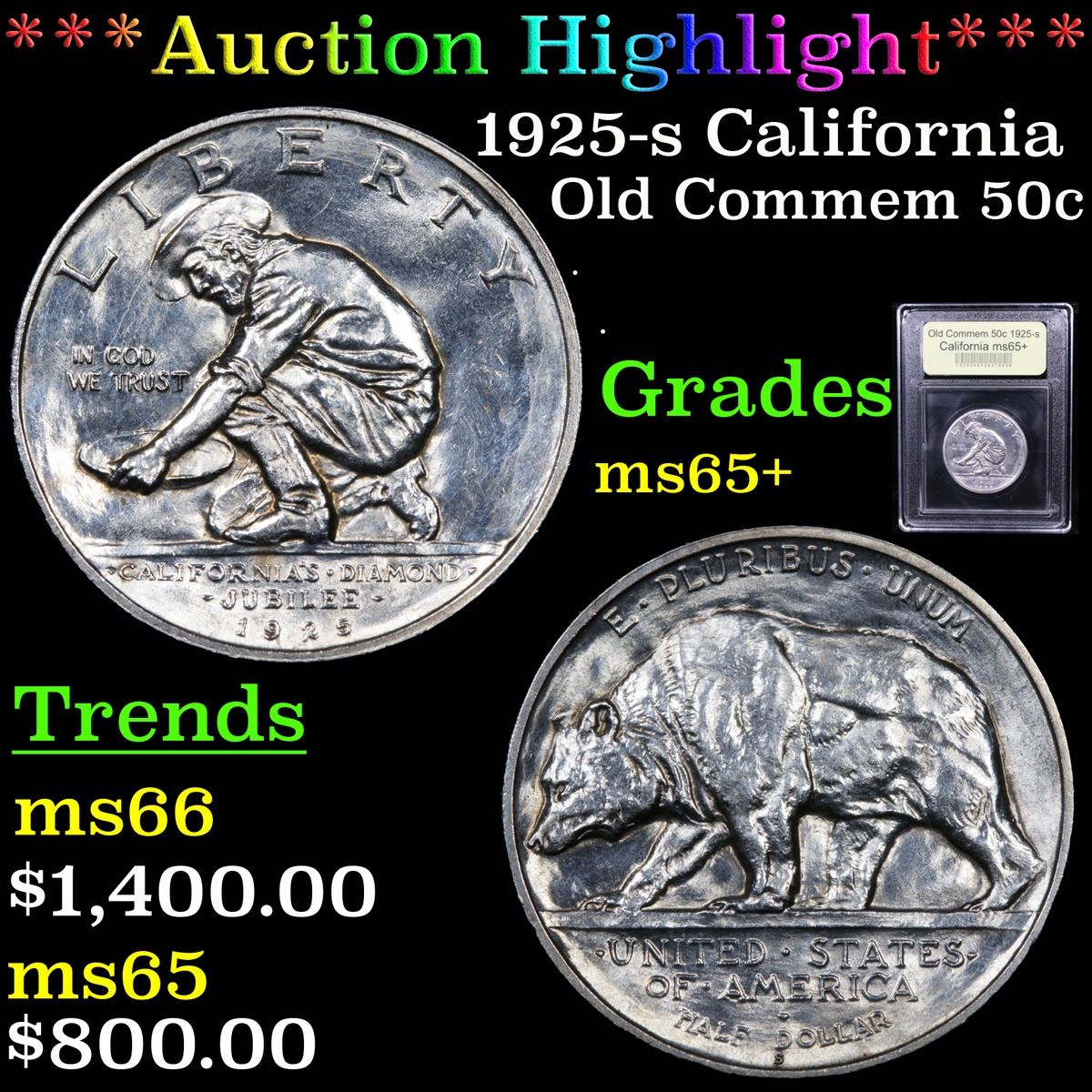 ***Auction Highlight*** 1925-s California Old Commem Half Dollar 50c Graded GEM+ Unc By USCG. The High Points of the Coin are the Bear's Shoulder and Leg and the Miner's Back, Shoulder and Shirtsleeve. The Coin was a Great Success when First Issued and is Still Sought After Today. 0