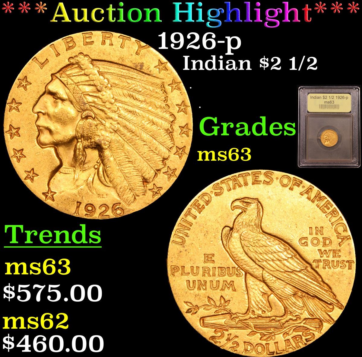 ***Auction Highlight*** 1926-p Gold Indian Quarter Eagle $2 1/2 Graded Select Unc By USCG.