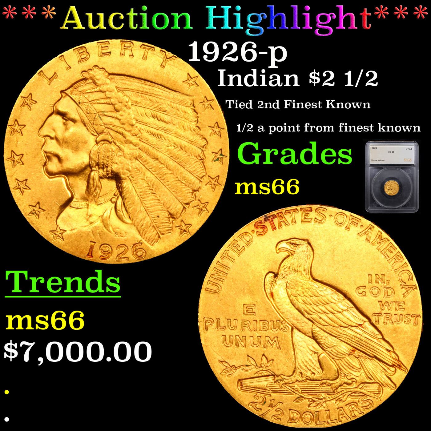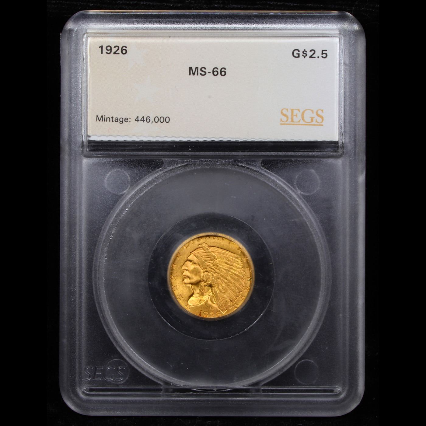 ***Auction Highlight*** 1926-p Gold Indian Quarter Eagle $2 1/2 Graded ms66 By SEGS. The 1926 is the most consistently well produced and sharply defined circulation strike Indian quarter eagle, and the present example does not disappoint in this regard. Both sides are fully impressed with satiny medium gold luster. Uncommonly well preserved, as well, this delightful premium Gem would do equally well in a high grade type or date set. Lovely.Tied for 2nd finest by a mere ½ point.