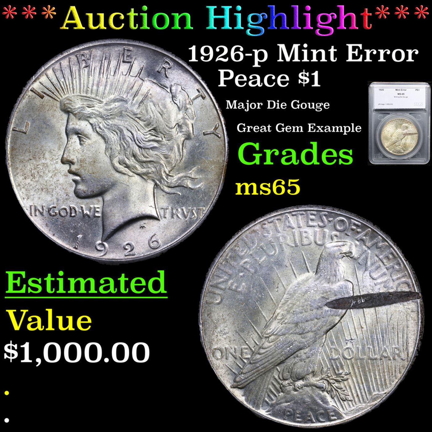 ***Auction Highlight*** 1926-p Mint Error Peace Dollar $1 Graded ms65 By SEGS.