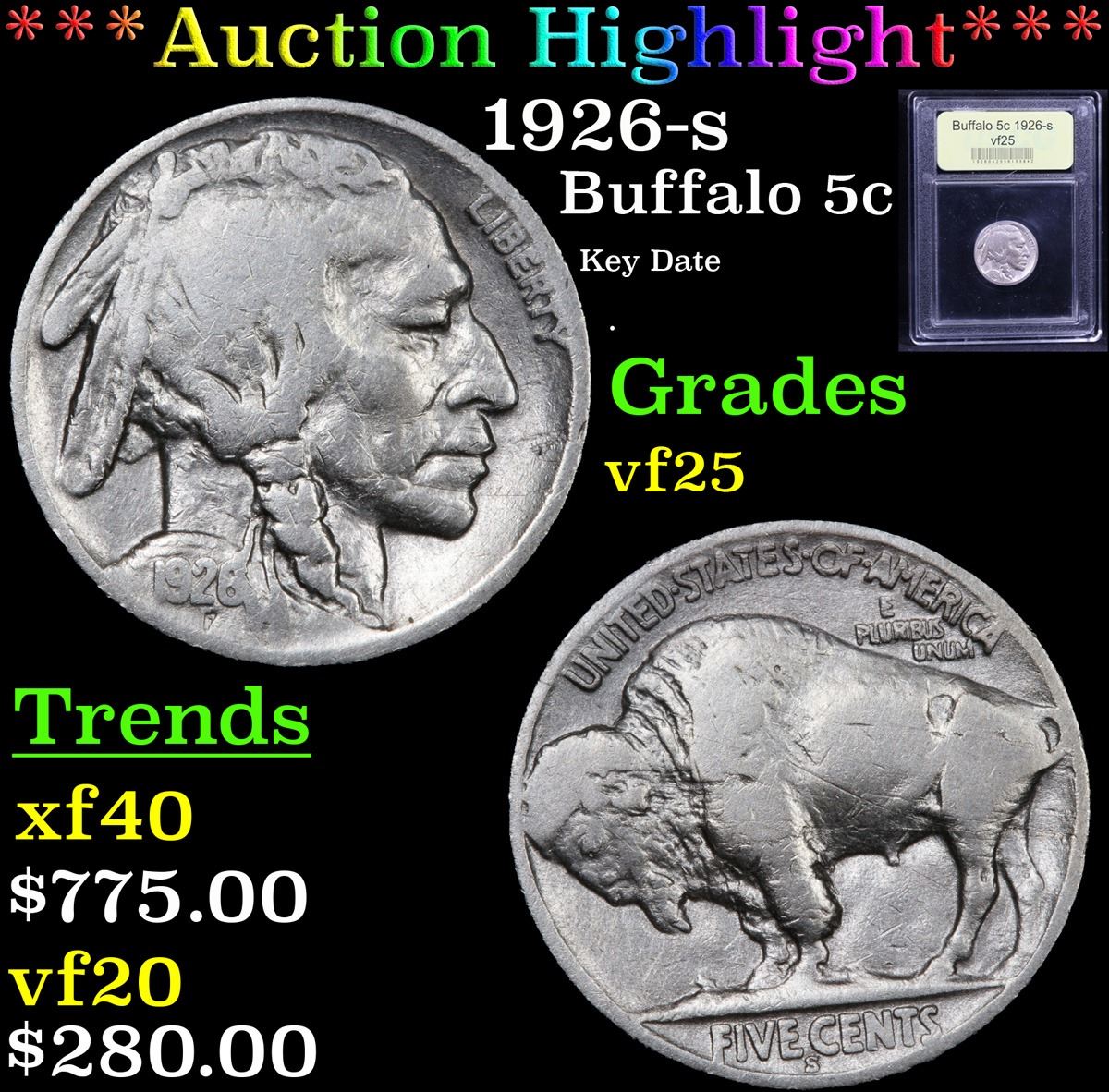 ***Auction Highlight*** 1926-s Buffalo Nickel 5c Graded vf+ By USCG. To Quote David Hall: "The 1926-s is exceptionally rare in mint state condition and in Gem MS65 it is the rarest non-variety Buffalo nickel and as such it is one of the most important rarities of 20th Century numismatics. I have never seen or heard of a specimen grading above MS65. Strike can be somewhat of a problem with this issue, but not as much so as with teh 1920-s, 1923-s and 1925-s. It's not the strike, it's the fact that not many Gem examples exist at all. Luster is of the subdued semi-satiny type. Excluding the 1918/7-d overdate, this issue is THE KEY date to the Buffalo nickel series." A Corey's Pick, Bid to Win Coin