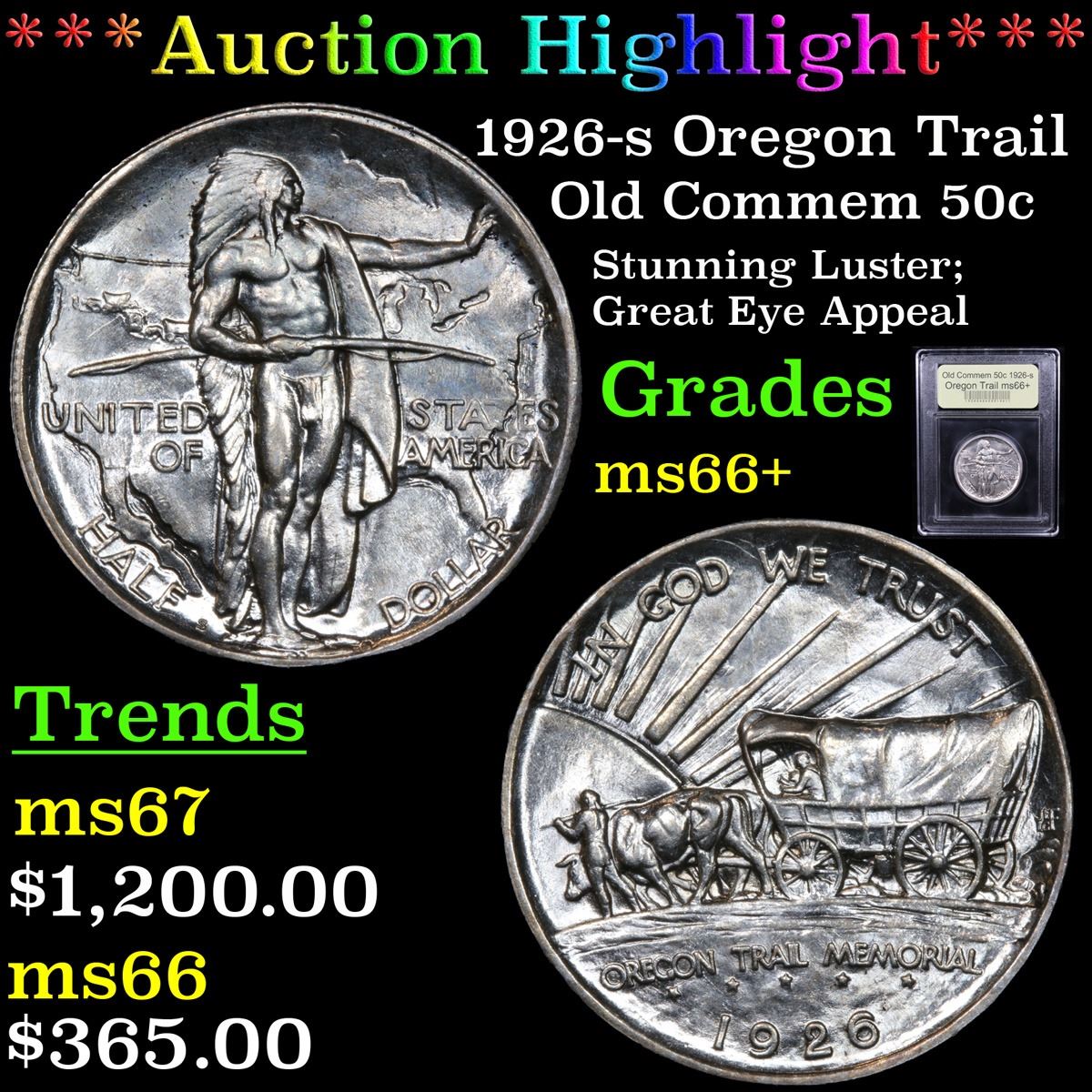 ***Auction Highlight*** 1926-s Oregon Trail Old Commem Half Dollar 50c Graded GEM++ Unc BY USCG. One of the most beautifully designed coins in American History, Designed by the same engraver that designed the Buffalo Nickel, This coin Commemorates the Oregon Trail that brought thousands of Intrepid pioneers to the West in the 1830's and 40's. When Buying an Oregon Trail Commemorative, regardless of year and mint the Points to first show wear are the Indian’s hand and thigh on the obverse and the ox and the bows of the wagon’s cover on the reverse, these are the high points. A Corey's Pick, Bid to Win, Don't let it get Away Coin