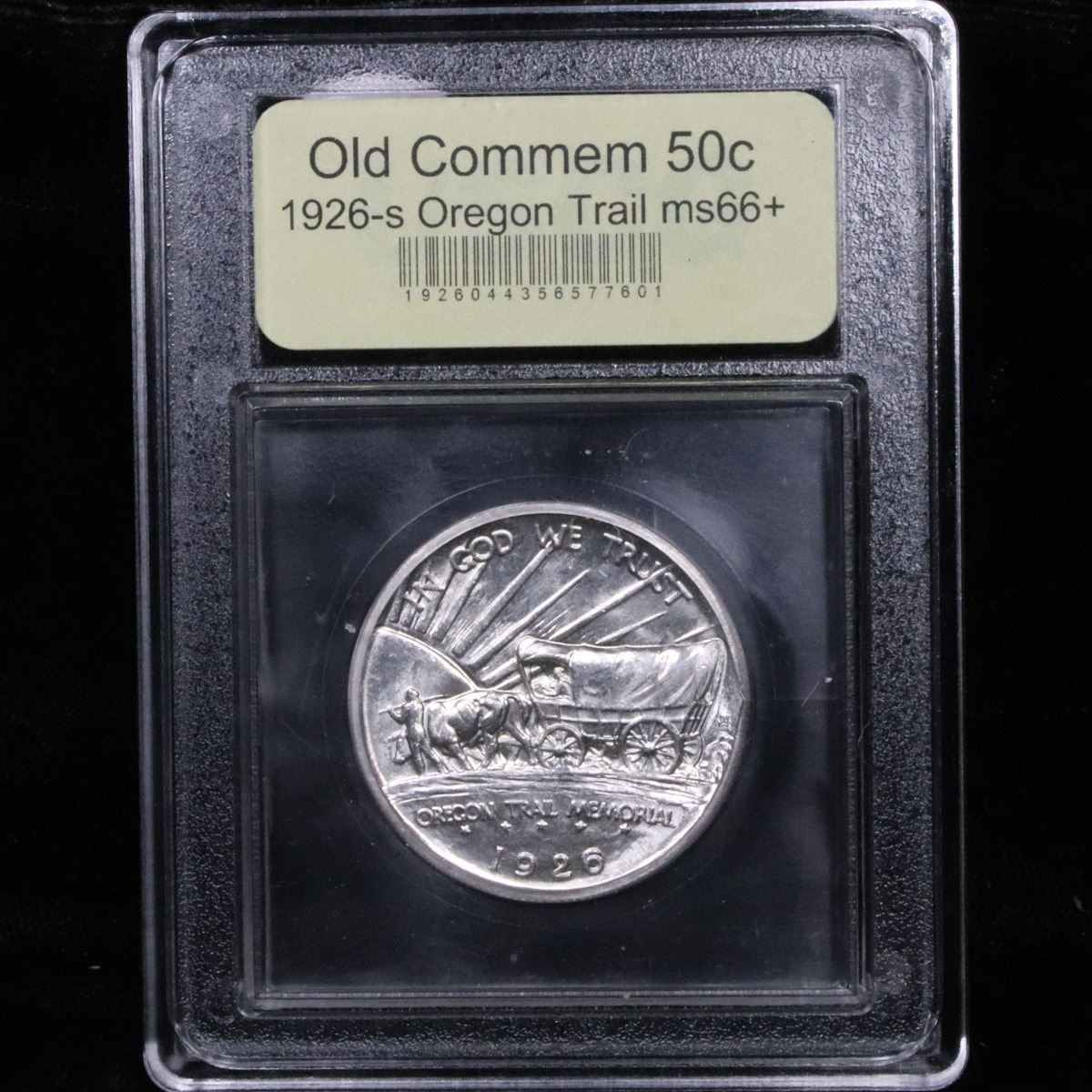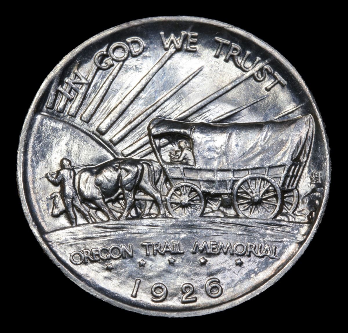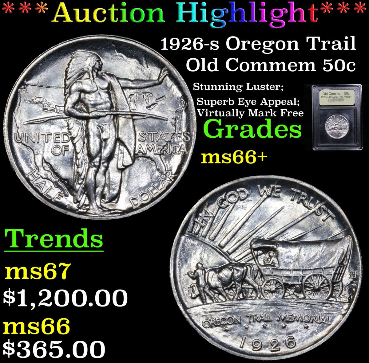 ***Auction Highlight*** 1926-s Oregon Trail Stunning Luster; Superb Eye Appeal; Virtually Mark Free Old Commem Half Dollar 50c Graded GEM++ Unc By USCG. One of the most beautifully designed coins in American History, Designed by the same engraver that designed the Buffalo Nickel, This coin Commemorates the Oregon Trail that brought thousands of Intrepid pioneers to the West in the 1830's and 40's. When Buying an Oregon Trail Commemorative, regardless of year and mint the Points to first show wear are the Indian’s hand and thigh on the obverse and the ox and the bows of the wagon’s cover on the reverse, these are the high points. A Corey's Pick, Bid to Win Coin