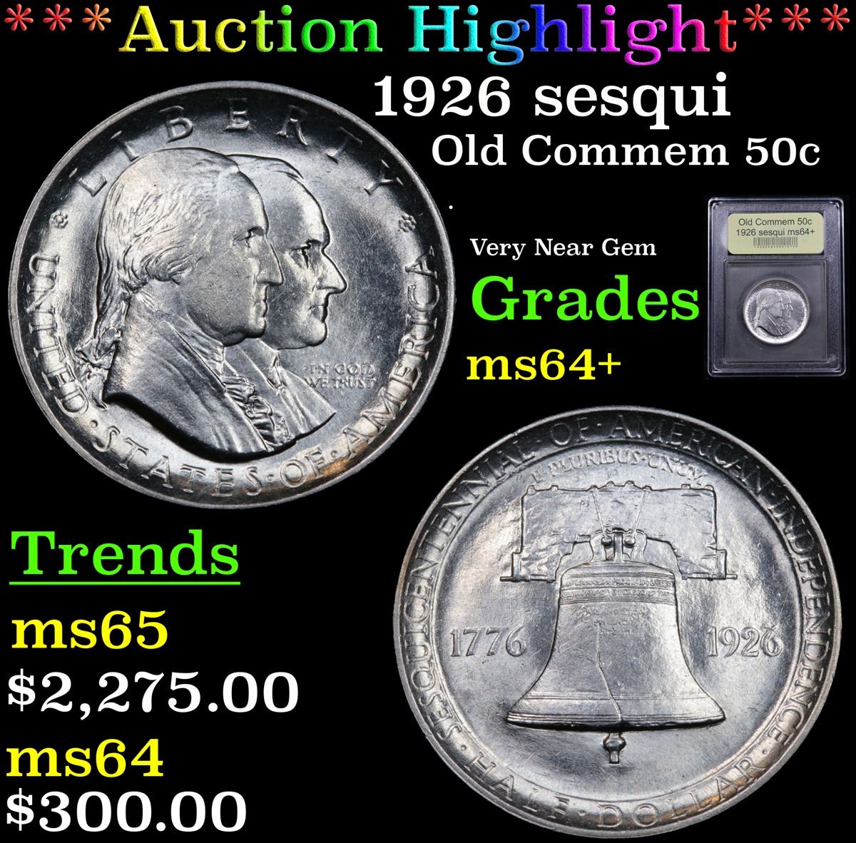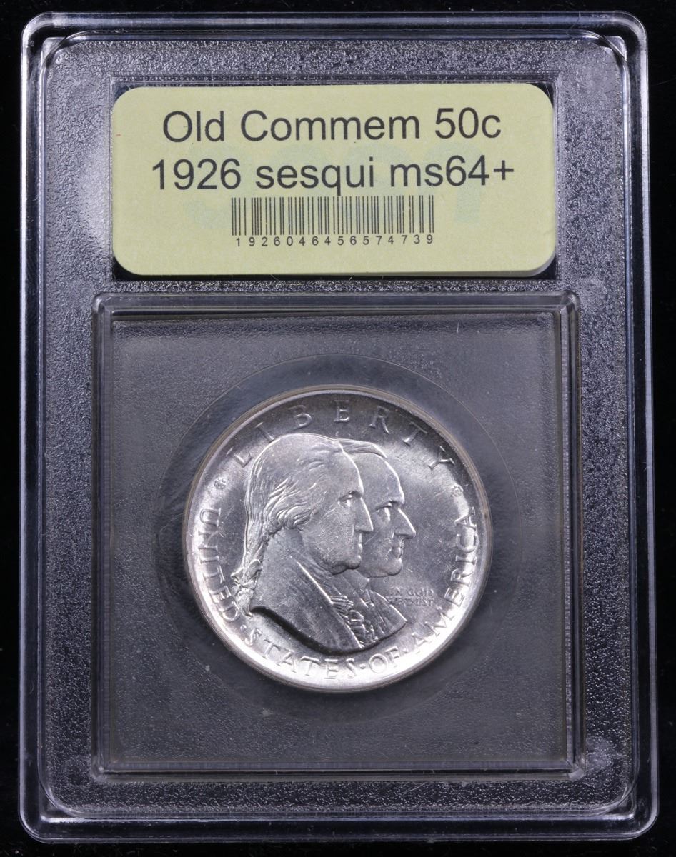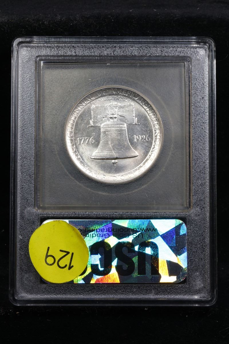 ***Auction Highlight*** 1926 sesqui Old Commem Half Dollar 50c Graded Choice+ Unc By USCG. This Coin is Very Reminiscent of The Reverse of the Franklin Half which would be Used 22 Years After this Coin was Struck. When Examining a Sesquicentennial Commemorative The first places to show wear on the coins are Washington's cheekbone and the lower part of the bell.