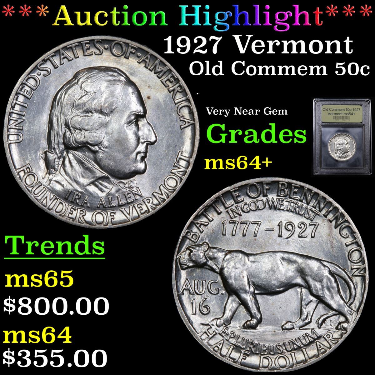 ***Auction Highlight*** 1927 Vermont Old Commem Half Dollar 50c Graded Choice+ Unc By USCG. This is a Very Scarce Commemorative. Most of the Original Mintage of 28,000 Pieces were Sold to Vermont Residents and Non-Numismatists and therefore were Improperly Handled and Many Show Wear. When Examining a Vermont Commemorative, Points to Check for Wear include Ira Allen’s Cheek and the Hair at his Temple; on the Reverse, Examine the Uppermost Part of the Cat’s Foreleg and its Hip. A Corey's Pick, Bid to Win Coin