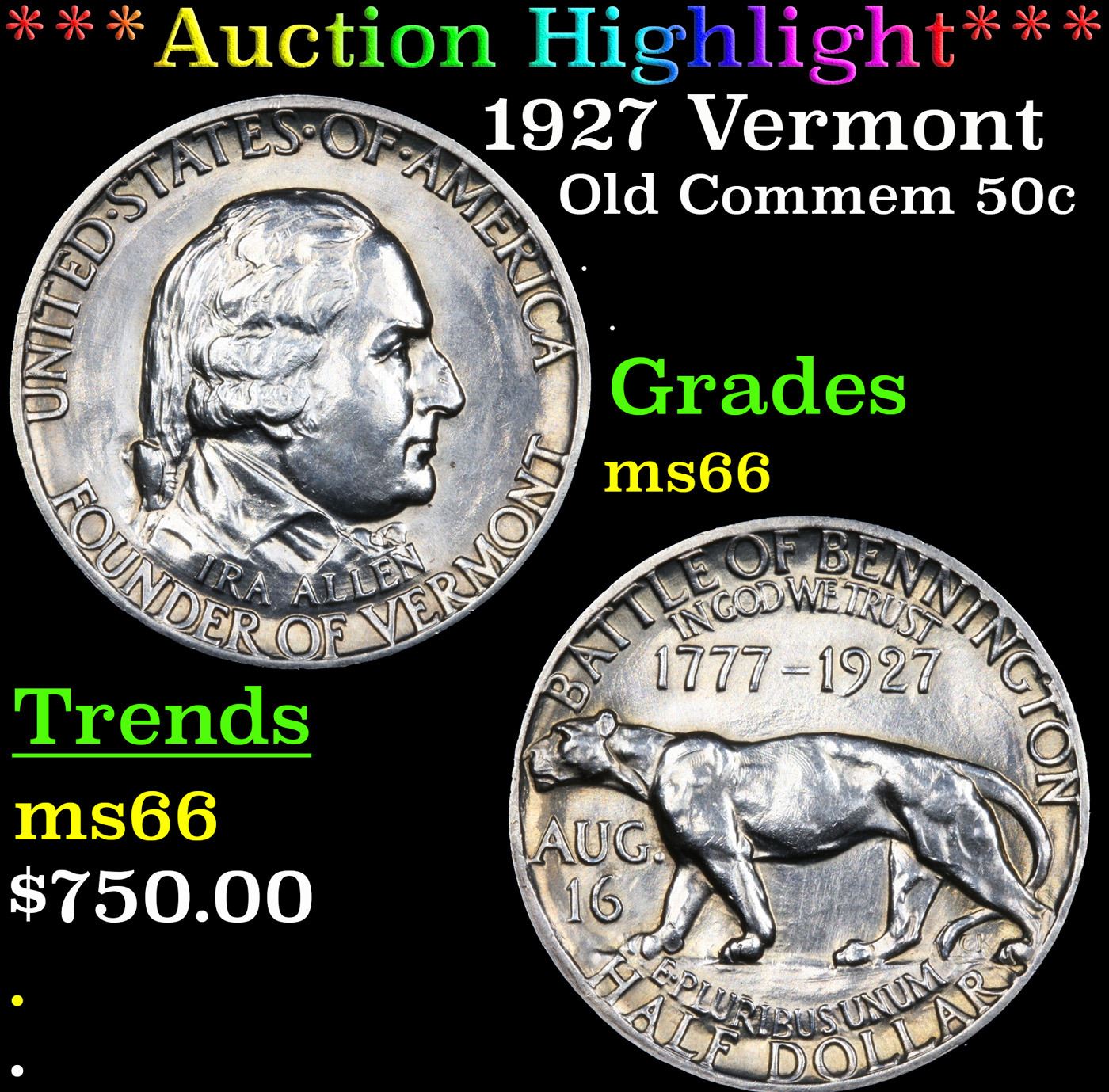 ***Auction Highlight*** 1927 Vermont Old Commem Half Dollar 50c Graded ms66 BY SEGS. The 1927 Vermont Sesquicentennial Half Dollar was issued to commemorate the 150th anniversary of the Battle of Bennington and the independence of Vermont. This occurred in 1777, and it was not until 1791 that Vermont would join the Union.Designs for the coin were by Charles Keck, who had earlier create the design for the Panama-Pacific Gold Dollar. His design for the 1927 Vermont Half Dollar was executed in the highest relief of any early commemorative half dollar issued. The obverse of the coin depicts Ira Allen, the founder of Vermont and one of the Green Mountain Boys, who would defeat the British at the Battle of Bennington.The design for the reverse of the coin was a point of contention for those involved in the design process. Other possibilities had included an image of the Bennington Monument obelisk and an image of the Catamount Tavern where the Green Mountain Boys would meet. It was eventually decided that the image of a catamount would represent be more appropriate as a representation of the tavern. The original issue price for the Vermont Sesquicentennial Half Dollar was $1, with sales conducted by the Bennington Battle Monument and Historical Association. Out of the maximum authorized mintage of 40,000 pieces, a total of 28,142 were distributed and the rest were returned to the Mint for melting. Most of the Mintage were Sold to Vermont Residents and Non-Numismatists and therefore were Improperly Handled and Many Show Wear. When Examining a Vermont Commemorative, Points to Check for Wear include Ira Allen’s Cheek and the Hair at his Temple; on the Reverse, Examine the Uppermost Part of the Cat’s Foreleg and its Hip. A Key Date's Pick, Bid to Win, Don't let it get Away Coin