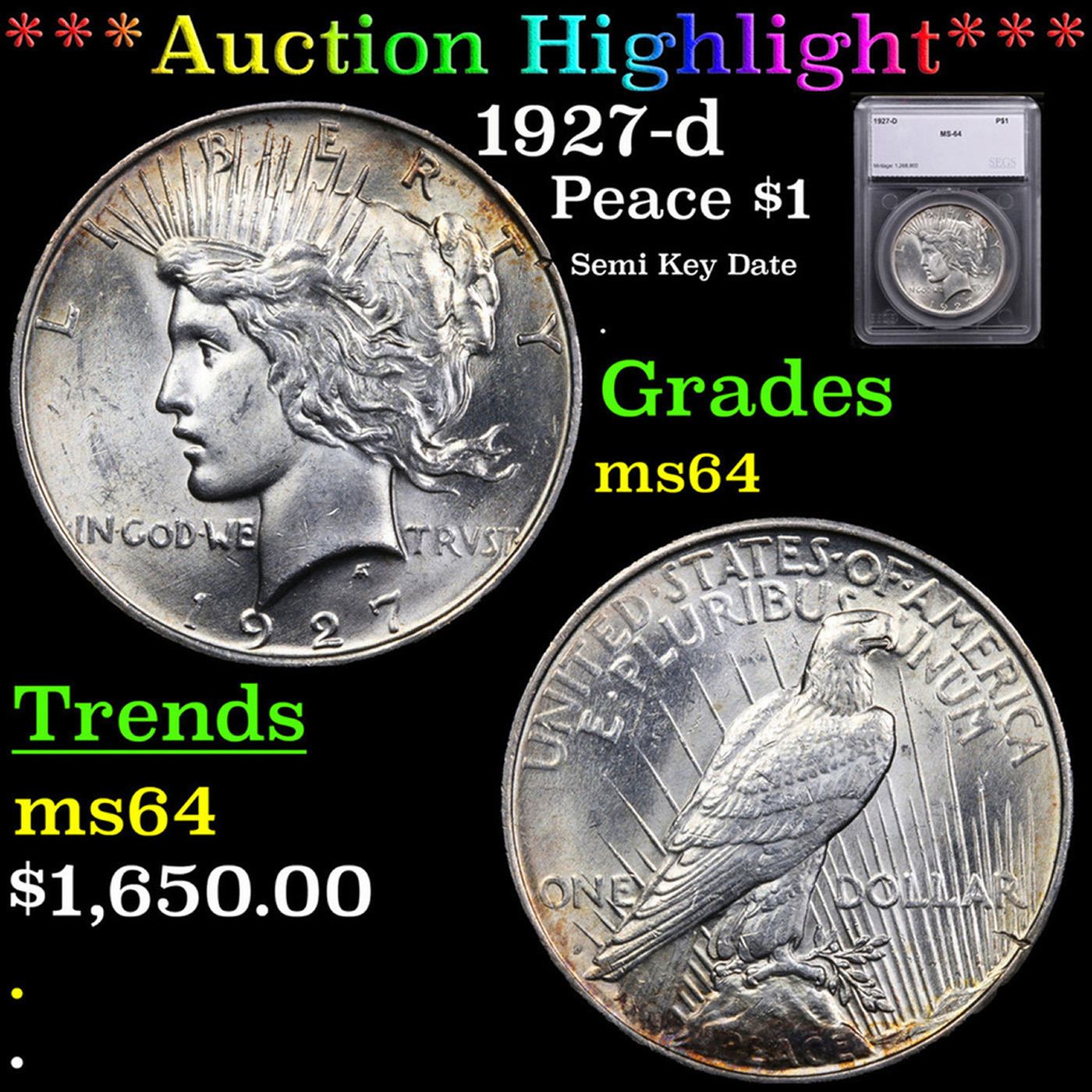 ***Auction Highlight*** 1927-d Peace Dollar $1 Graded ms64 By SEGS.
