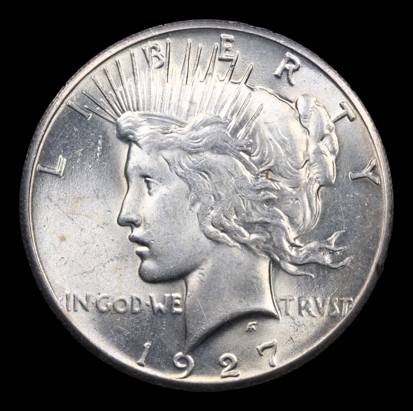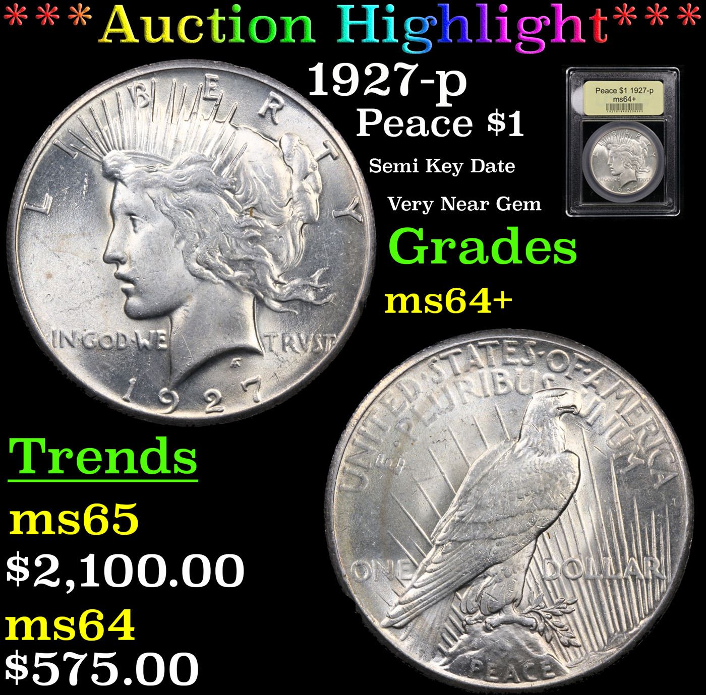 ***Auction Highlight*** 1927-p Peace Dollar $1 Graded Choice+ Unc BY USCG. The 27-p is the big sleeper of numismatics in my opinion. It has the 2nd lowest mintage in the whole Peace dollar series. Lower than the 34-s, the 21-p, yet it does not command its proper value. Good coin to own multiple of and save, in my opinion, but if you've been coming to our auctions for a while you will have seen that this has always been my opinion.