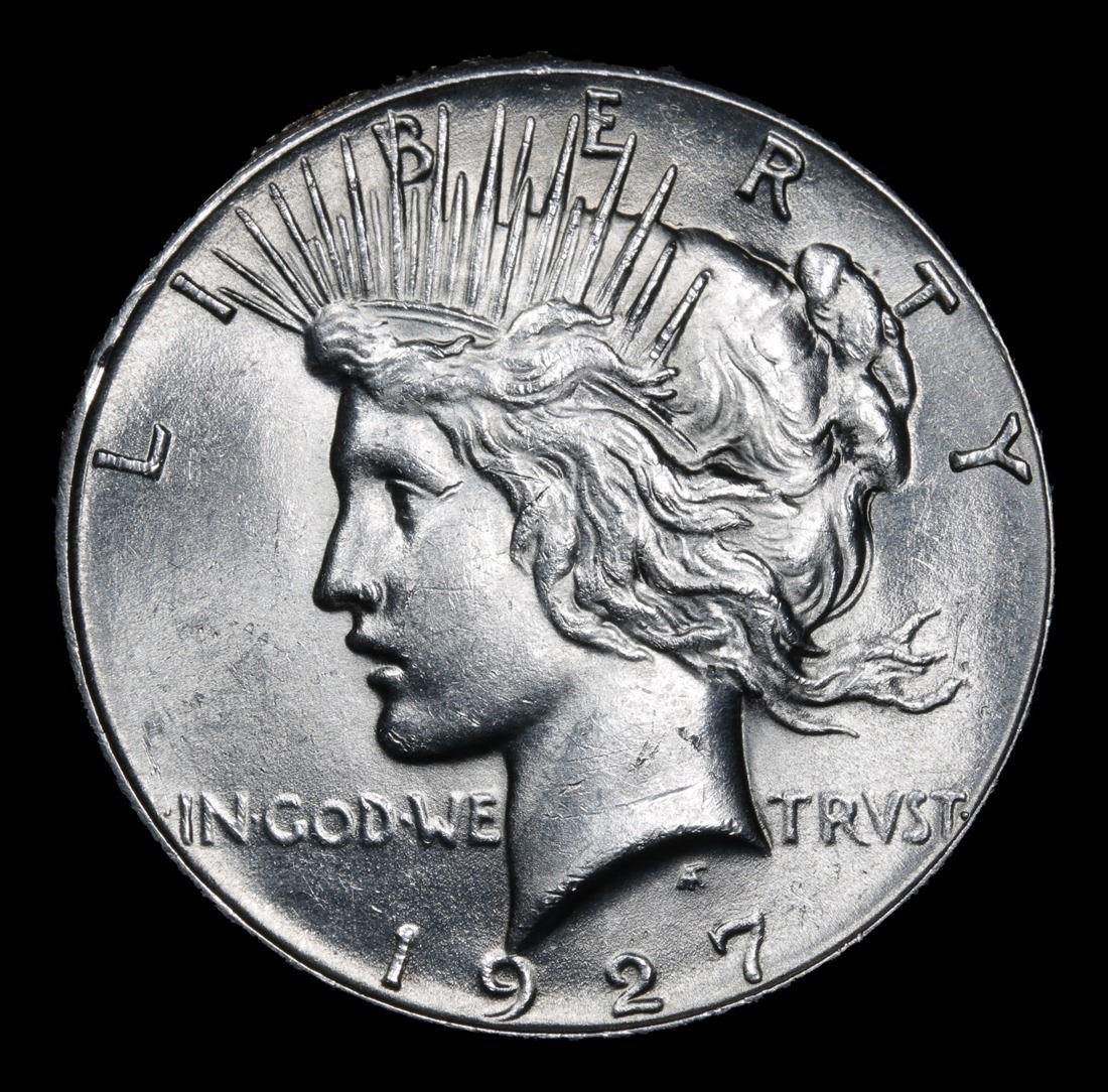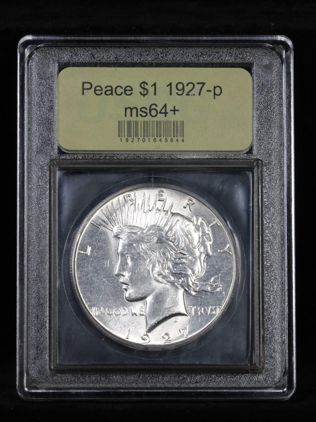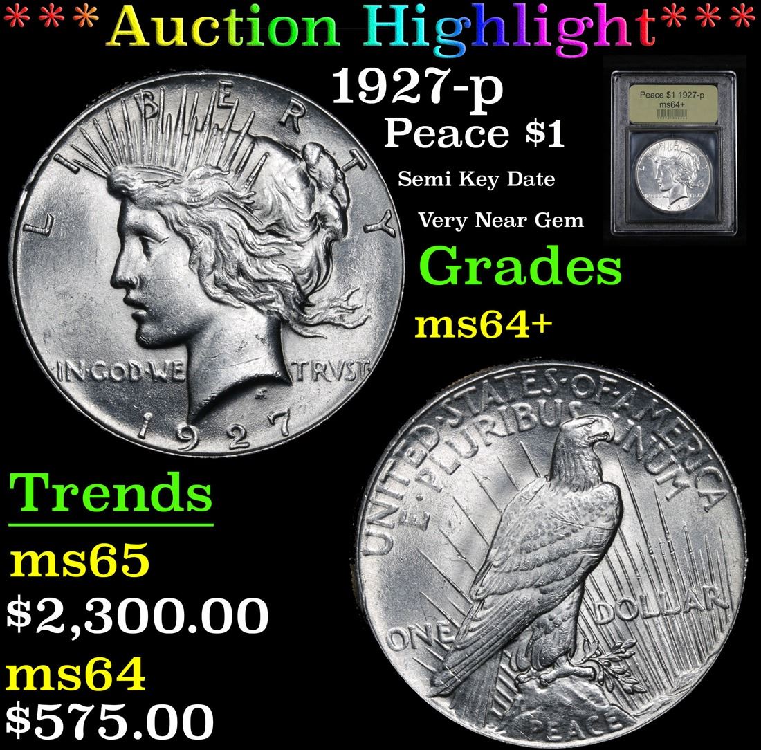 ***Auction Highlight*** 1927-p Peace Dollar $1 Graded Choice+ Unc By USCG. Semi Key Date Very Near Gem The 27-p is the big sleeper of numismatics in my opinion. It has the 2nd lowest mintage in the whole Peace dollar series. Lower than the 34-s, the 21-p, yet it does not command its proper value. Good coin to own multiple of and save, in my opinion, but if you've been coming to our auctions for a while you will have seen that this has always been my opinion. A Corey's Pick, Bid to Win Coin