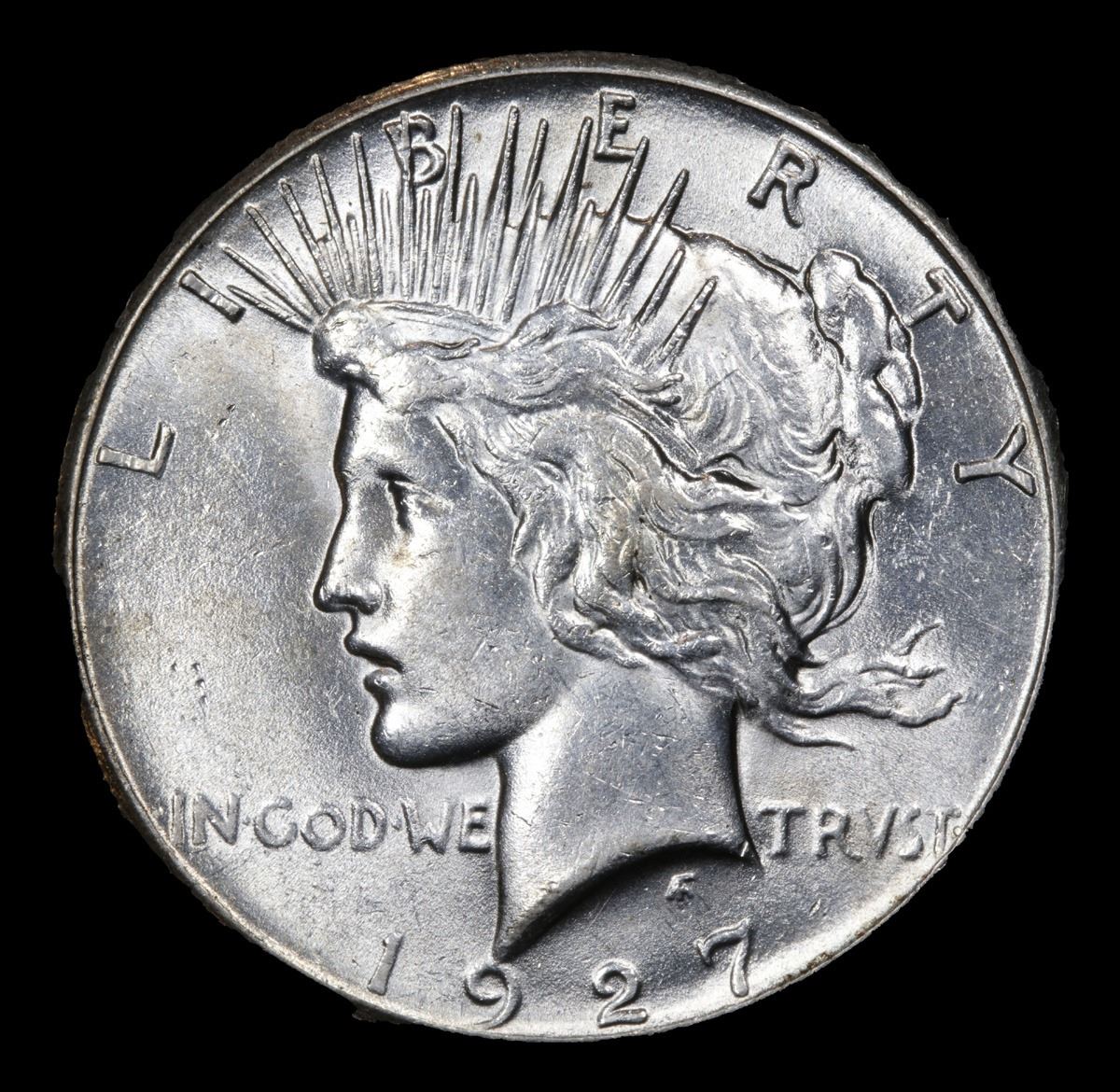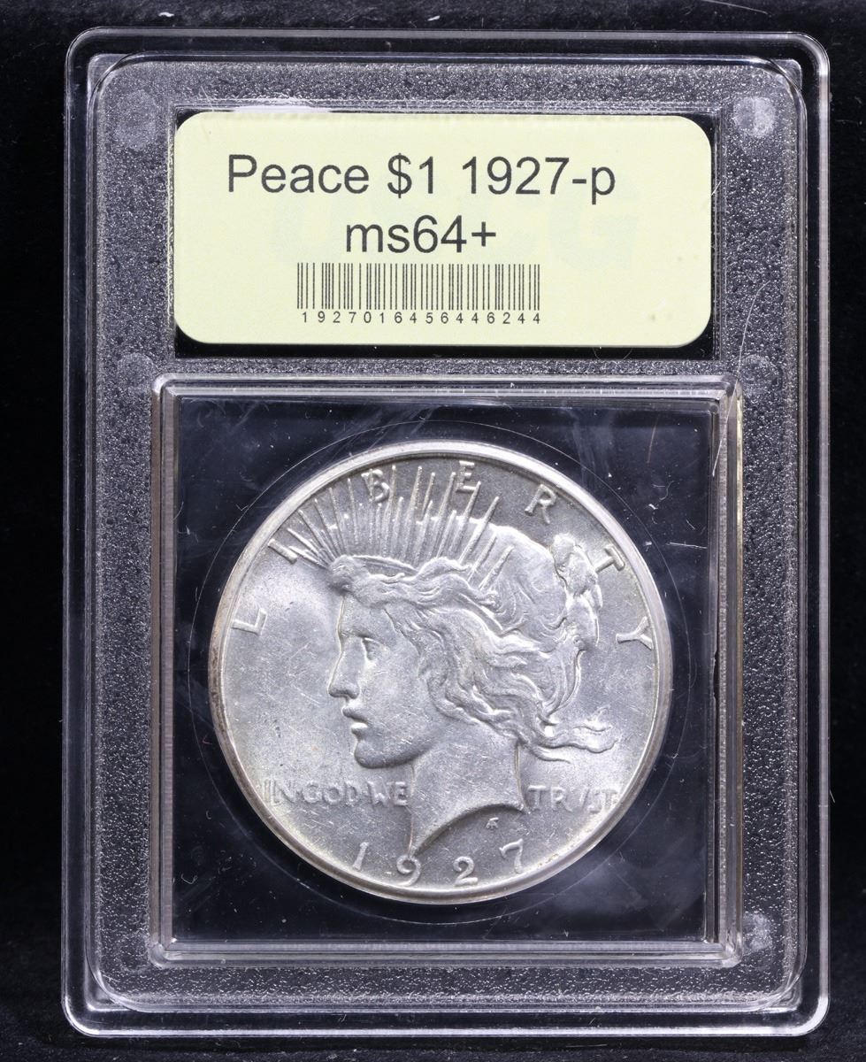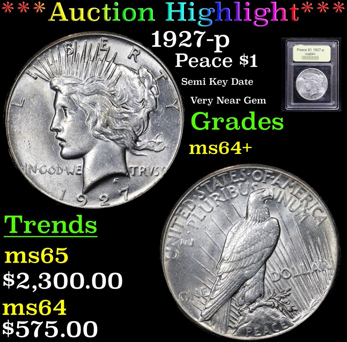 ***Auction Highlight*** 1927-p Semi Key Date Very Near Gem Peace Dollar $1 Graded Choice+ Unc By USCG. The 27-p is the big sleeper of numismatics in my opinion. It has the 2nd lowest mintage in the whole Peace dollar series. Lower than the 34-s, the 21-p, yet it does not command its proper value. Good coin to own multiple of and save, in my opinion, but if you've been coming to our auctions for a while you will have seen that this has always been my opinion. A Corey's Pick, Bid to Win, Don't let it get Away Coin