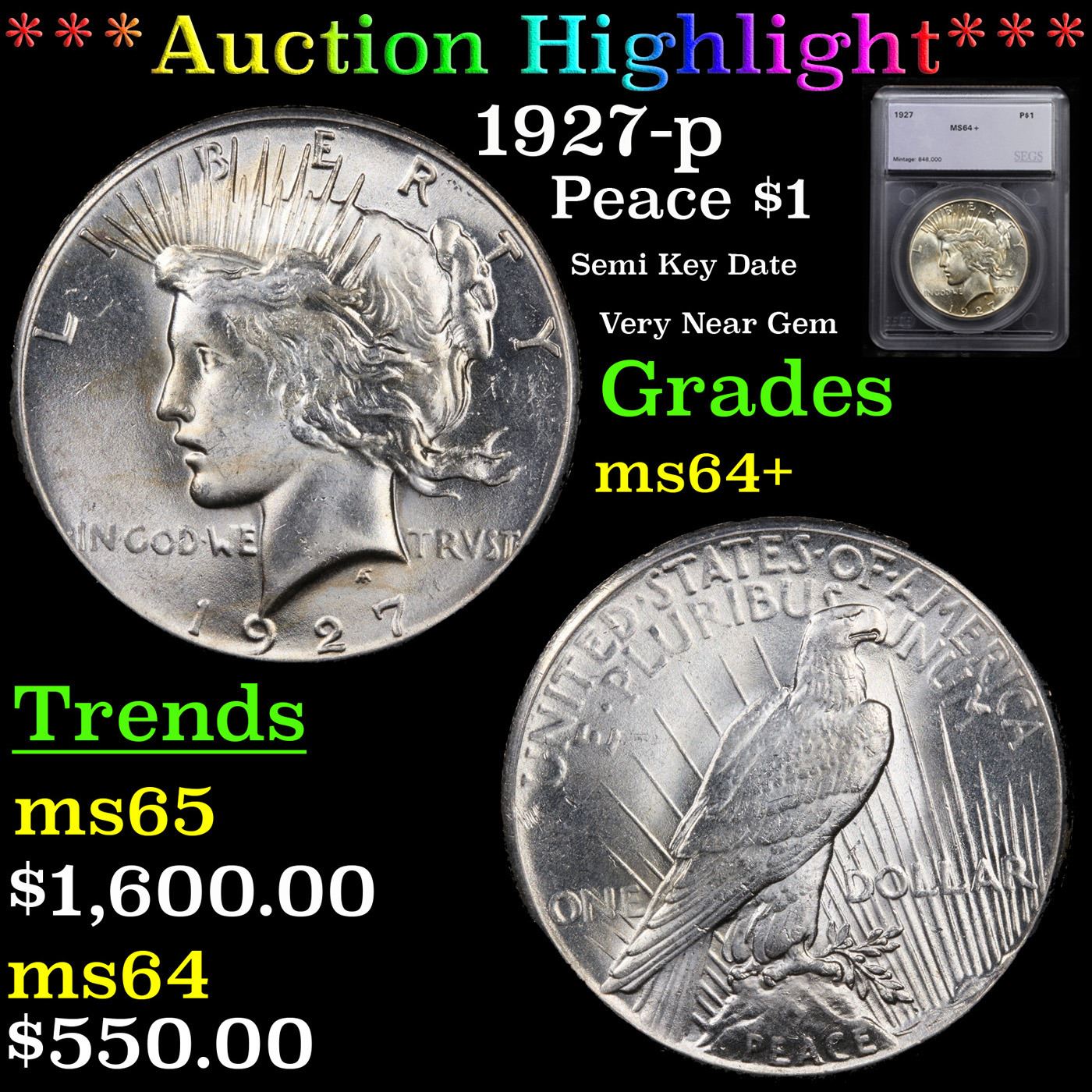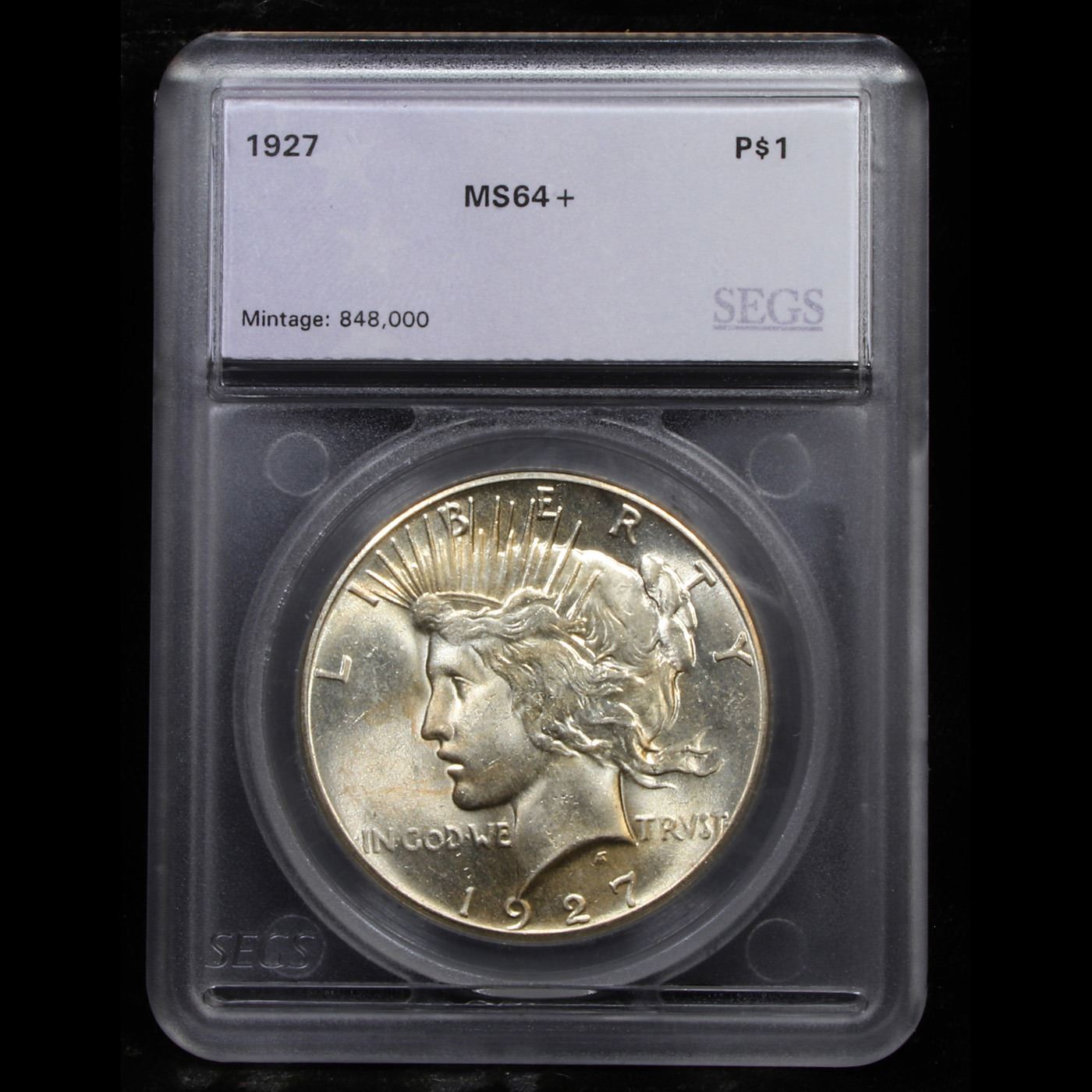 ***Auction Highlight*** 1927-p Peace Dollar $1 Graded ms64+ By SEGS.  The 27-p is the big sleeper of numismatics in my opinion.  It has the 2nd lowest mintage in the whole Peace dollar series.  Lower than the 34-s, the 21-p, yet it does not command its proper value.  Good coin to own multiple of and save, in my opinion, but if you've been coming to our auctions for a while you will have seen that this has always been my opinion.        A Corey's Pick, Bid to Win Coin