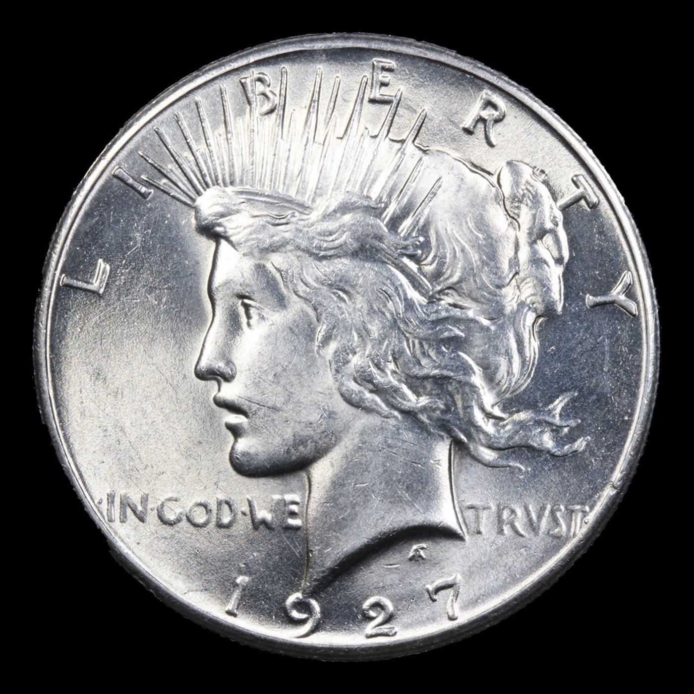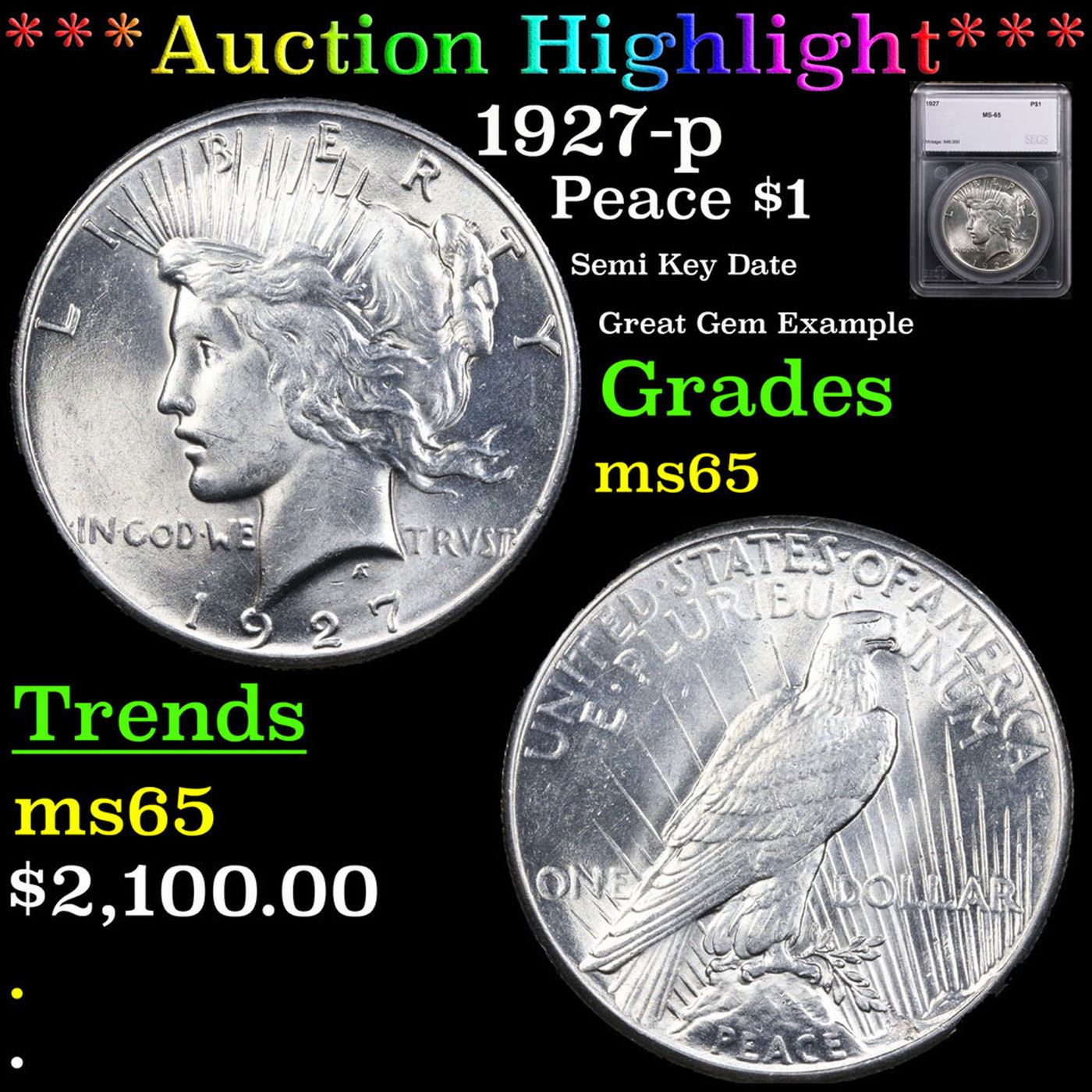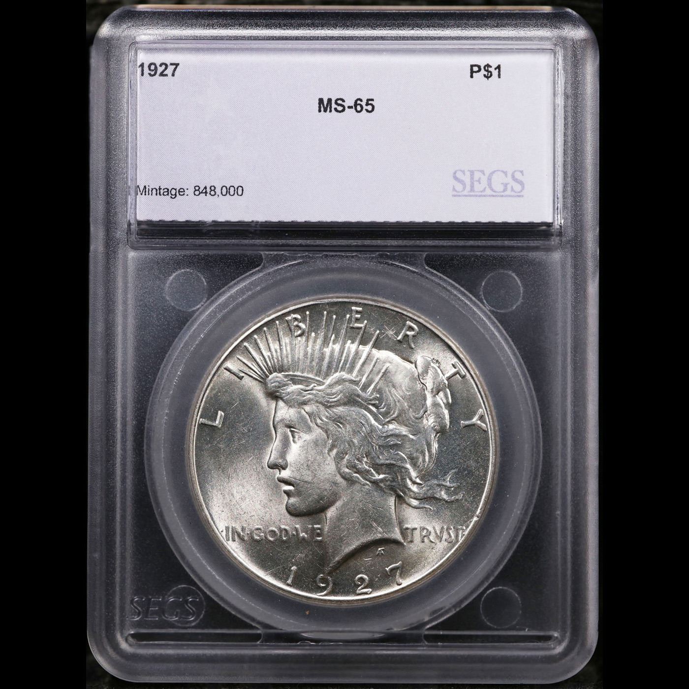 ***Auction Highlight*** 1927-p Peace Dollar $1 Graded ms65 By SEGS. The 27-p is the big sleeper of numismatics in my opinion. It has the 2nd lowest mintage in the whole Peace dollar series. Lower than the 34-s, the 21-p, yet it does not command its proper value. Good coin to own multiple of and save, in my opinion, but if you've been coming to our auctions for a while you will have seen that this has always been my opinion.