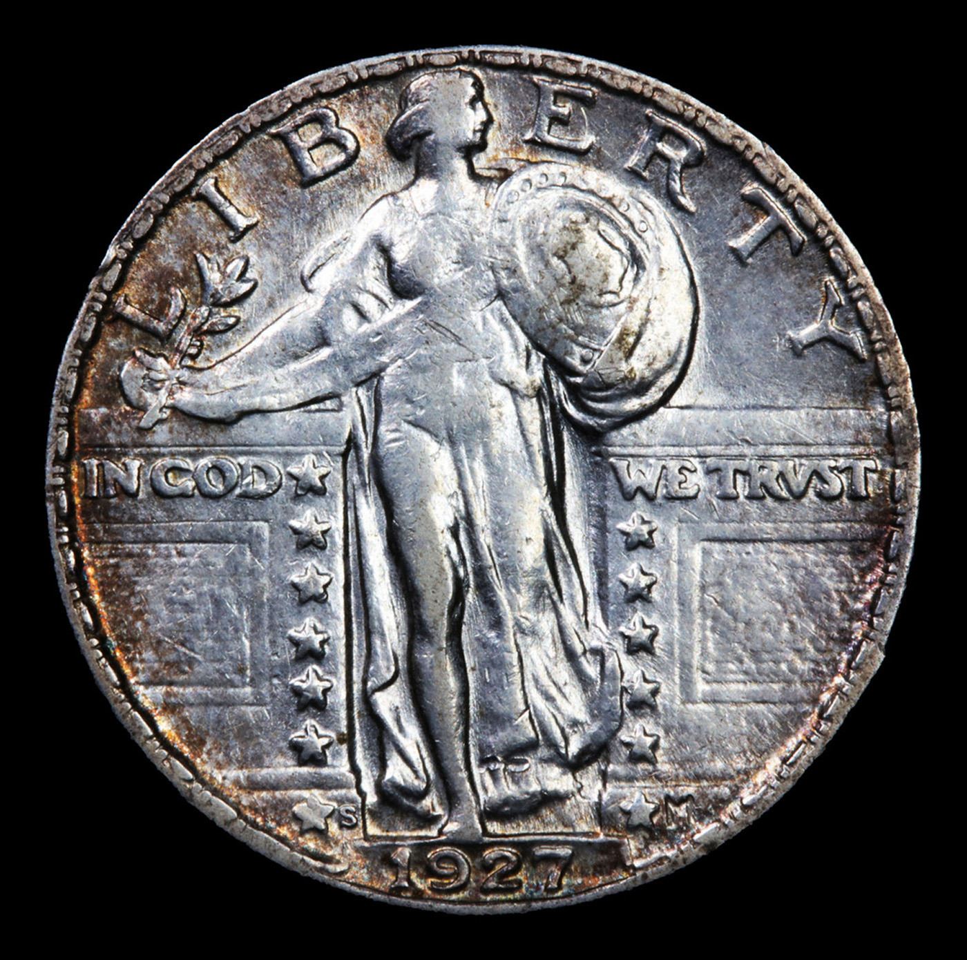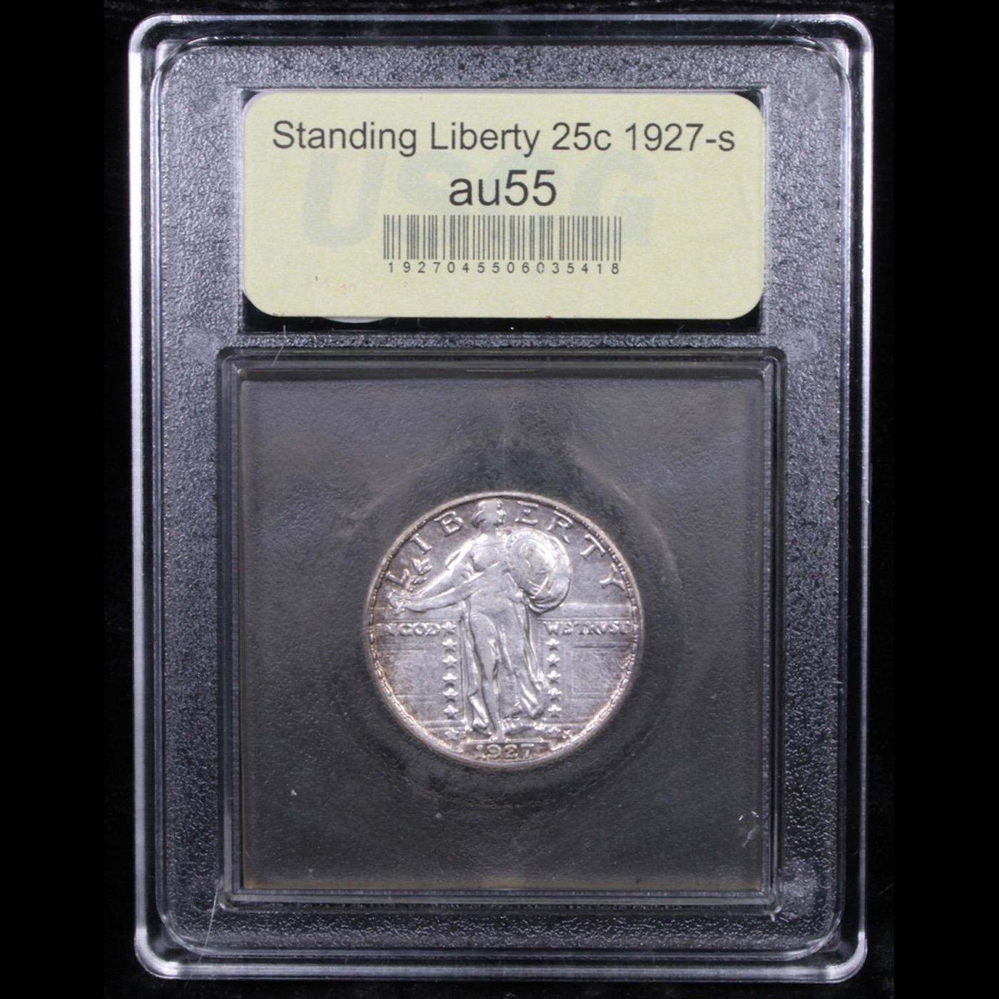***Auction Highlight*** 1927-s Standing Liberty Quarter 25c Graded Choice AU By USCG. The 1927-S quarter is the lowest mintage (by a large margin) Type 2 Standing Liberty quarter. In fact, it is the second lowest mintage of the entire series as only the very rare 1916 had a lower mintage. This issue is very interesting in terms of the distribution of grades of the survivors. Basically, 95 percent or more of the survivors grade AG03 to GD06. VG, Fine, VF, and EX examples are really rare. And, of course, choice AU examples are incredibly rare and highly sought. The attractive example at hand has the vast majority of original mint luster remaining and just a bit of wear at the very high points. It is very attractive with gold and russet rim toning covering both obverse and reverse. This choice AU Example is sure to please. I have included a pcgs graded au55 for comparison, I think you'll agree ours shows similar wear at the high points and is accurately graded. A Corey's Pick, Bid to Win, Don't let it get Away, you might not find its equal Coin