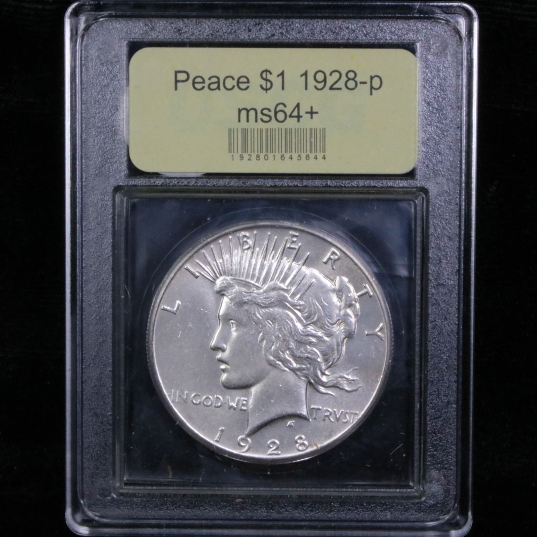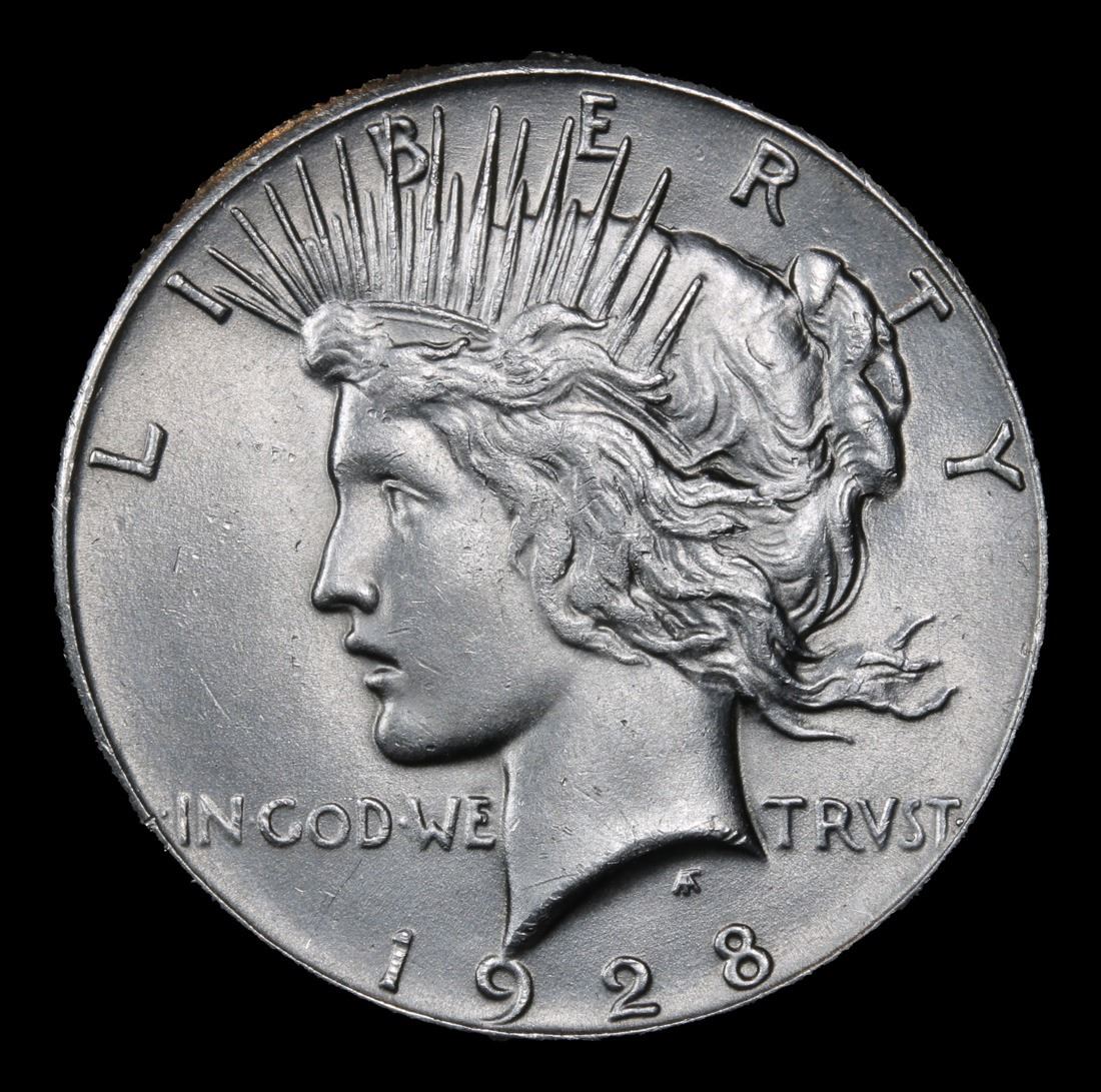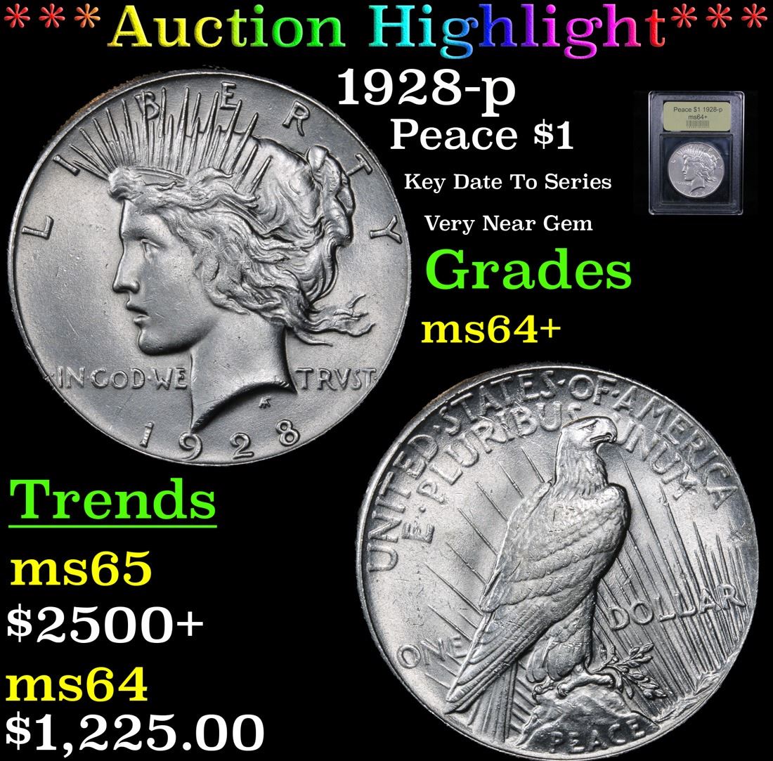 ***Auction Highlight*** 1928-p Key Date To Series Very Near Gem Peace Dollar $1 Graded Choice+ Unc By USCG. Incredibly scarce date, lowest mintage in the entire Peace Dollar Series. Scarce in all grades. A Corey's Pick, Bid to Win, Don't let it get Away Coin