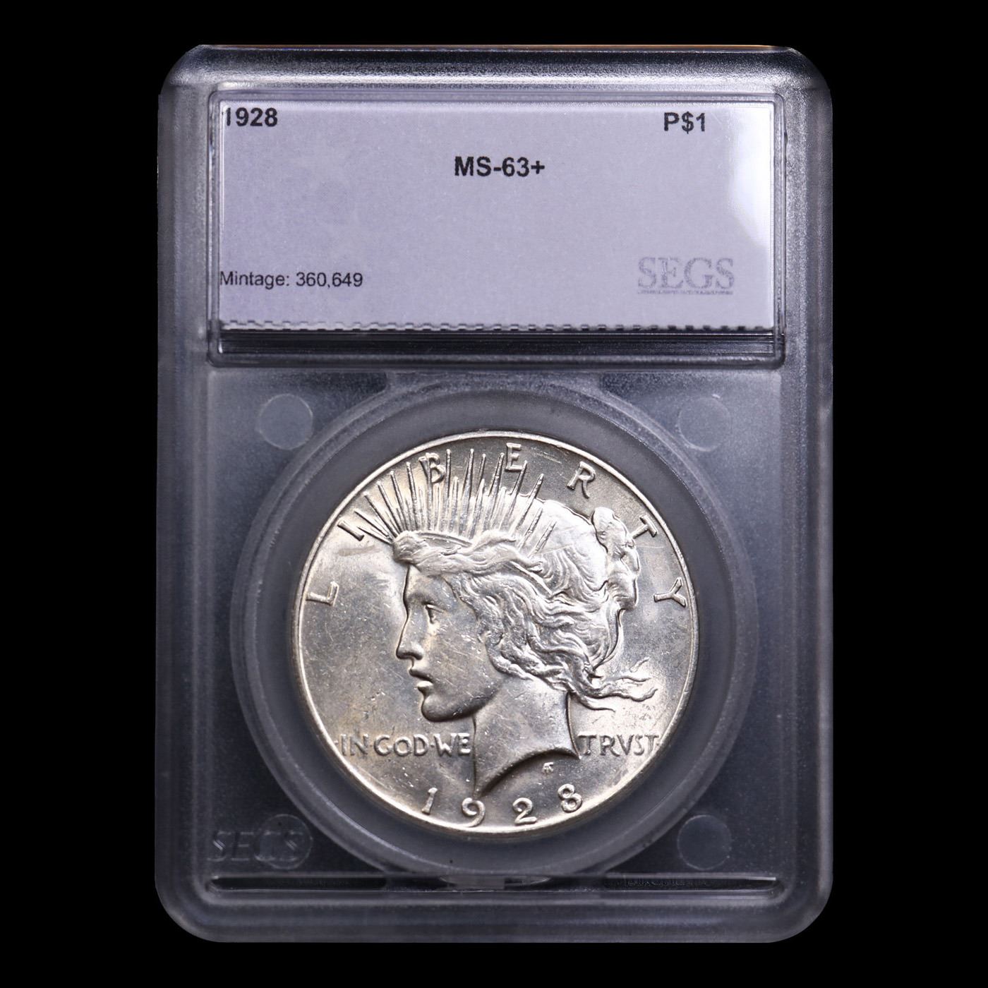 ***Auction Highlight*** 1928-p Peace Dollar $1 Graded ms63+ BY SEGS. Incredibly scarce date, lowest mintage in the entire Peace Dollar Series. Scarce in all grades.