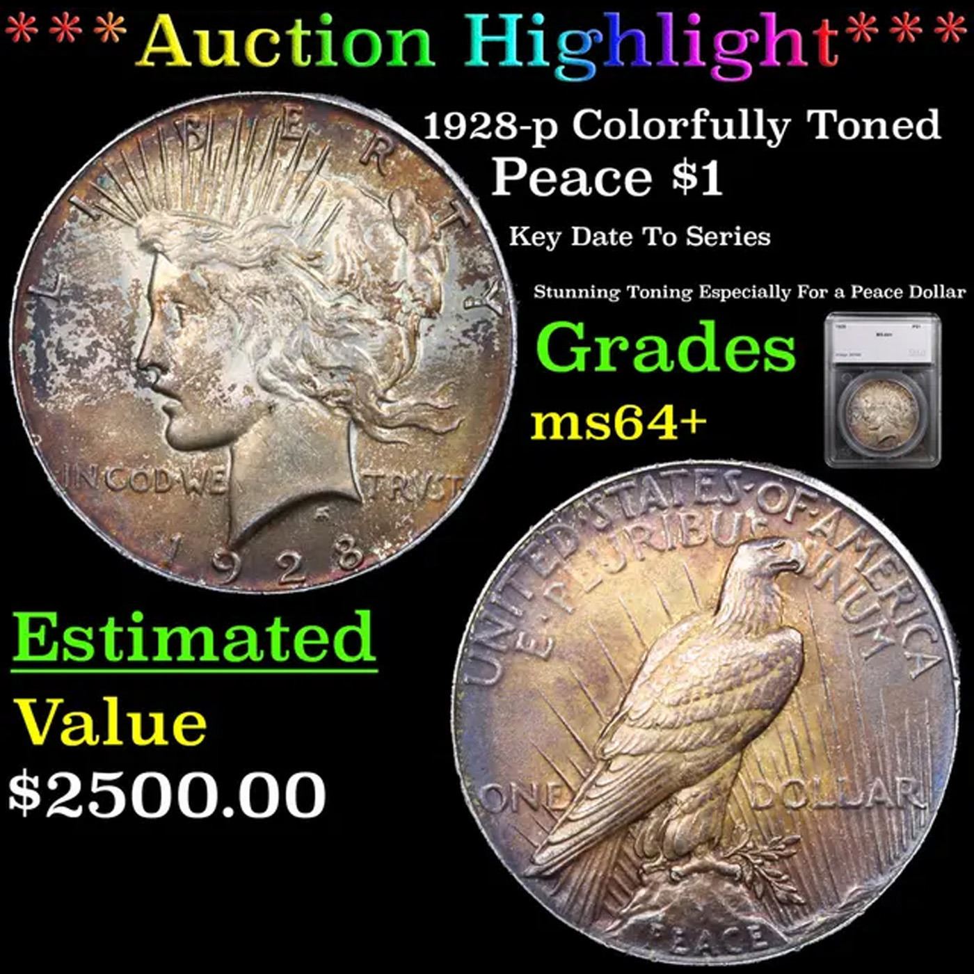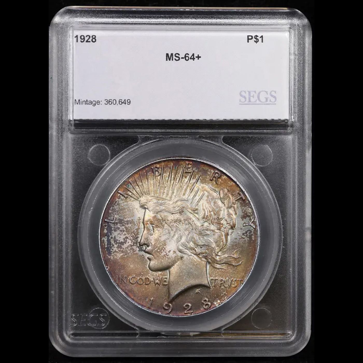 ***Auction Highlight*** 1928-p Colorfully Toned Peace Dollar $1 Graded ms64+ By SEGS. Incredibly scarce date, lowest mintage in the entire Peace Dollar Series. Scarce in all grades. A Key Date's Pick, Bid to Win, Don't let it get Away, you might not find its equal Coin. I give this coin my highest recommendation