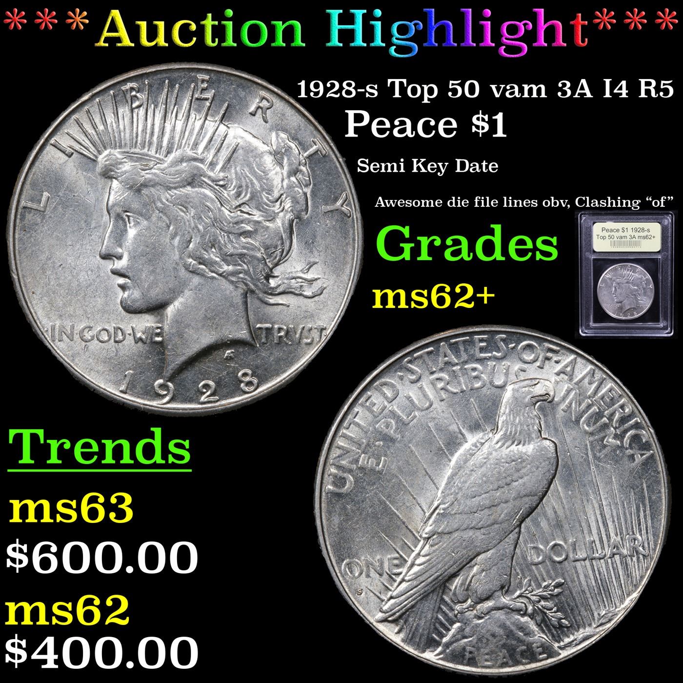 ***Auction Highlight*** 1928-s Top 50 vam 3A I4 R5 Peace Dollar $1 Graded Select Unc By USCG.