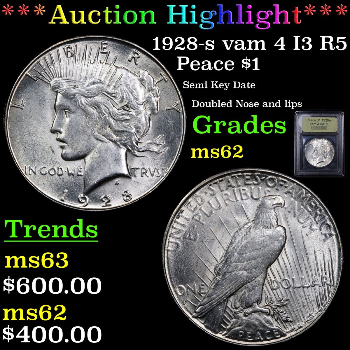 ***Auction Highlight*** 1928-s vam 4 I3 R5 Peace Dollar $1 Graded Select Unc By USCG. A Corey's Pick, Bid to Win Coin