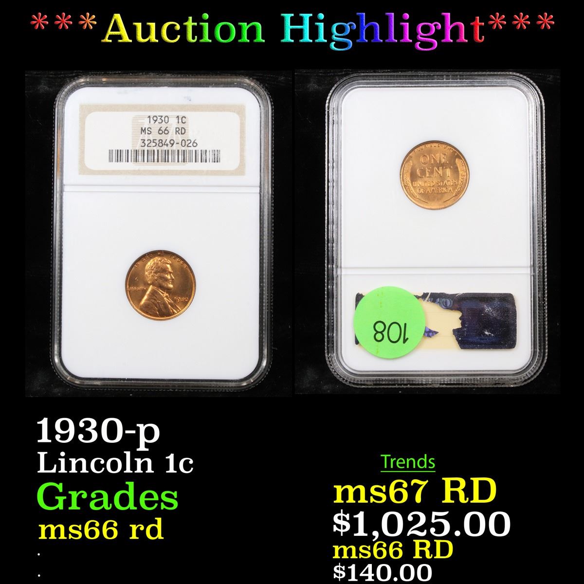 ***Auction Highlight*** 1930-p Lincoln Cent 1c Graded ms66 rd By NGC. 0