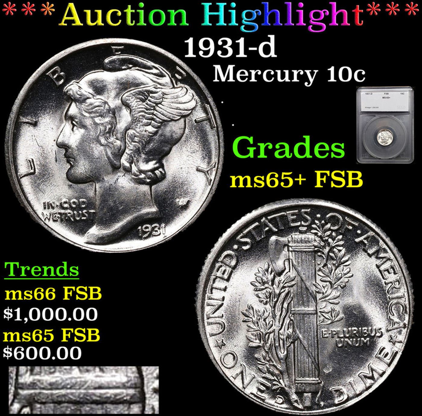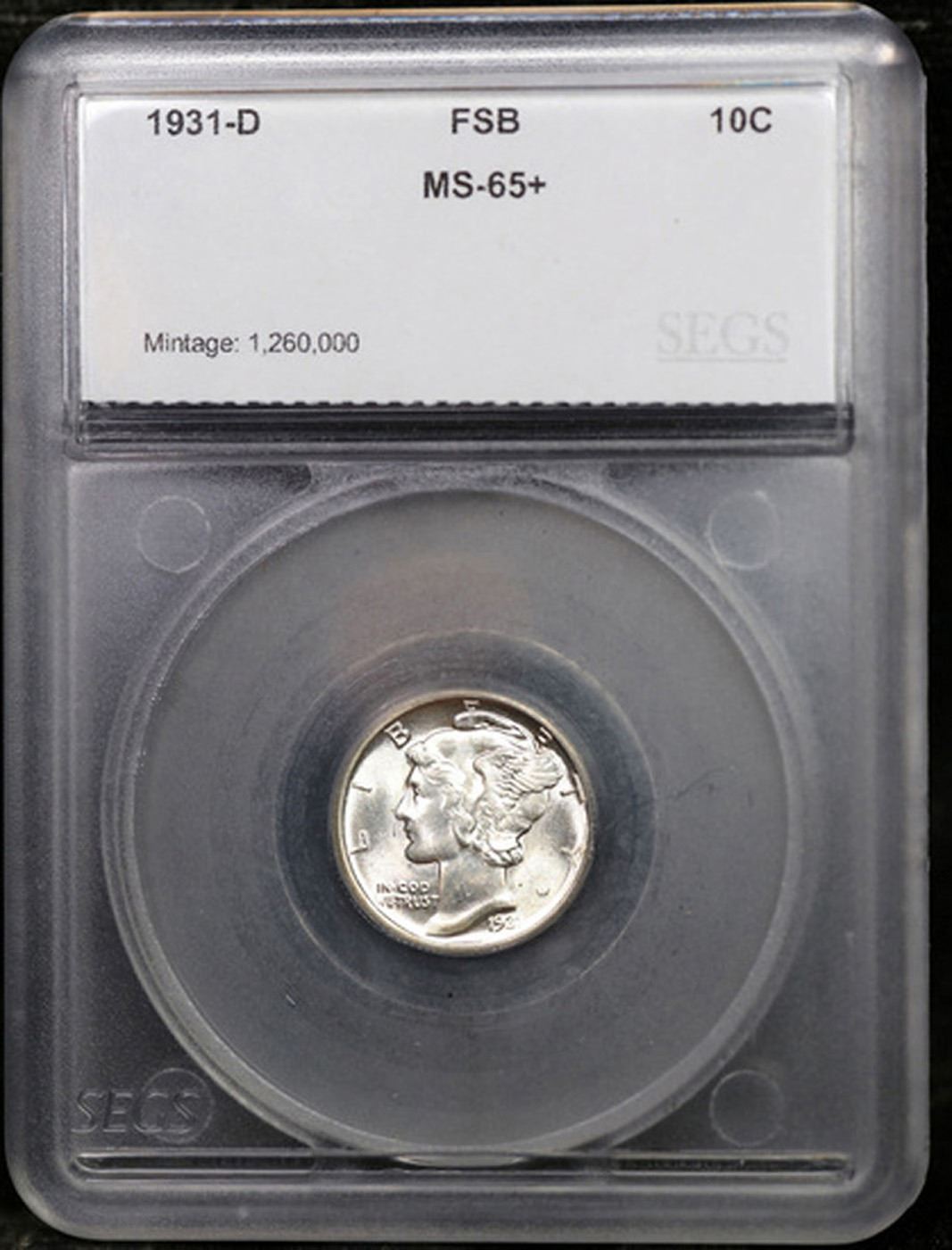 ***Auction Highlight*** 1931-d Mercury Dime 10c Graded ms65+ FSB By SEGS.