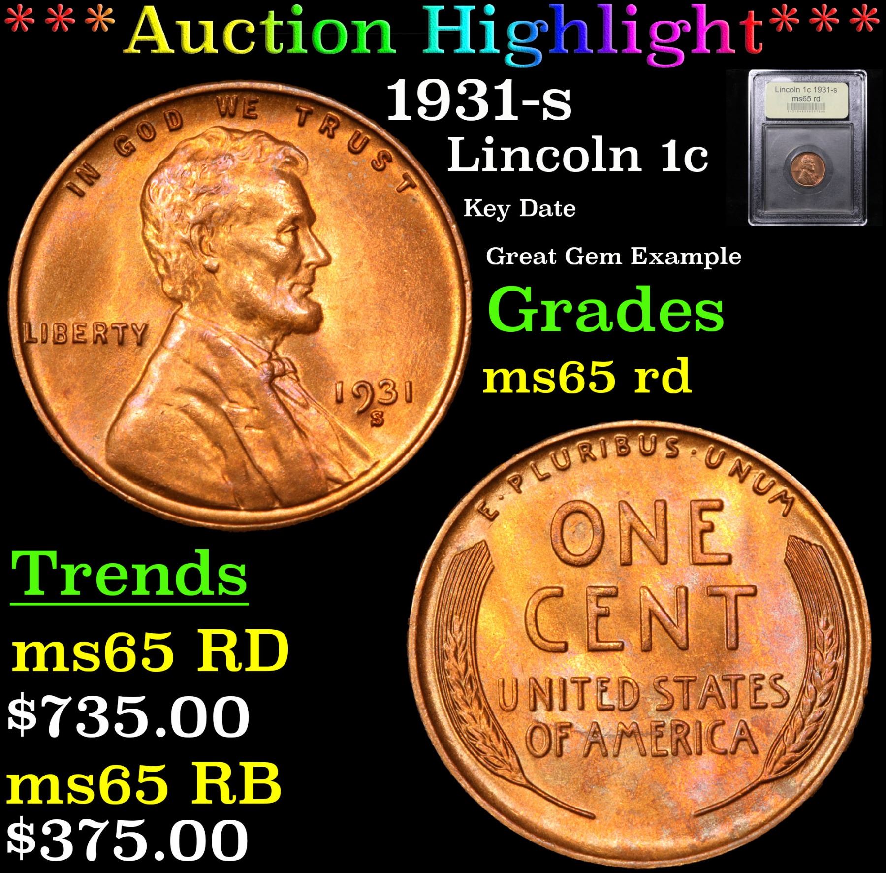 ***Auction Highlight*** 1931-s Key Date Great Gem Example Lincoln Cent 1c Graded GEM Unc RD By USCG. Incredibly scarce, Semi Key date. A Corey's Pick, Bid to Win Coin