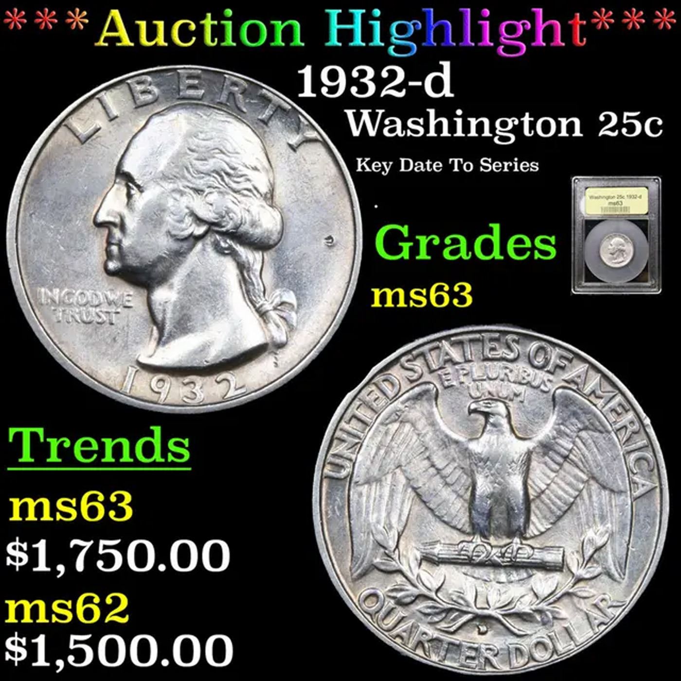 ***Auction Highlight*** 1932-d Washington Quarter 25c Graded Select Unc BY USCG. According to David Hall, from PCGS The 1932-D is by far the rarest of the Washington quarters. There are only two Washington quarters with mintages of under one million coins. The 1932-D has an original mintage of 436,800. This coin has been highly sought after in all grades for the past 60 years. This is one of the key dates of the Washington quarter series and one of the better known rare coins of the twentieth century. Very scarce Key Date. This is the key date to the seies, even more scarce than the 1932-s. Scarce in all grades. A Key Date's Pick, Bid to Win, Don't let it get Away Coin